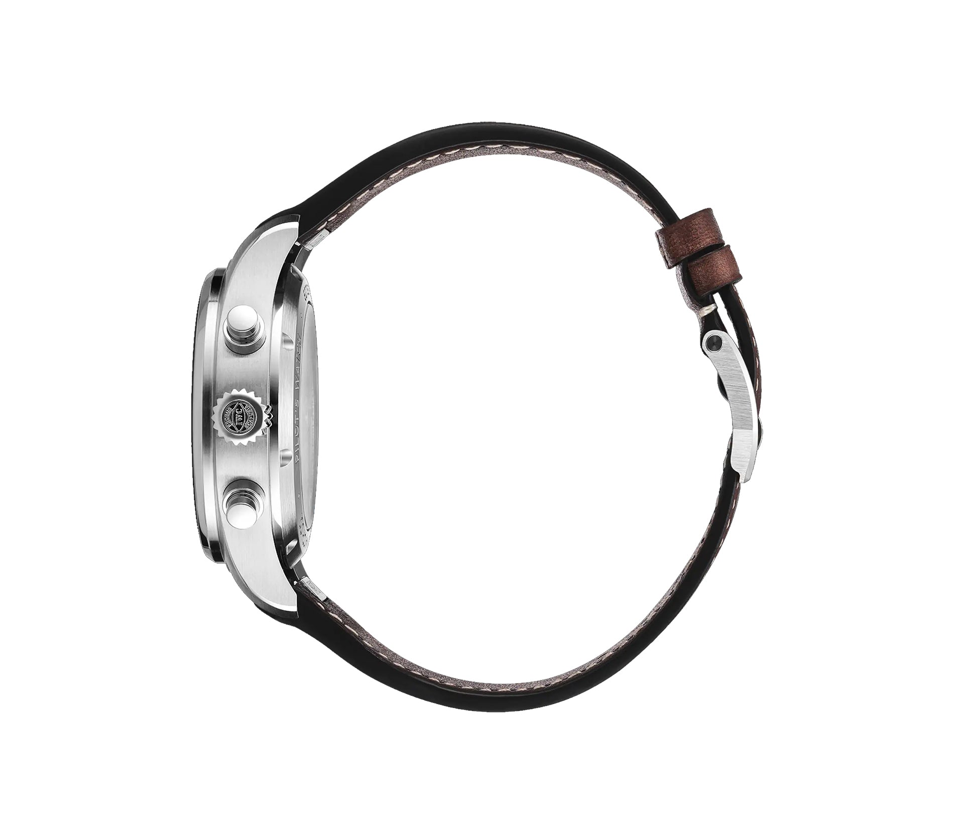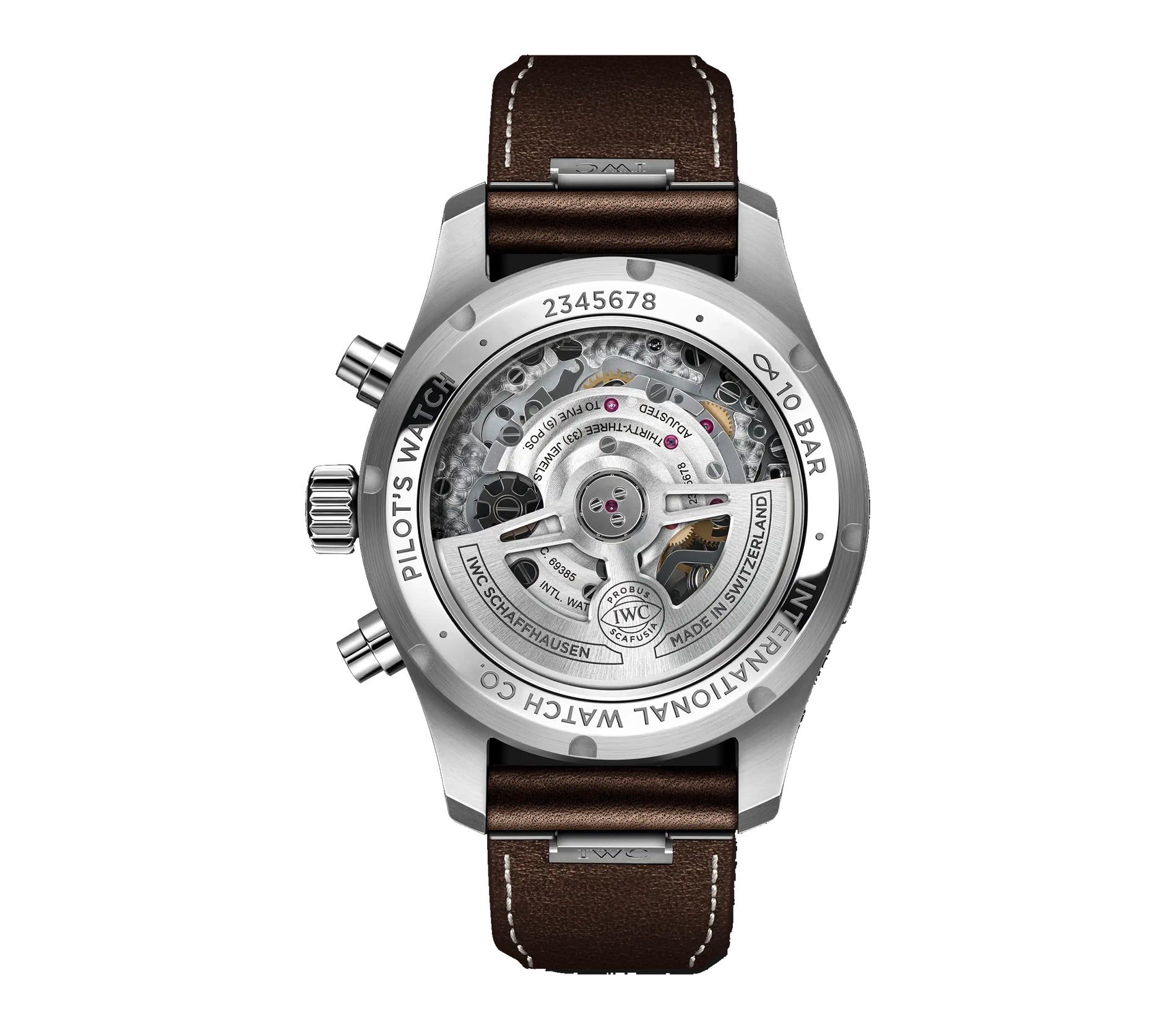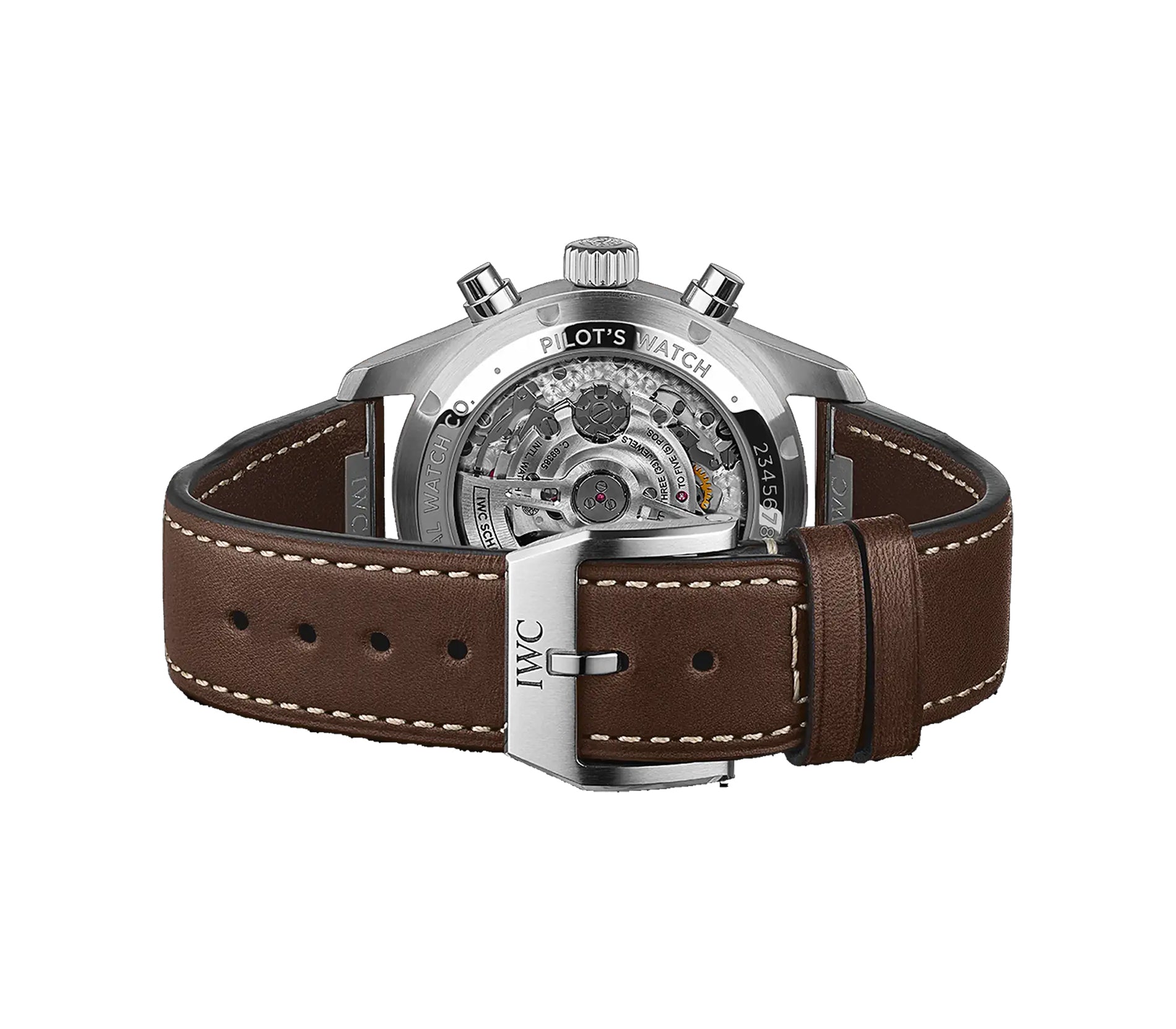 The case consists of mostly brush-finished stainless steel with hints of mirror finished stainless steel here and there and is equipped with a see through sapphire glass back. Mounted on the watch is a IWC brown leather strap equipped with a IWC stainless steel tang buckle.