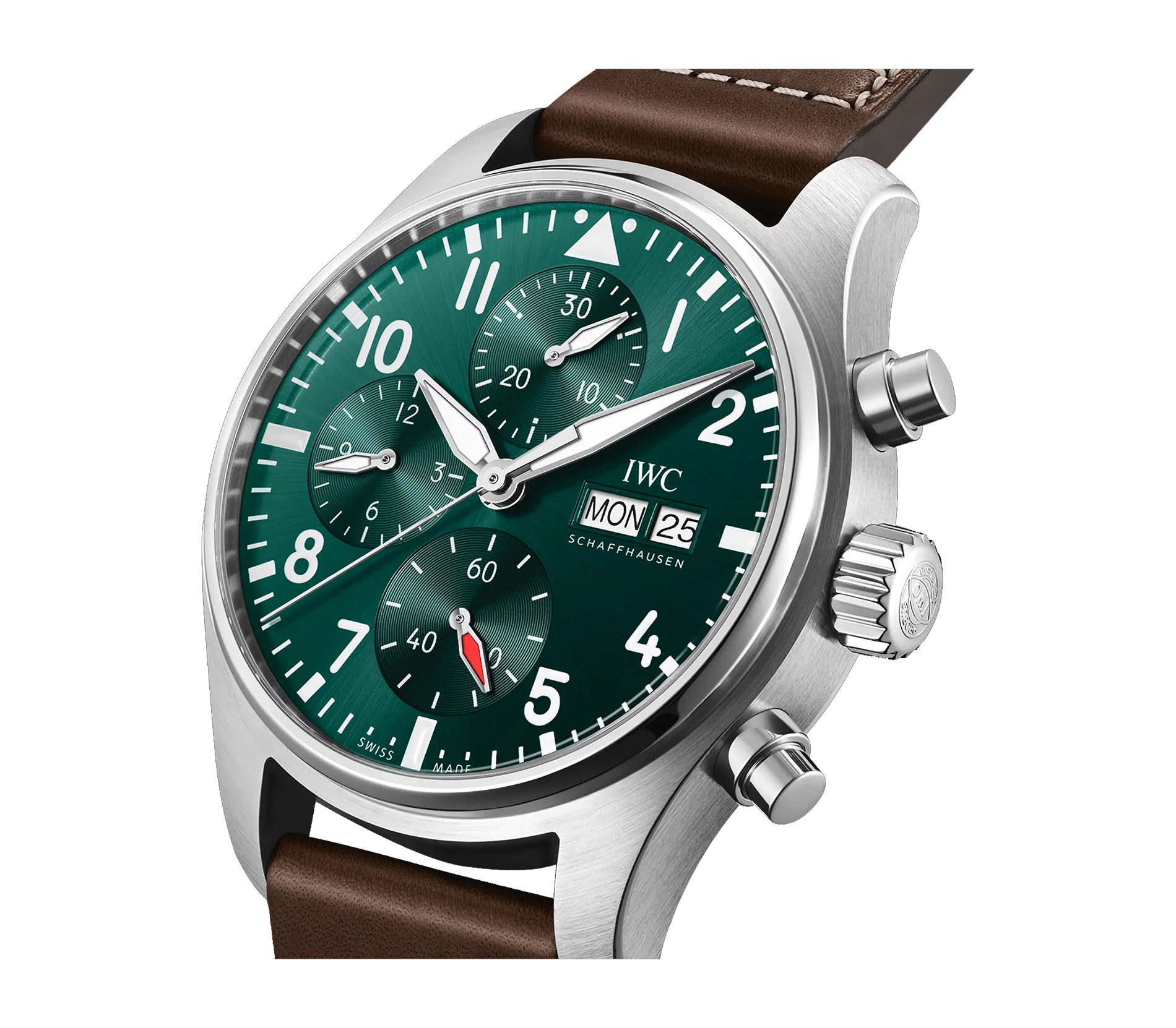 Functions are displayed on a green dial with luminous hands and Arabic numeral hour markers. Featured on the dial is a small seconds sub-dial, day-date aperture as well as a three register chronograph function.