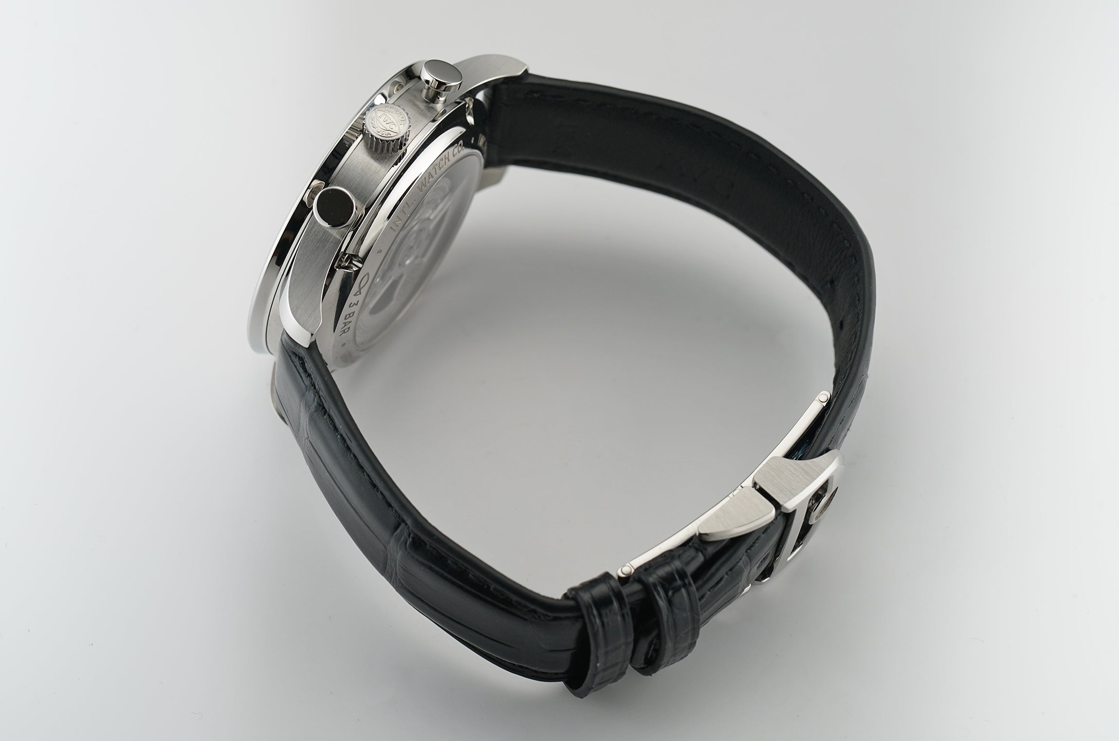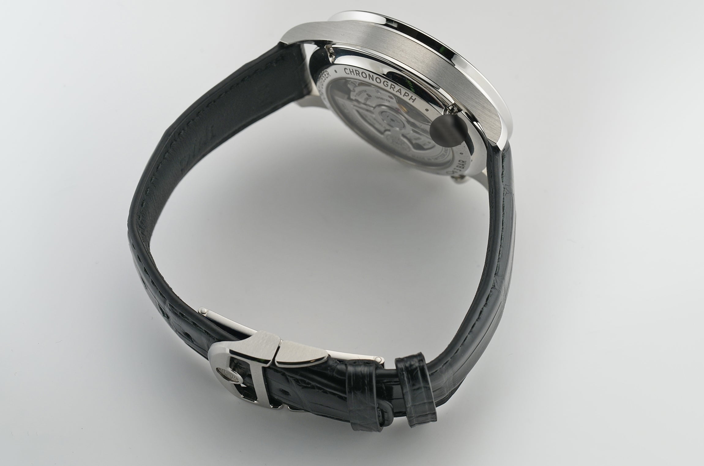 The case is made of stainless steel, displaying mostly a mirror finish with the exception of the sides which have a satin finish to them. Mounted atop the case is a mirror-finished bezel. It comes paired with a black leather strap that is accompanied by a stainless steel deployment buckle.
