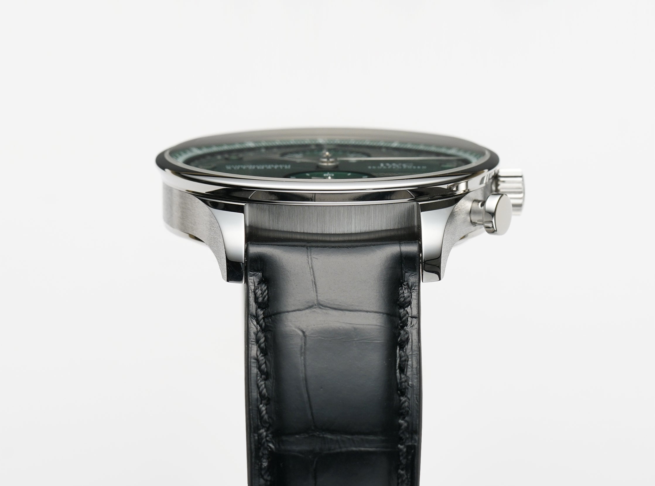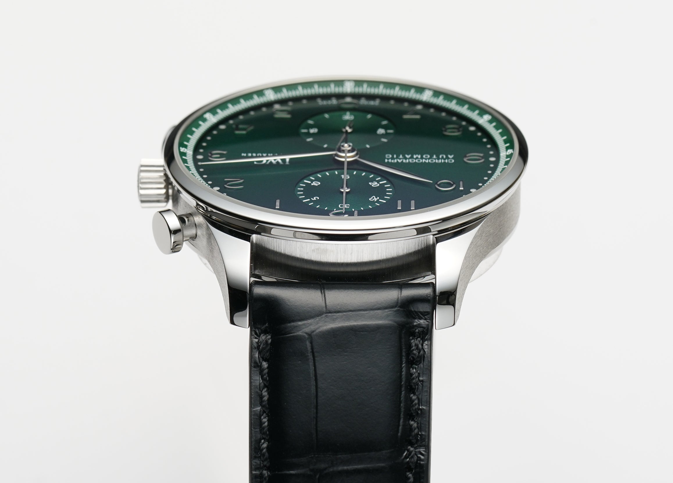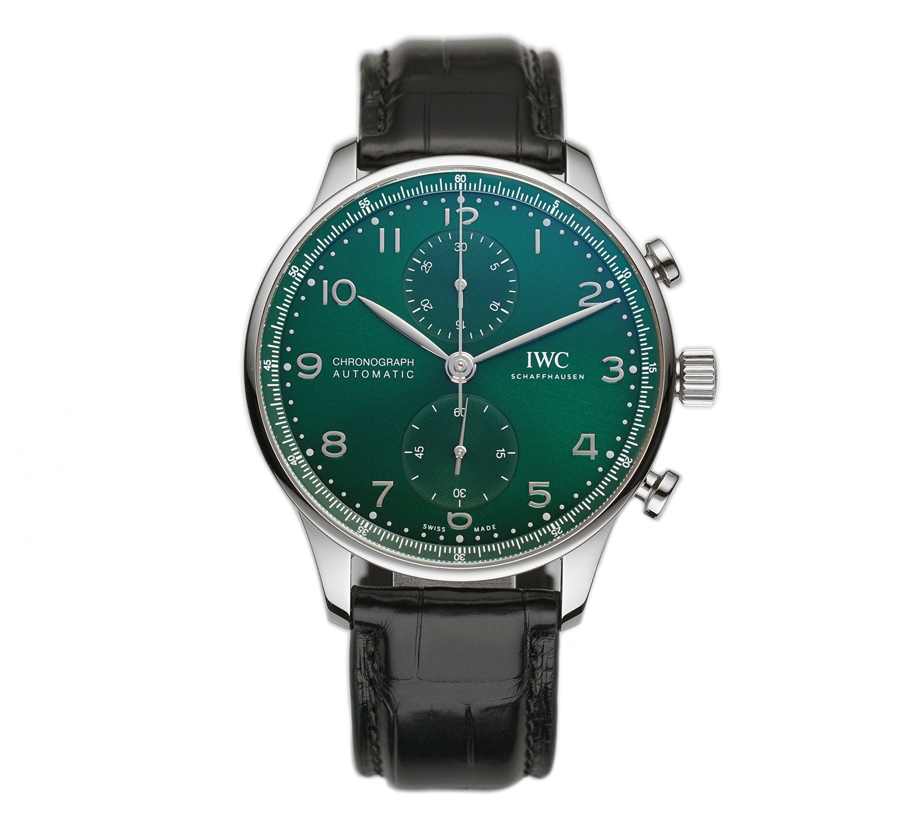 Functions are shown on a green dial with steel Arabic numerals and hands with two sub-dials on the 12 and 6 o'clock hour markers. These functions include hours, minutes, sub-seconds, and chronograph.