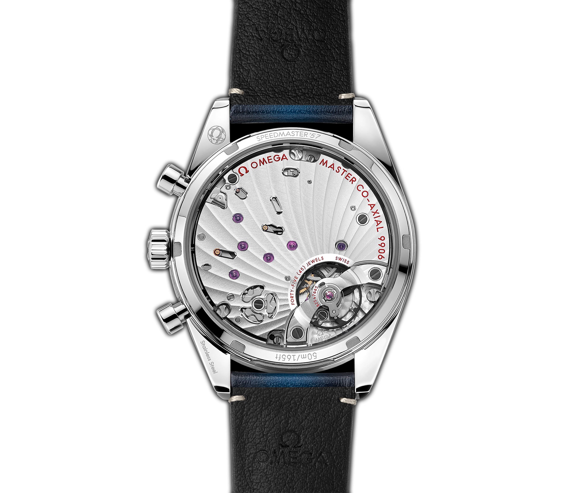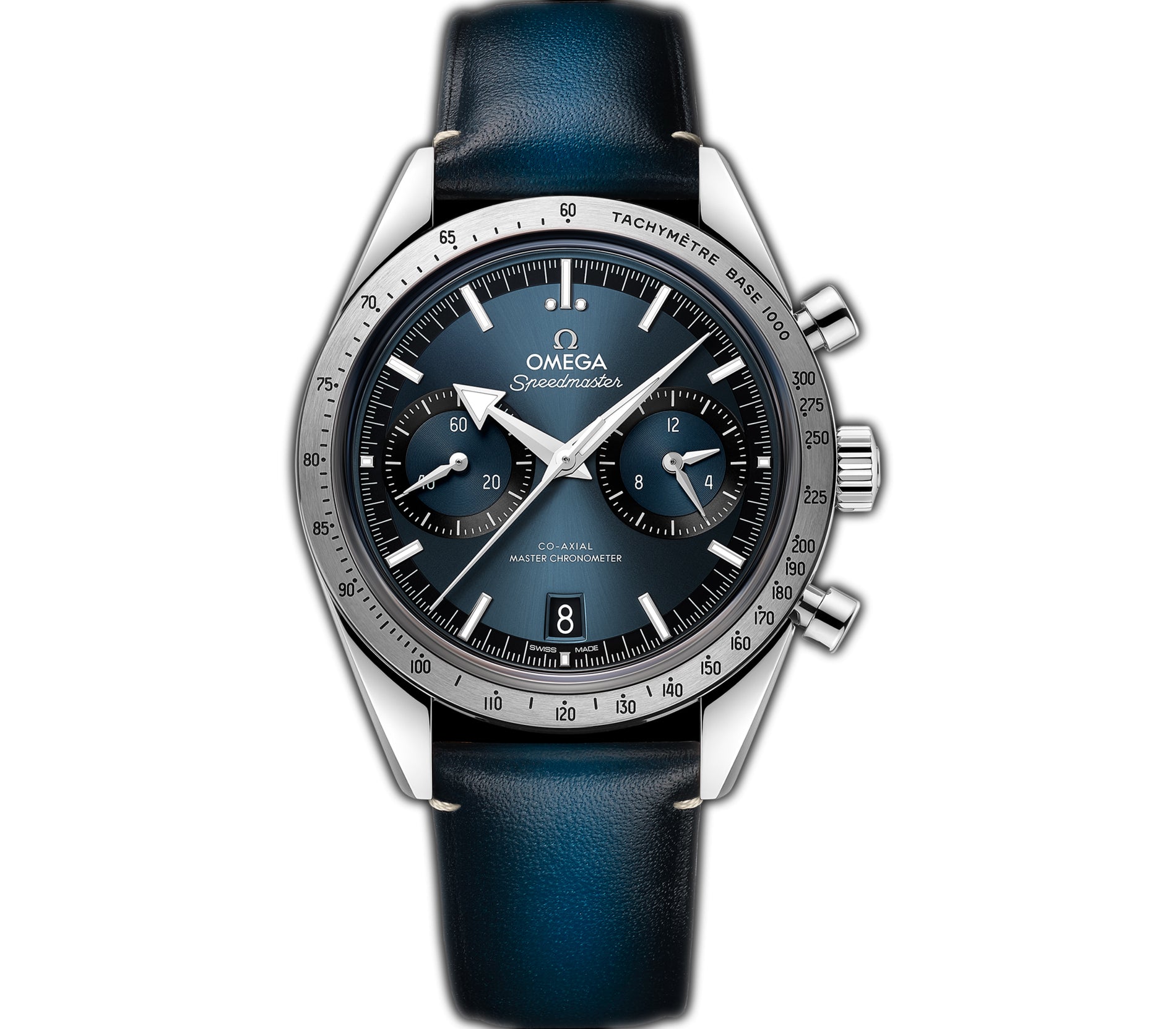 Case is made of a high polished finish on the top of the lugs. The side of the case exhibits a satin finish not including the crown and pushbuttons. Mounted atop the case is a satin finished bezel with tachymeter. The watch is paired with a blue leather strap with a stainless steel tang buckle.