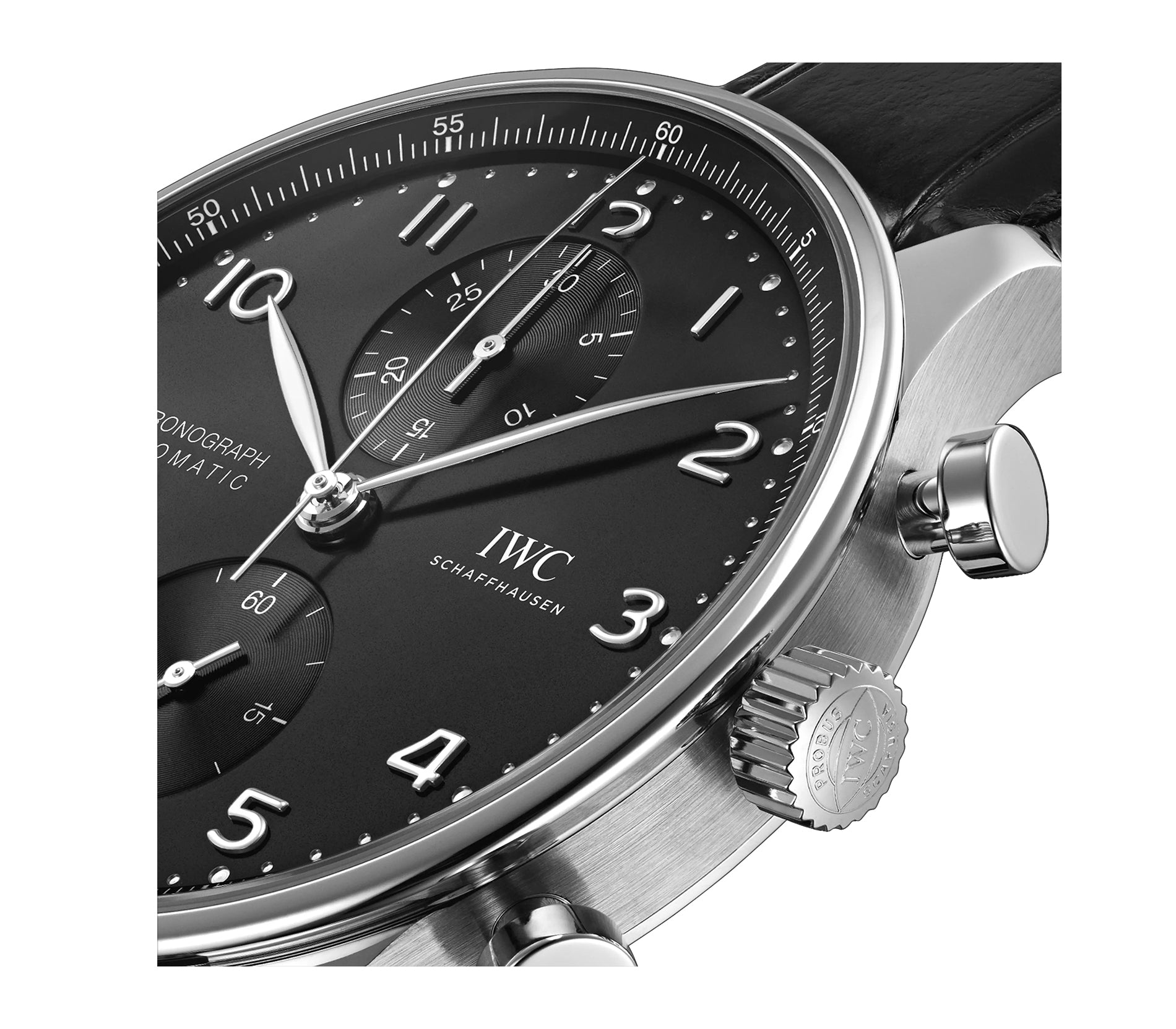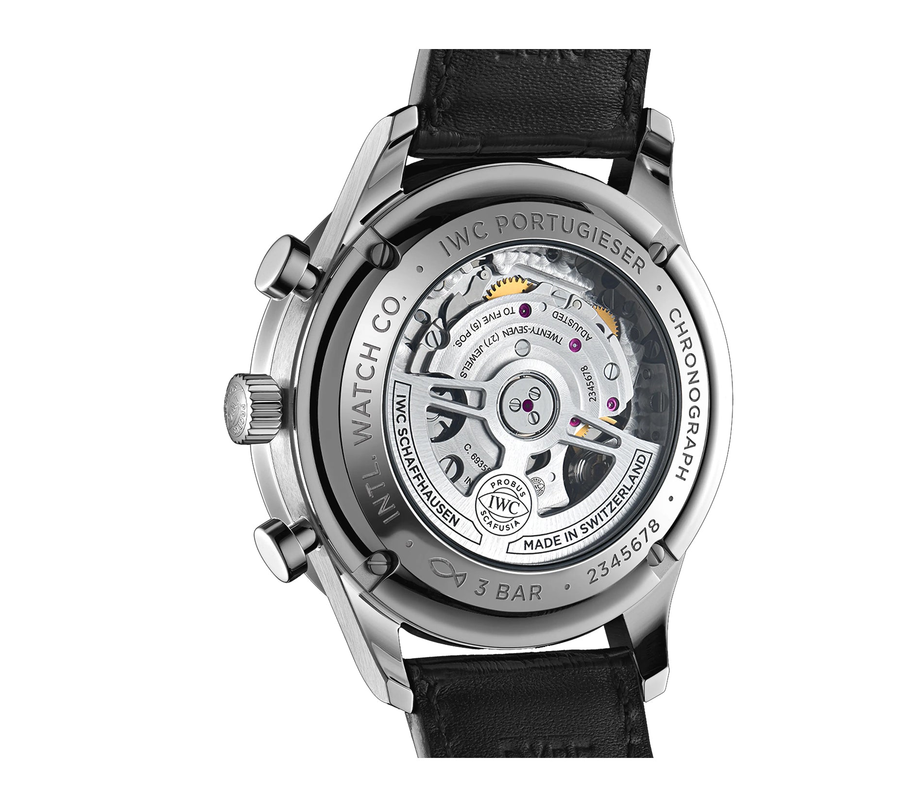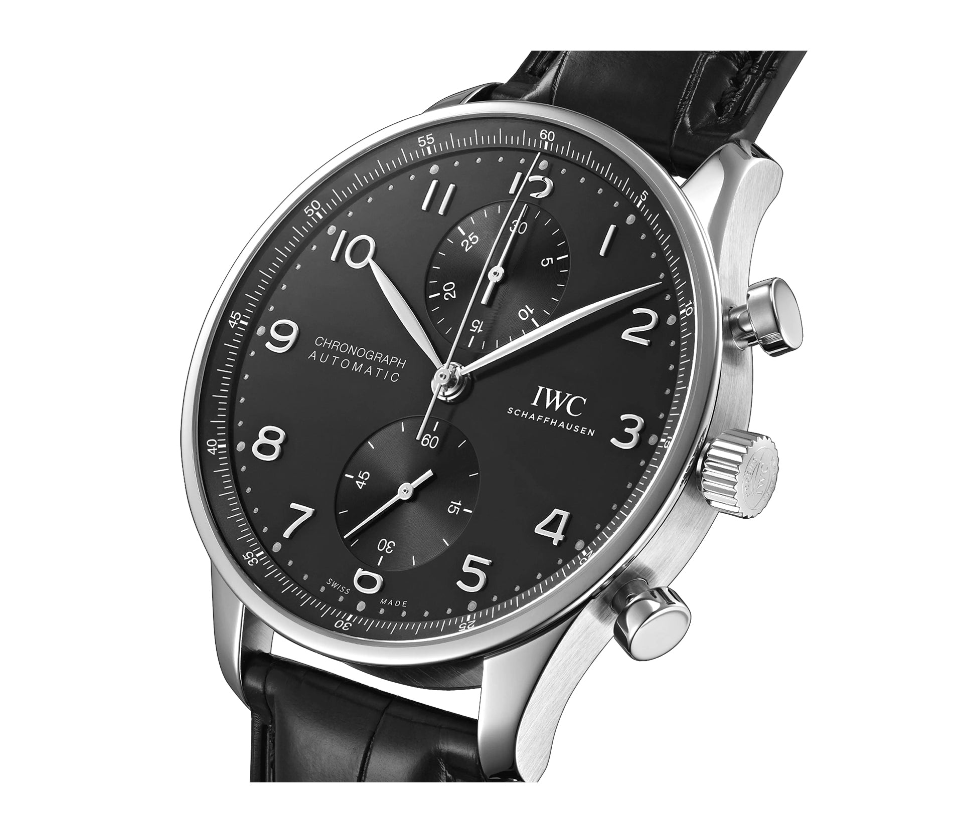 Case is made of stainless steel with mirror finished steel lugs and satin finished sides. The case back is see-through and the bezel mounted atop the case is mirror finished stainless steel. Mounted on the watch is an IWC black alligator leather strap that is accompanied by an IWC stainless steel tang buckle.
