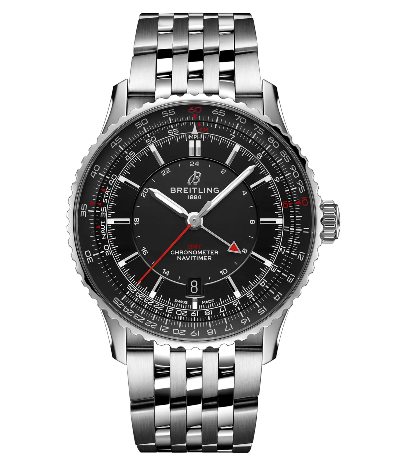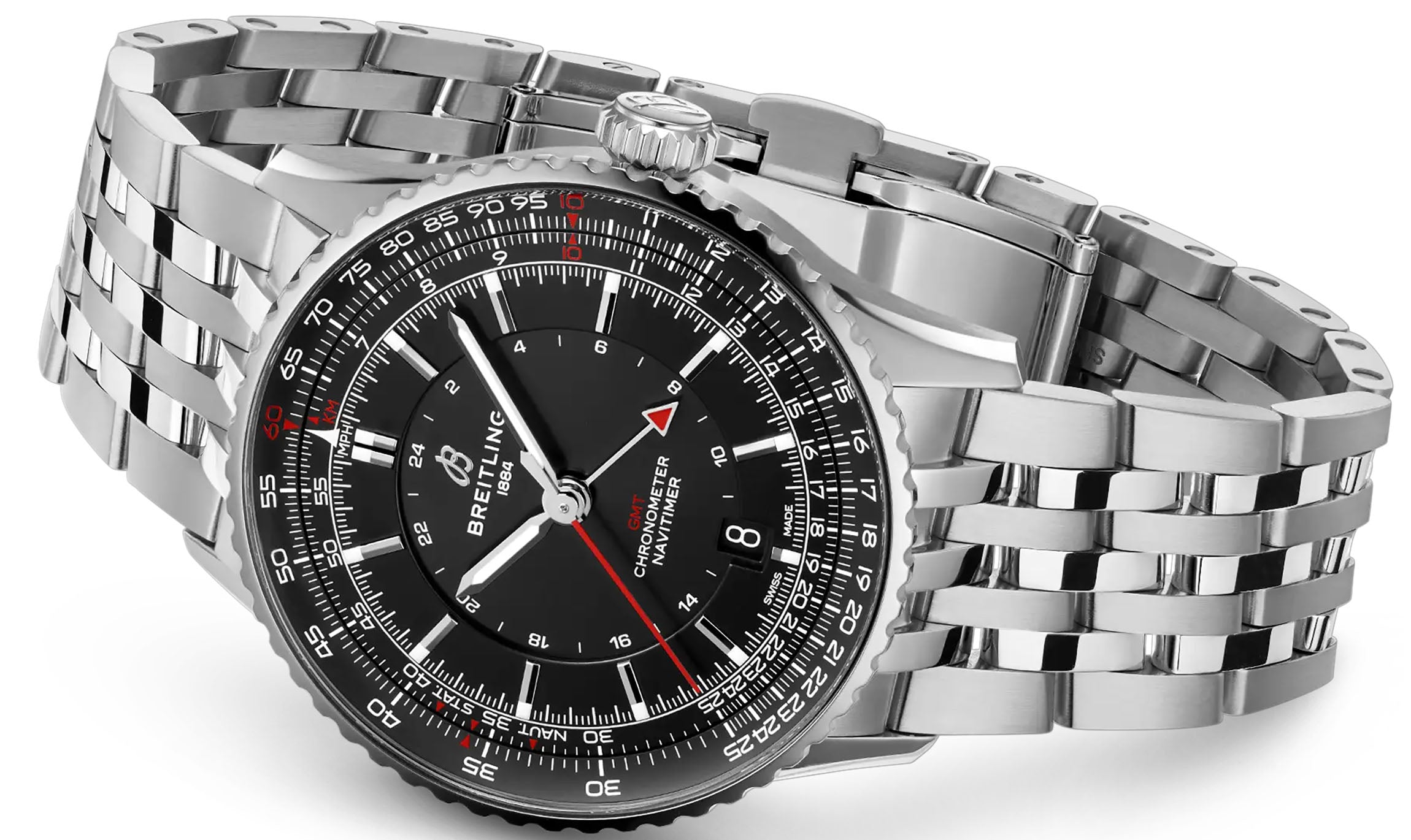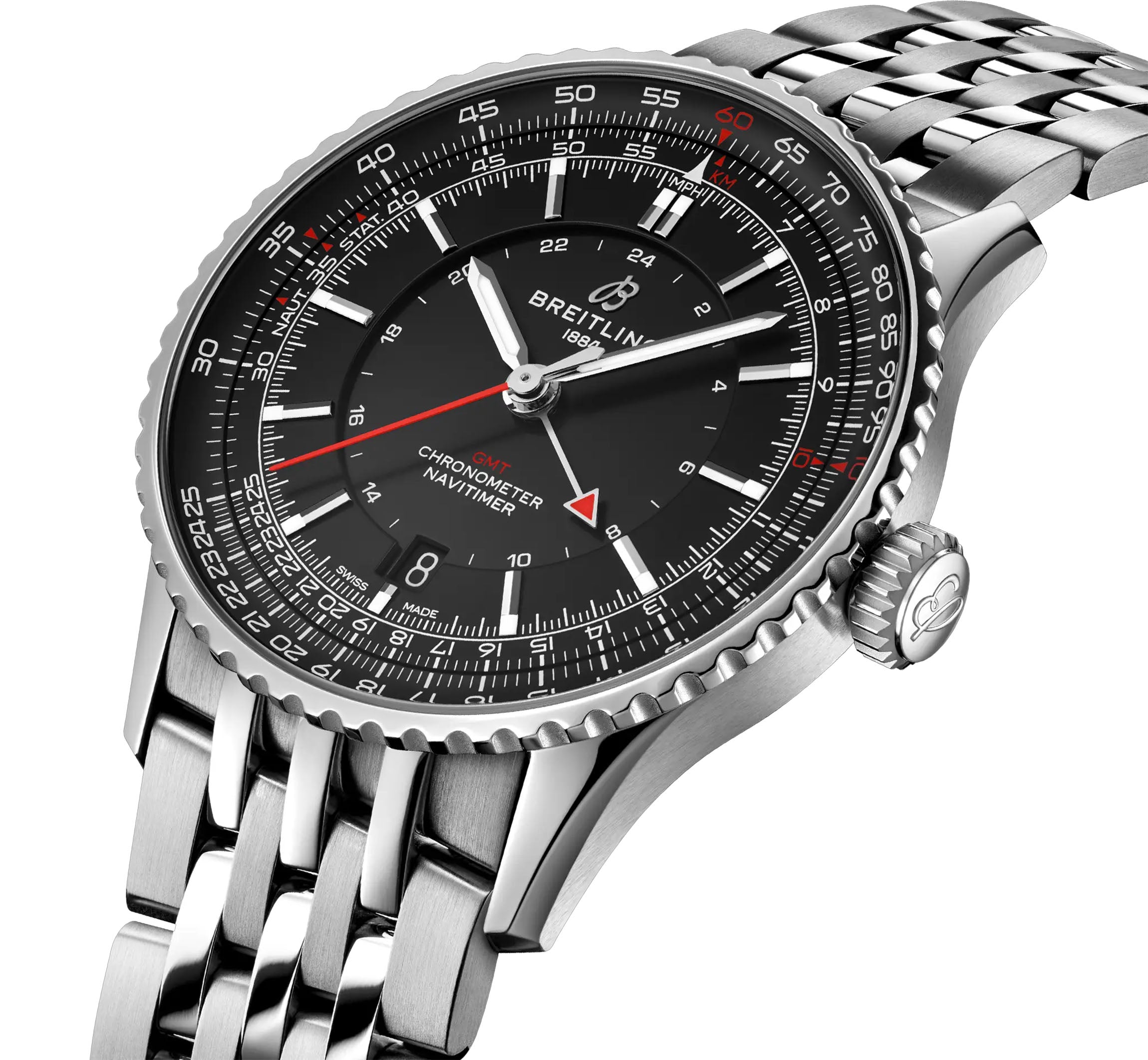 Functions are shown on a black dial with luminous hands and hour markers. These functions include hours, minutes, seconds, GMT and date.
