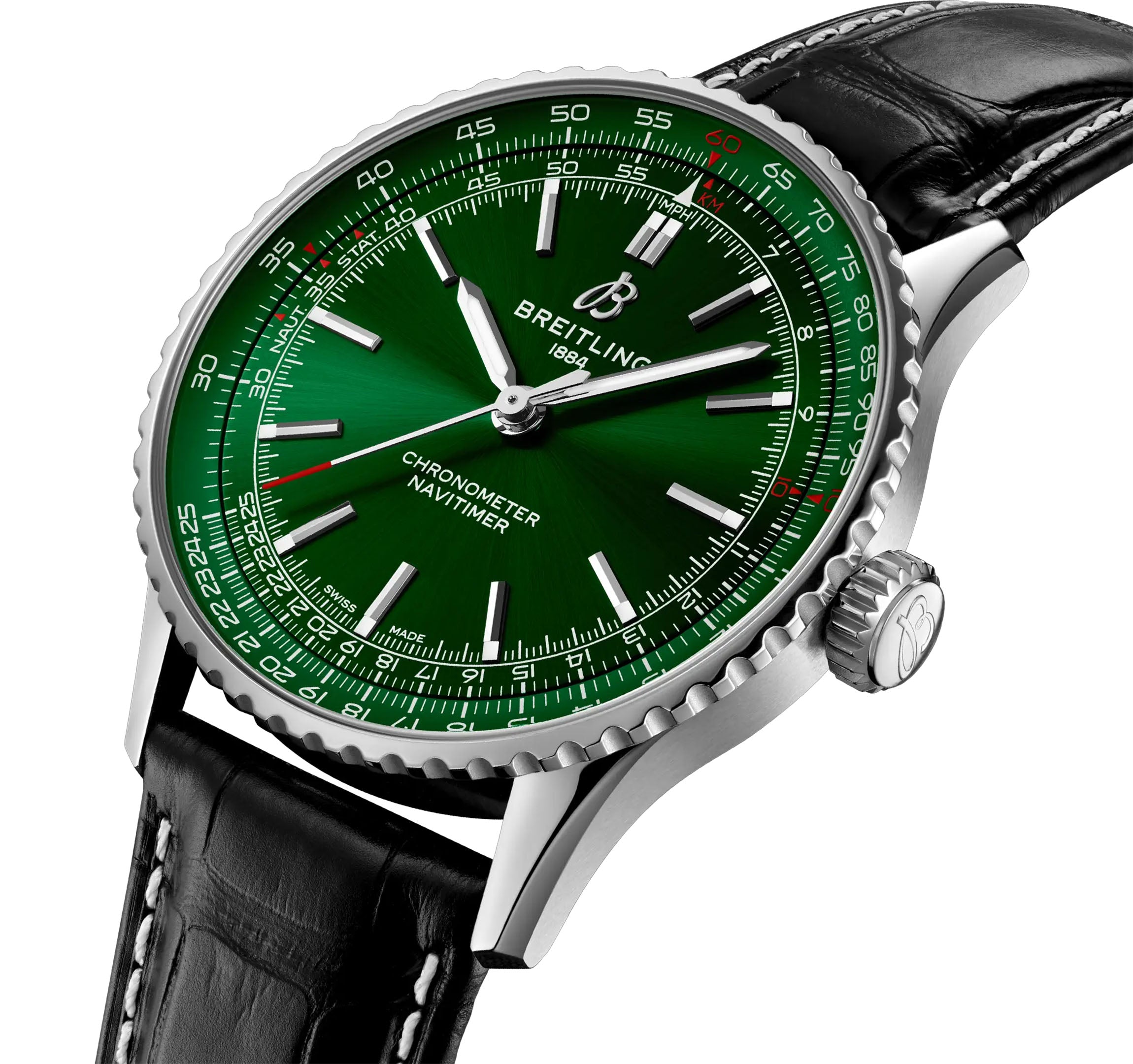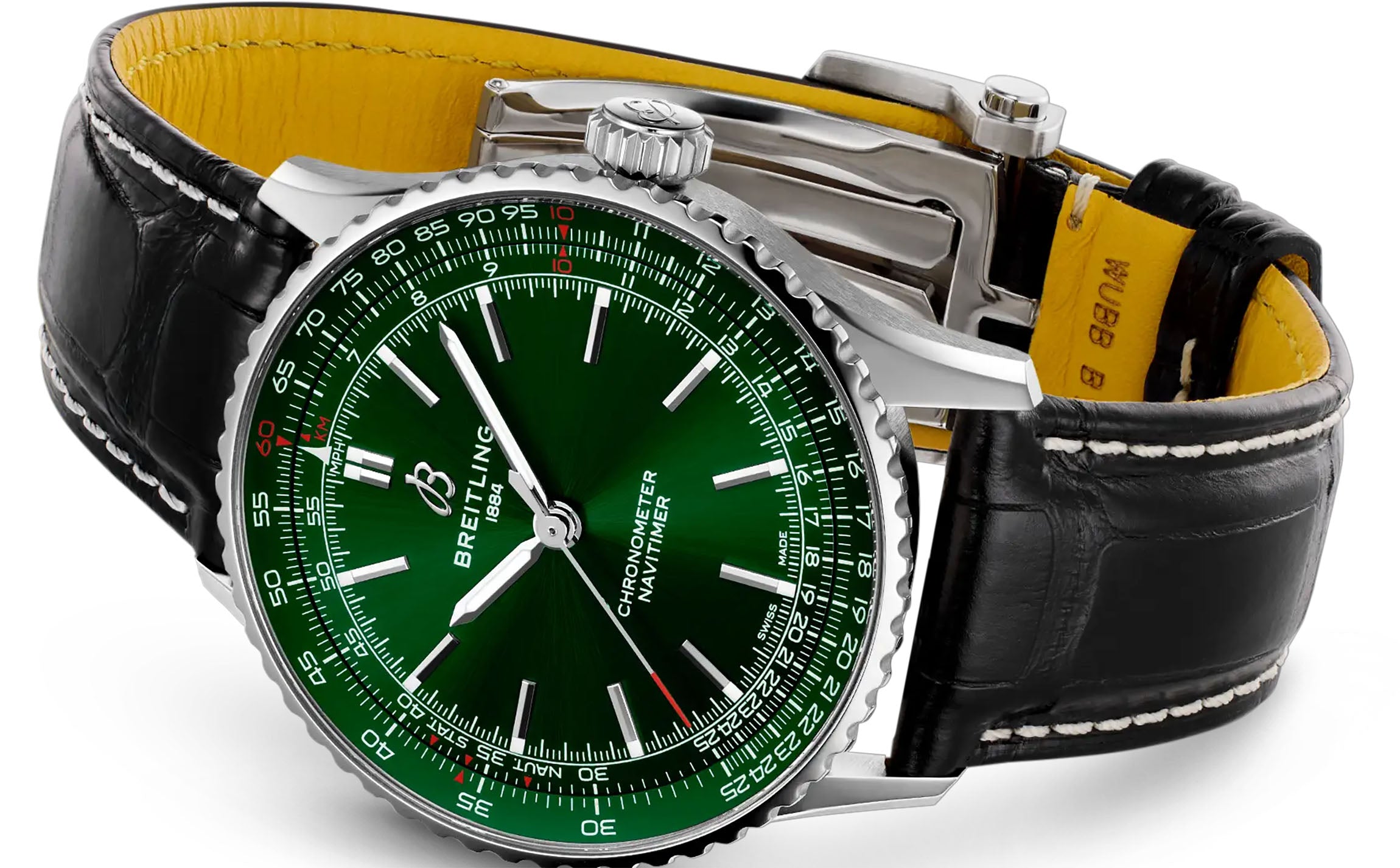 The case is made if a combined stainless steel mirror finish on the top of the lugs, bevels, and crown, and a satin finish along the side of the case. Mounted atop the case is a stainless steel bi directional bezel with a green tachymeter inner flange. Paired with the watch is a black leather strap with white stitching and a stainless steel folding clasp.