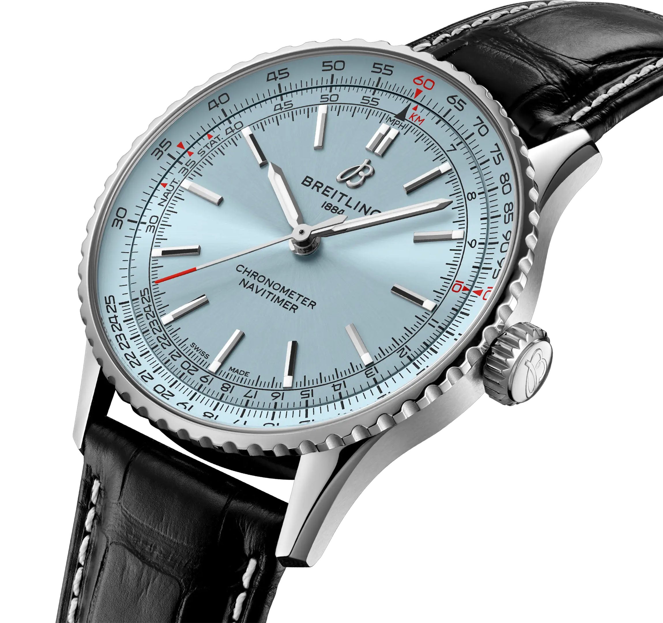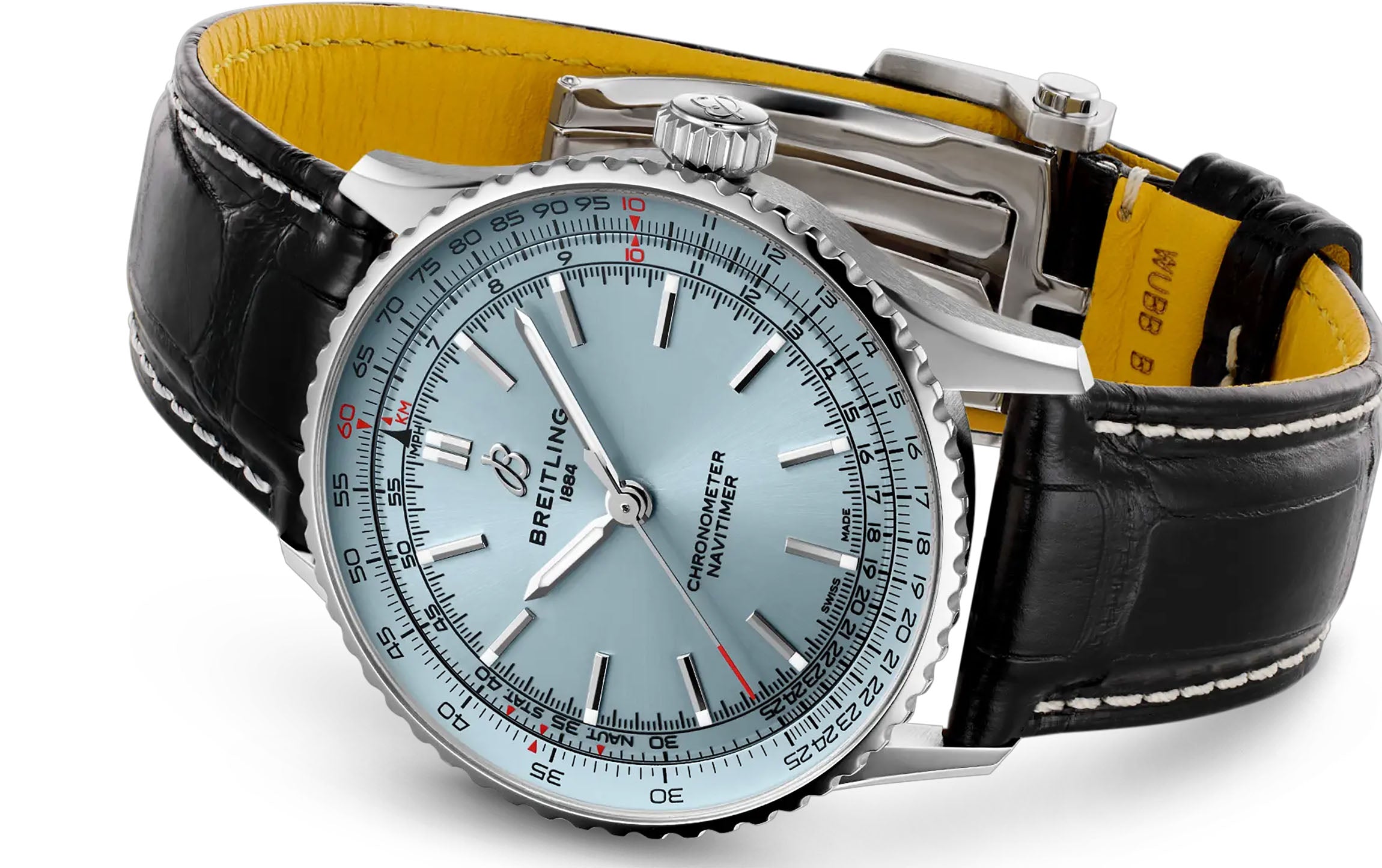 The case is made if a combined stainless steel mirror finish on the top of the lugs, bevels, and crown, and a satin finish along the side of the case. Mounted atop the case is a stainless steel bi directional bezel with a light blue tachymeter inner flange. Paired with the watch is a blue leather strap with white stitching and a stainless steel folding clasp.