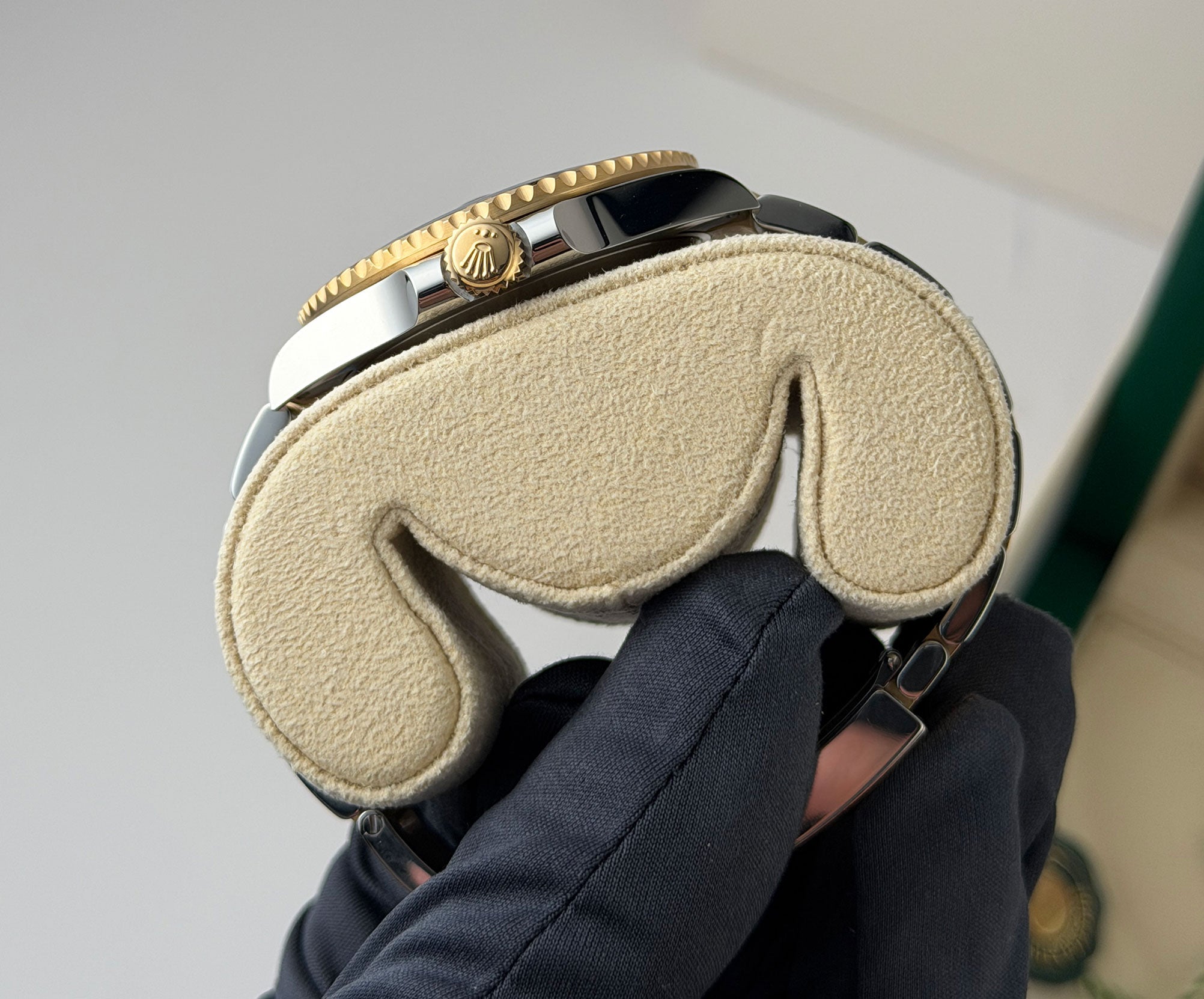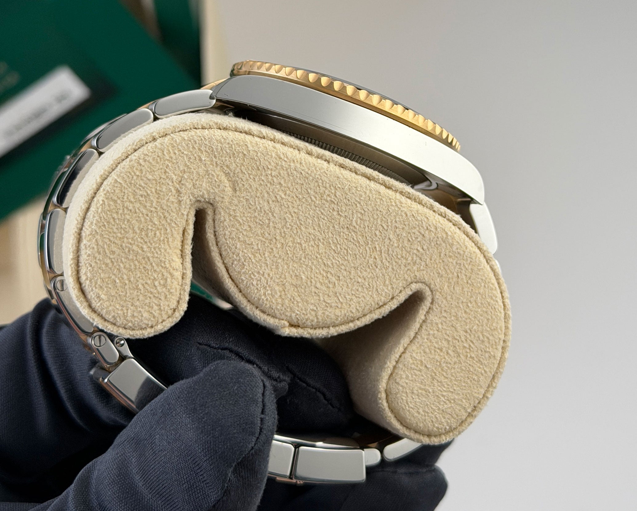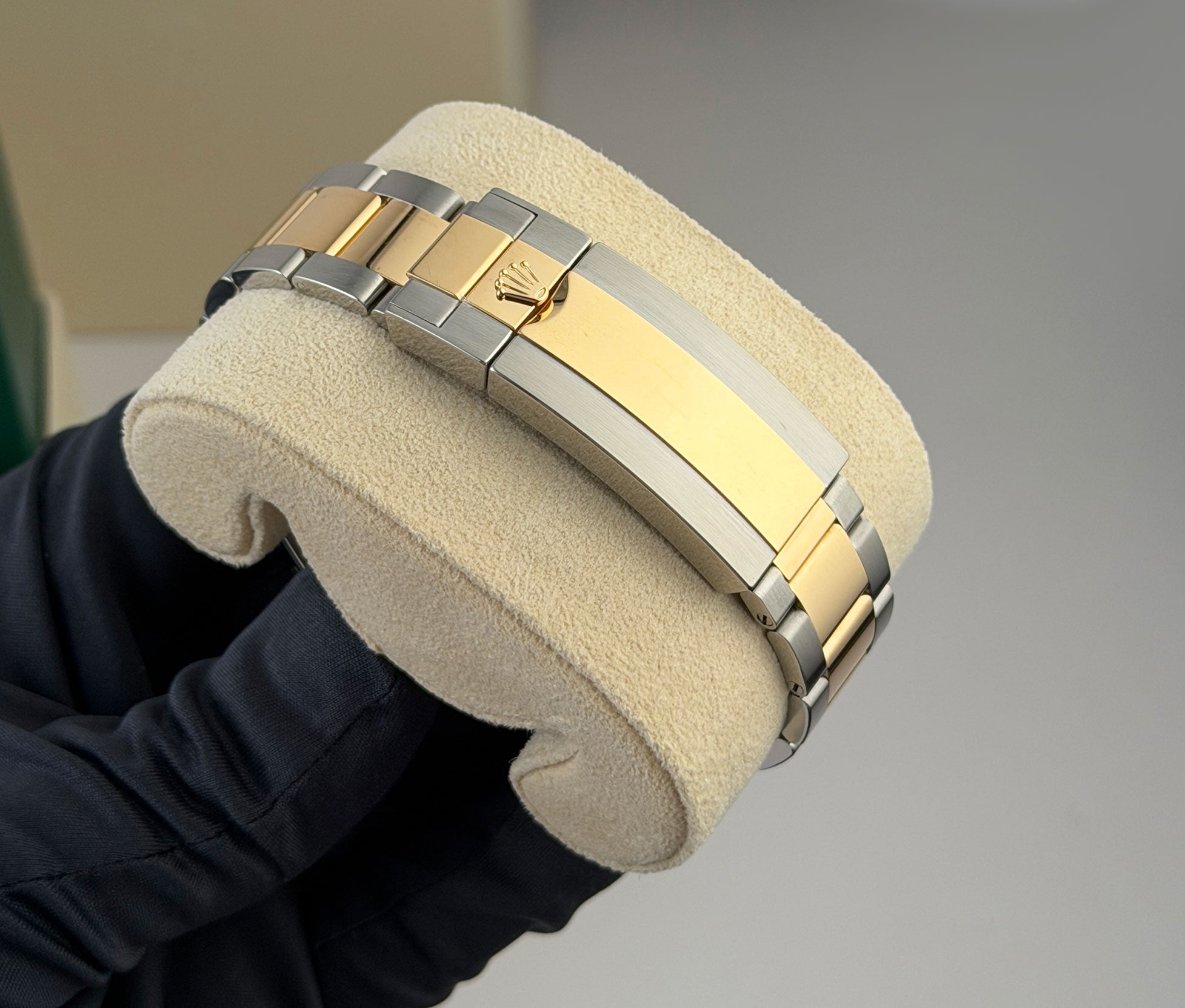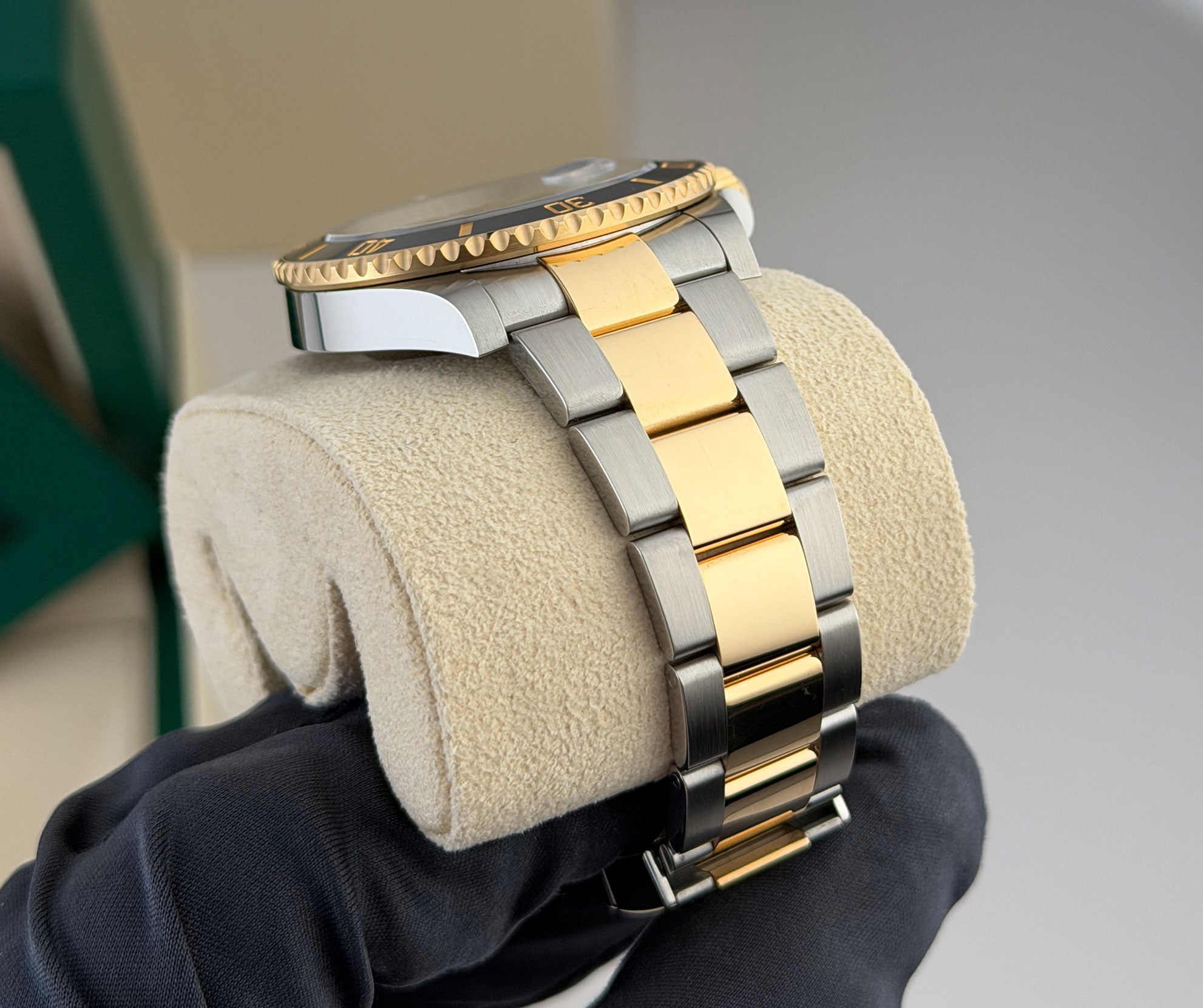 The case is made of mostly stainless steel, displaying a combination of satin and mirror finishes. It is equipped with an 18k yellow gold screw down crown as well as an 18k yellow gold bezel equipped with a black diver's ceramic bezel insert. The watch is paired with a two-tone bracelet, featuring mirror-finished 18k yellow gold center links and satin-finished stainless steel outer links. It currently fits up to a 7.5 inch wrist approximately.