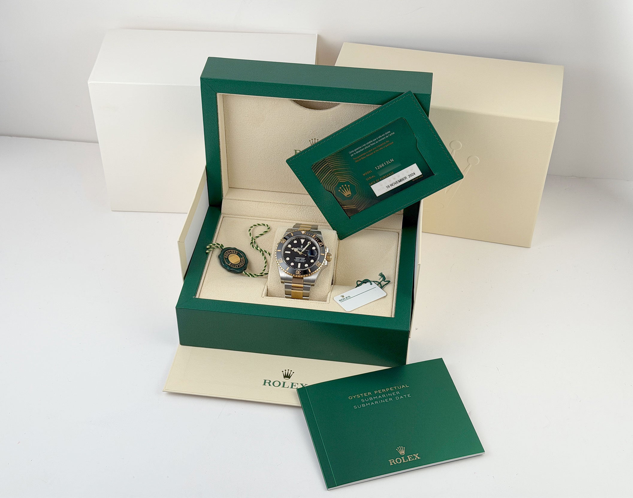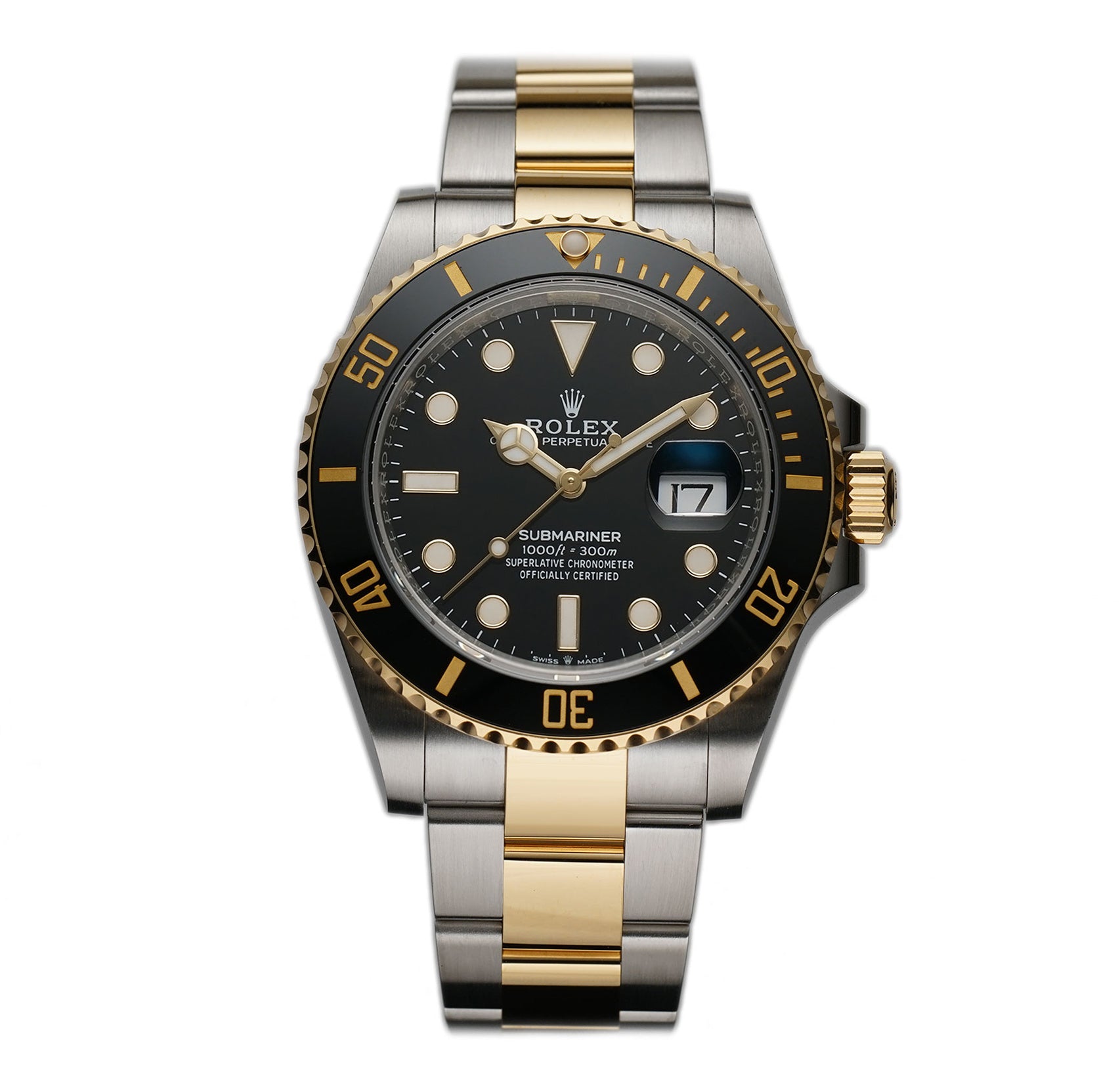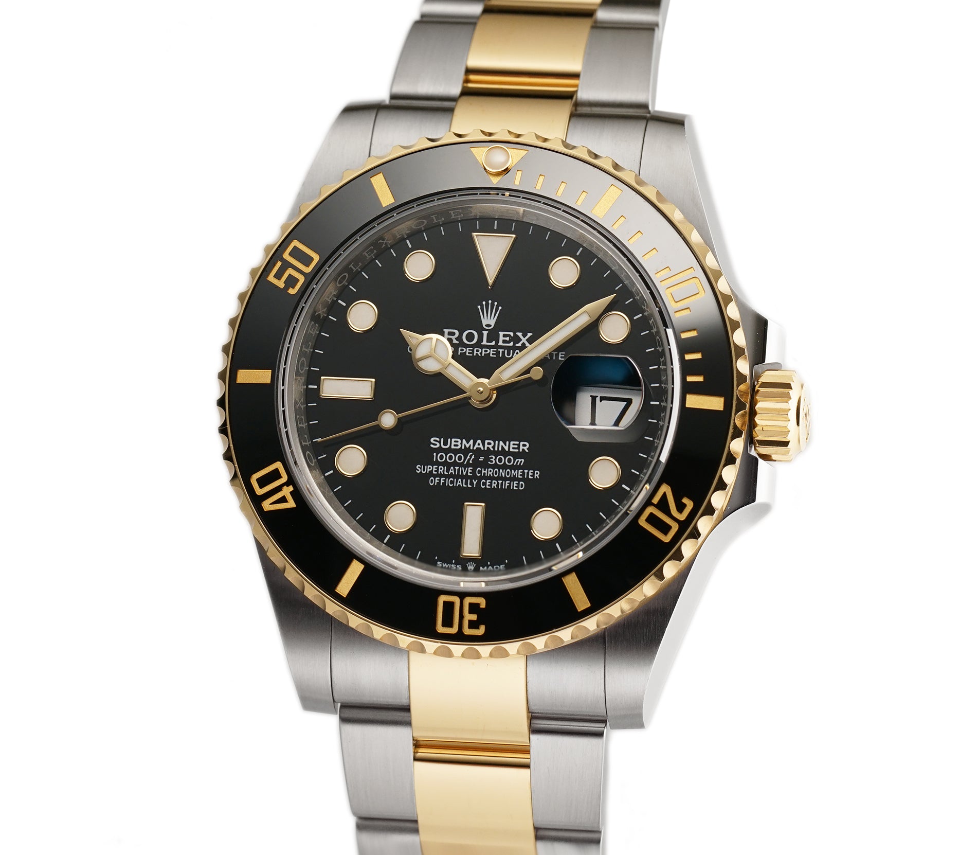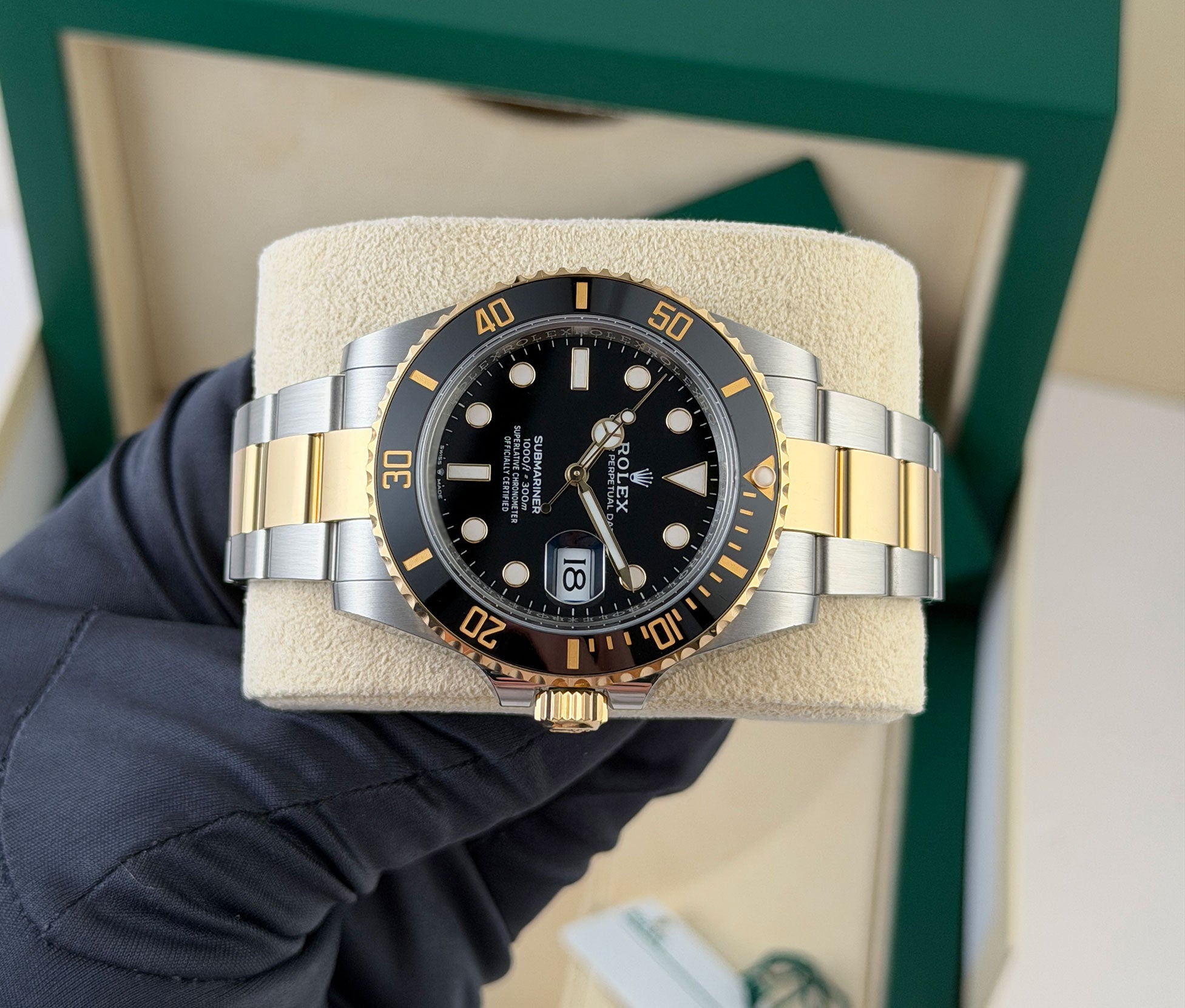 The case is made of mostly stainless steel, displaying a combination of satin and mirror finishes. It is equipped with an 18k yellow gold screw down crown as well as an 18k yellow gold bezel equipped with a black diver's ceramic bezel insert. The watch is paired with a two-tone bracelet, featuring mirror-finished 18k yellow gold center links and satin-finished stainless steel outer links. It currently fits up to a 7.5 inch wrist approximately.