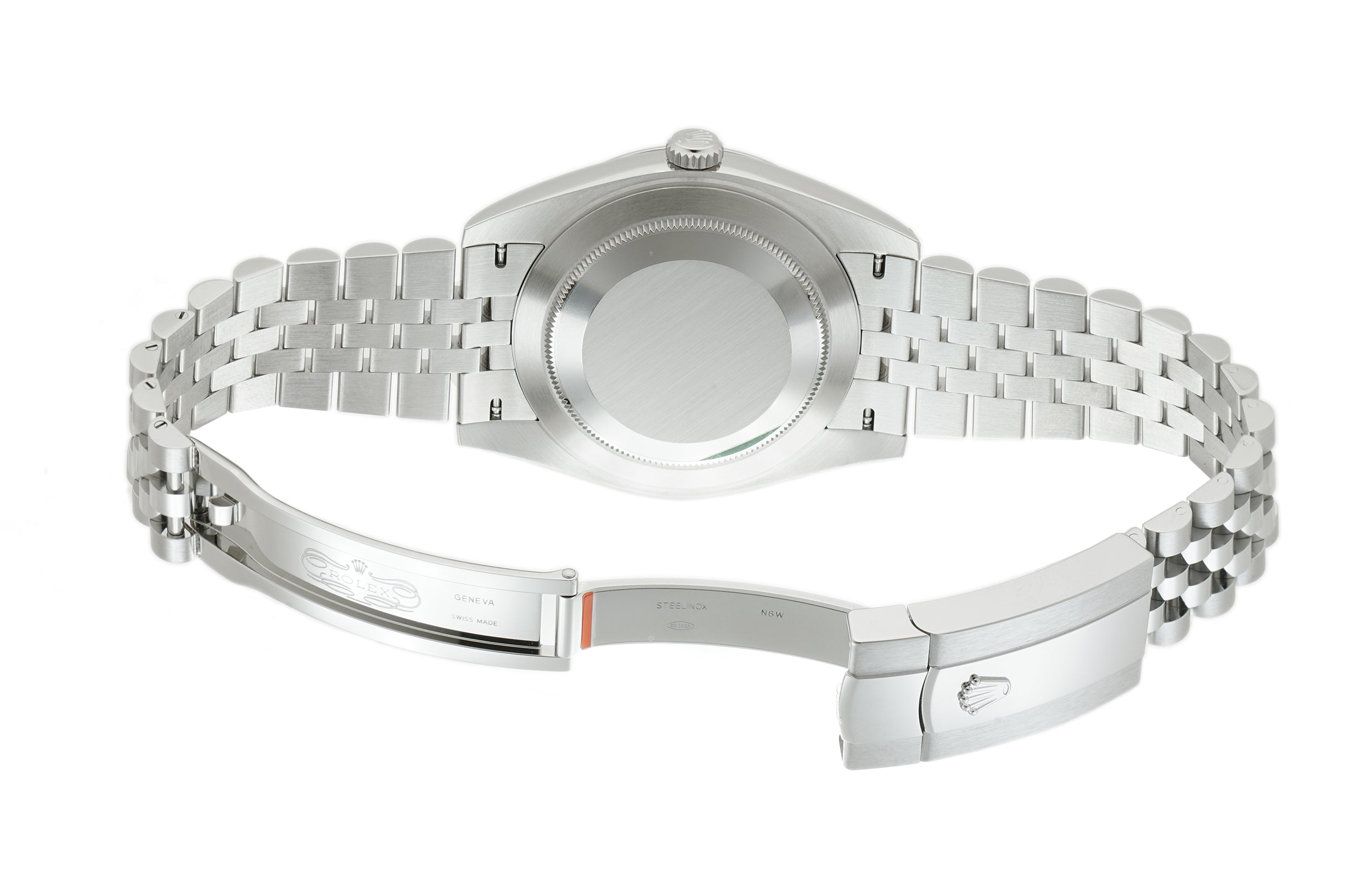 The case is made of stainless steel most of which displays a mirror finish with the exception of the back of the lugs and center of the case back which have a satin finish. Mounted atop the case is a mirror-finished 18k white gold fluted bezel. Both the crown and case back are stainless steel as well as screwed-down. As for the jubilee bracelet, it is stainless steel as well but with mirror-finished center links and satin-finished outer links.