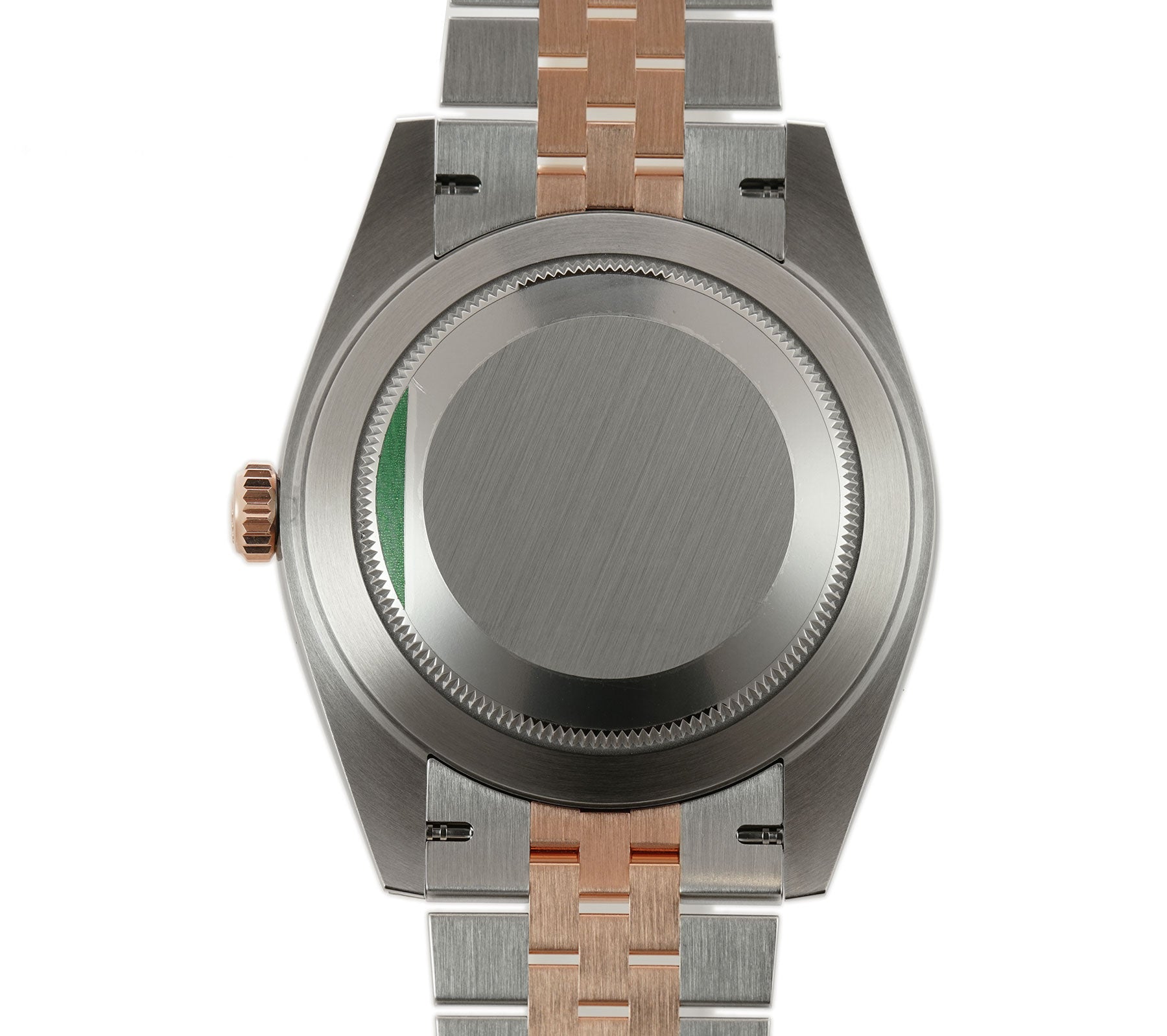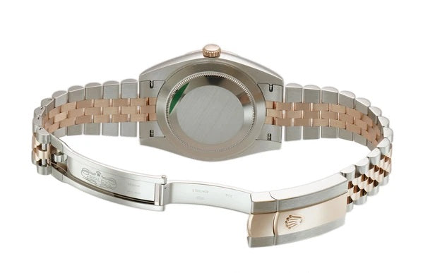 Case is made of high-polish finished stainless steel while the smooth bezel mounted atop is made of high-polish finished 18k everose gold. Stainless steel case back and 18k everose crown are both screw-down. As for the jubilee bracelet, it features high-polish finished 18k everose gold center links and brush-finished stainless steel outer links.