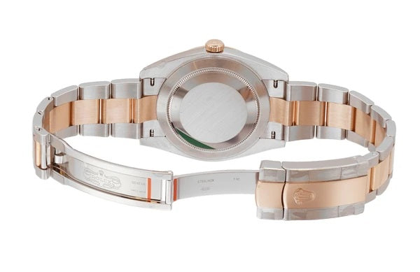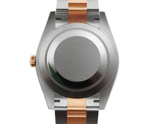 Case is made of high-polish finished stainless steel while the smooth bezel mounted atop is made of high-polish finished 18k everose gold. Stainless steel case back and 18k everose crown are both screw-down. As for the oyster bracelet, it features high-polish finished 18k everose gold center links and brush-finished stainless steel outer links.
