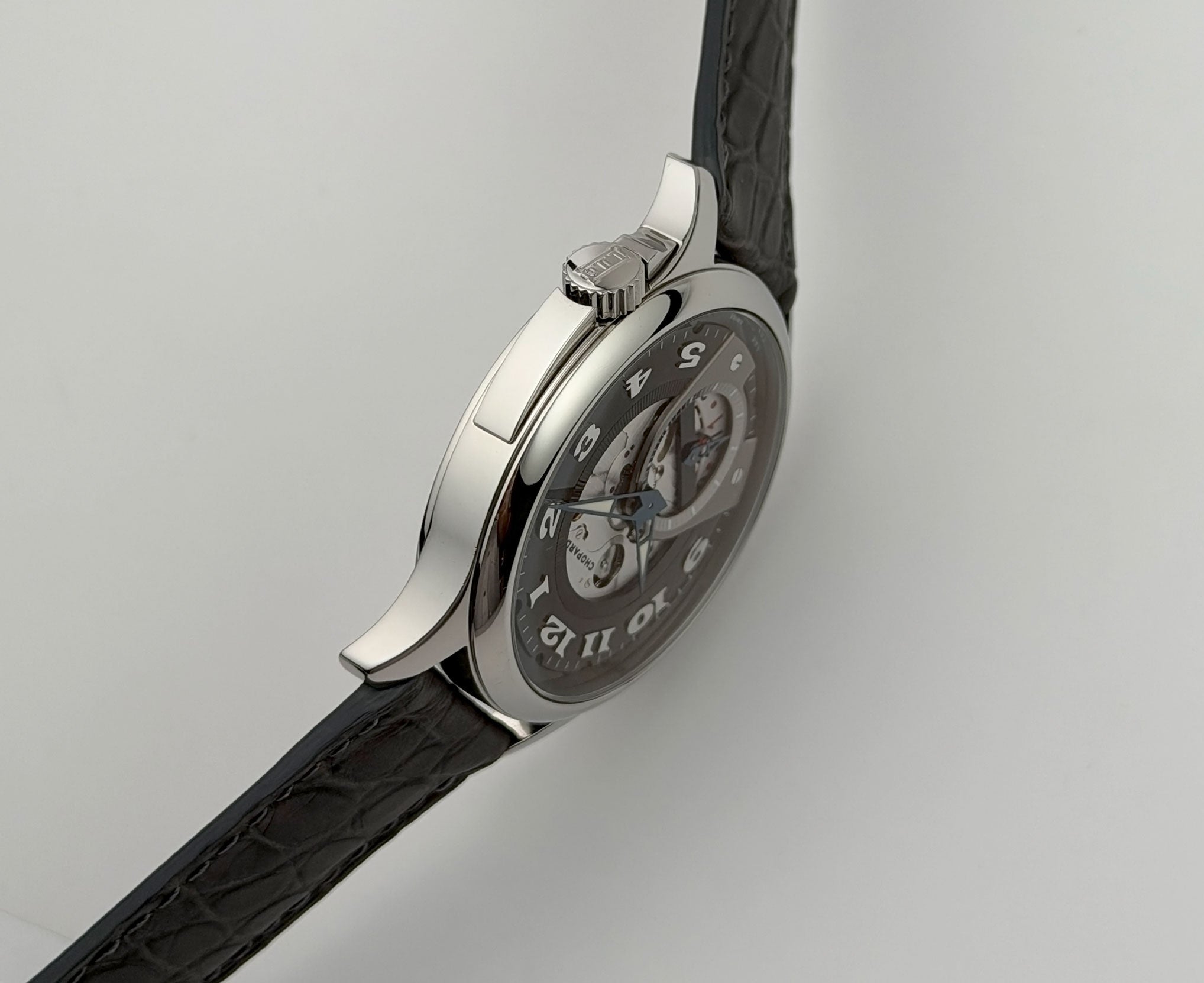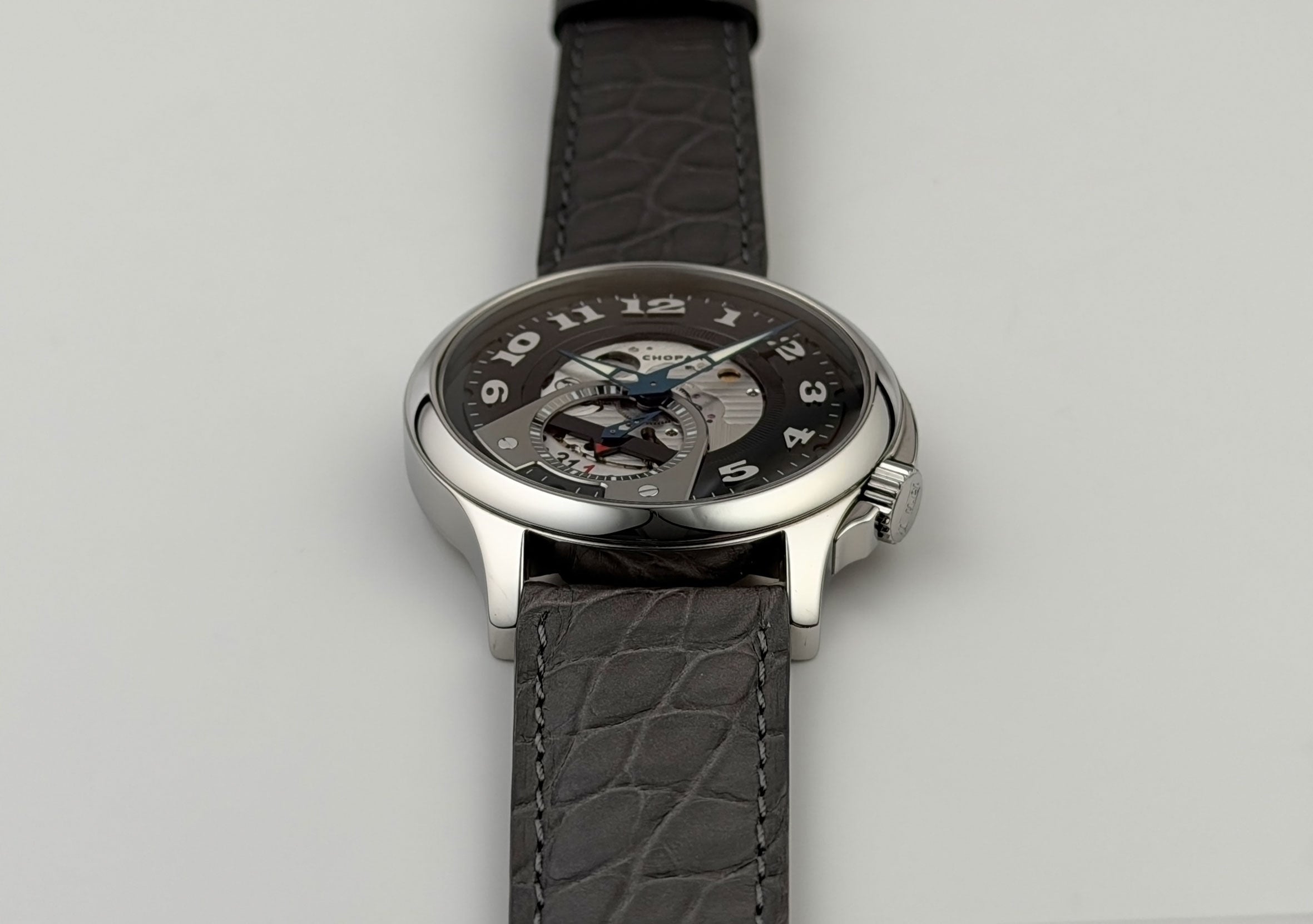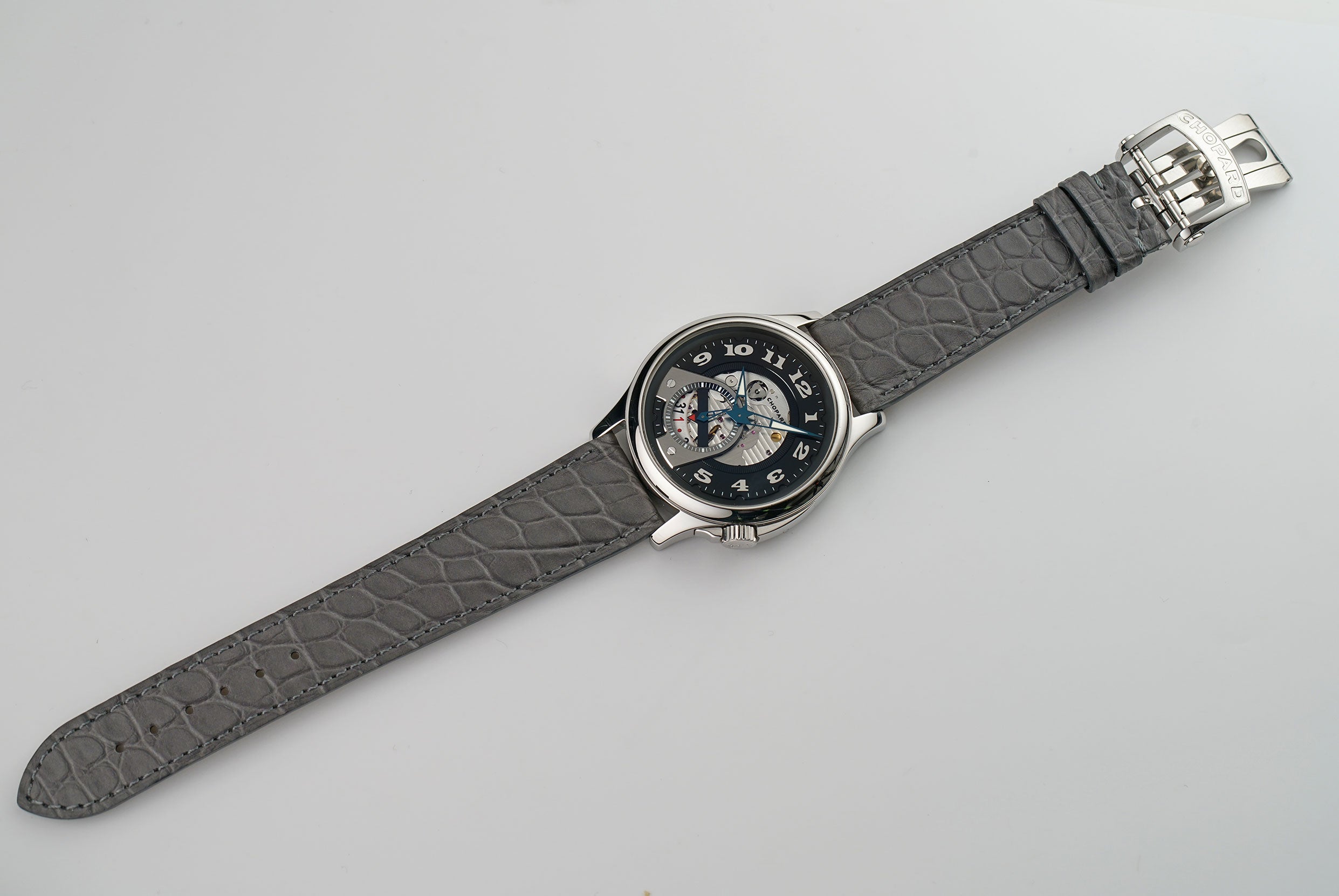 The case features a mirror-finished stainlaess steel, as does the bezel mounted atop. Contrary to the ordinary crown position, this model has it slightly twisted near the 4 o'clock position. It is paired with an unworn Jean Rousseau (high-quality Paris-made) grey leather strap that is accompanied by a stainless steel Chopard double-folding deployment buckle.