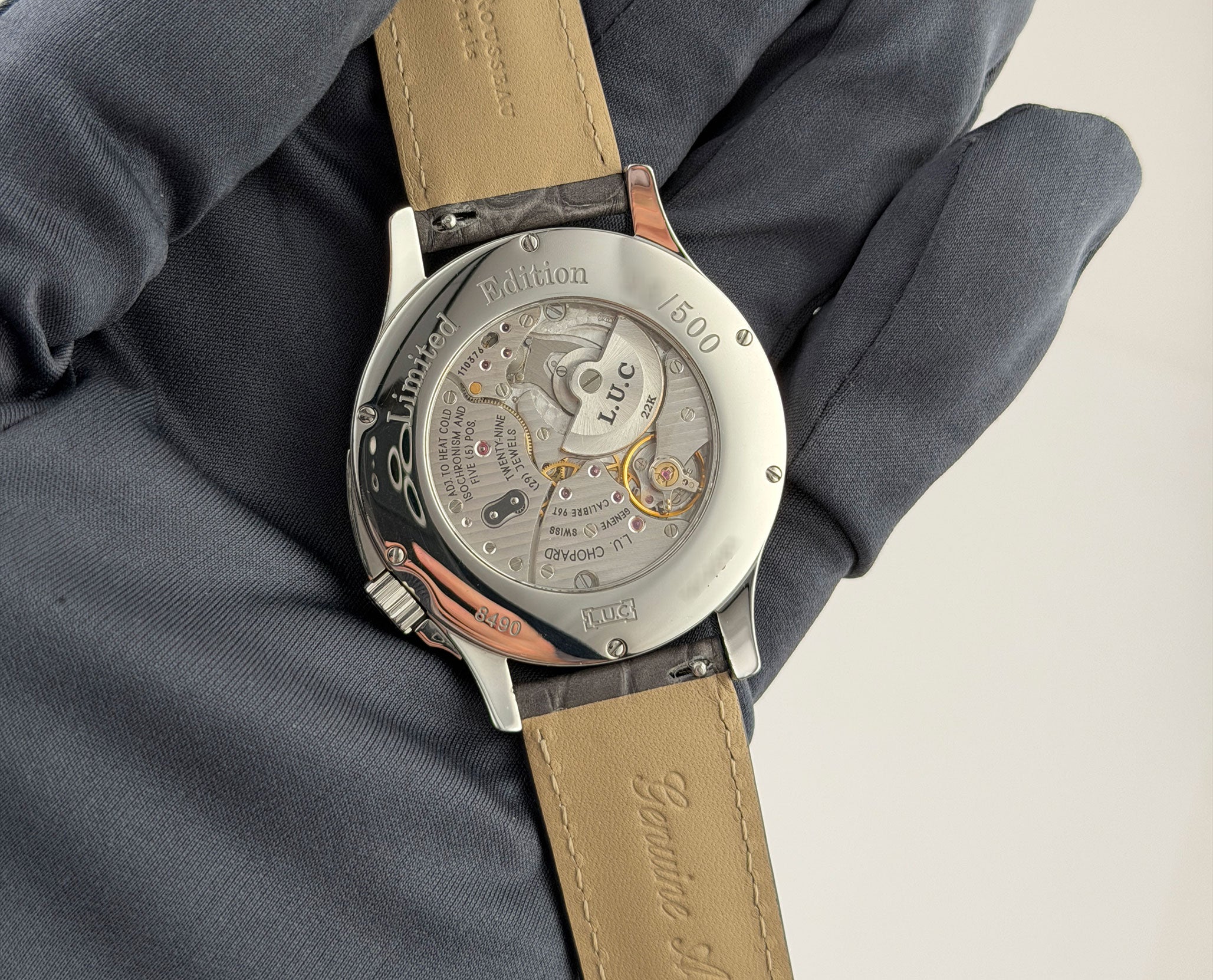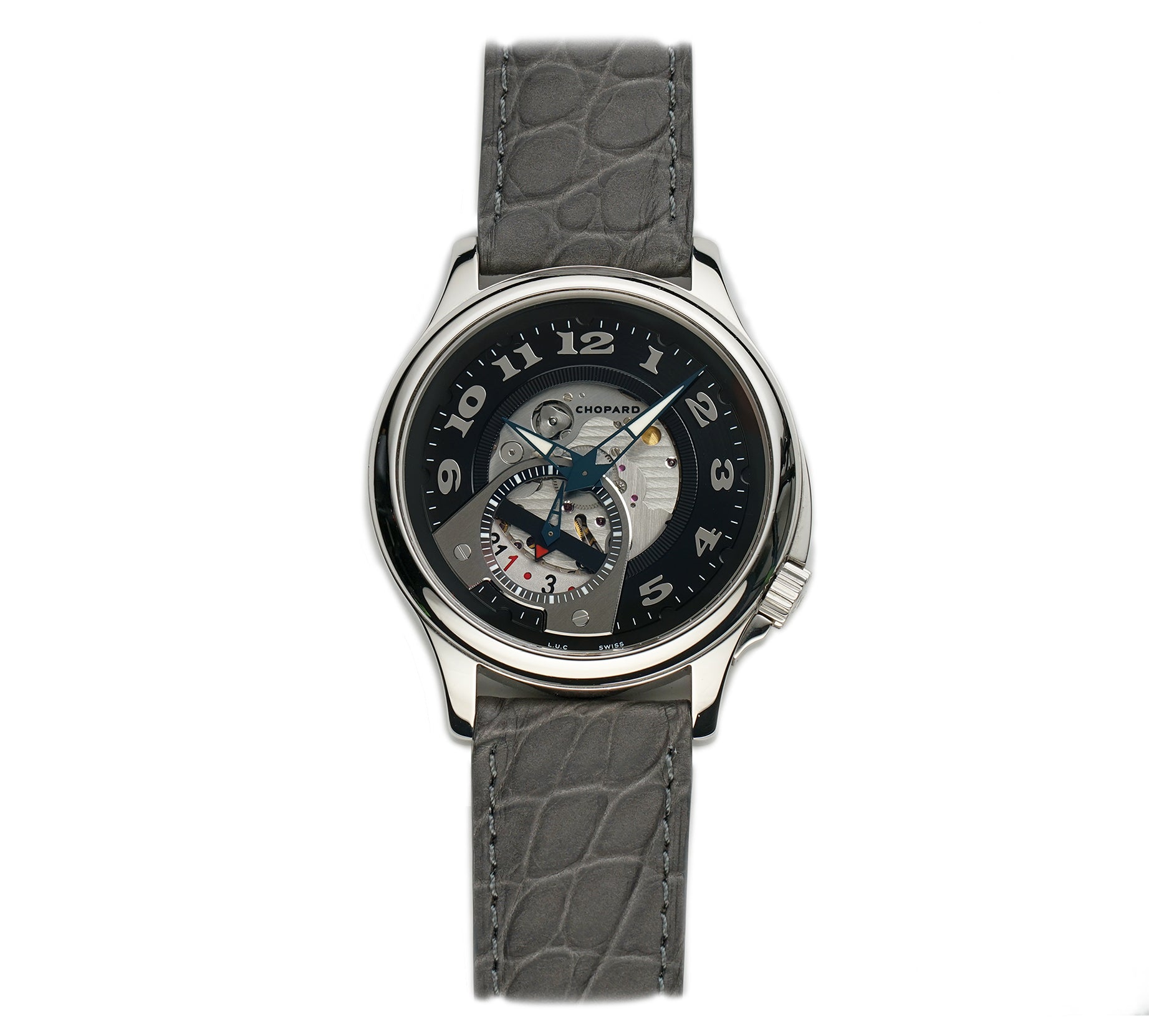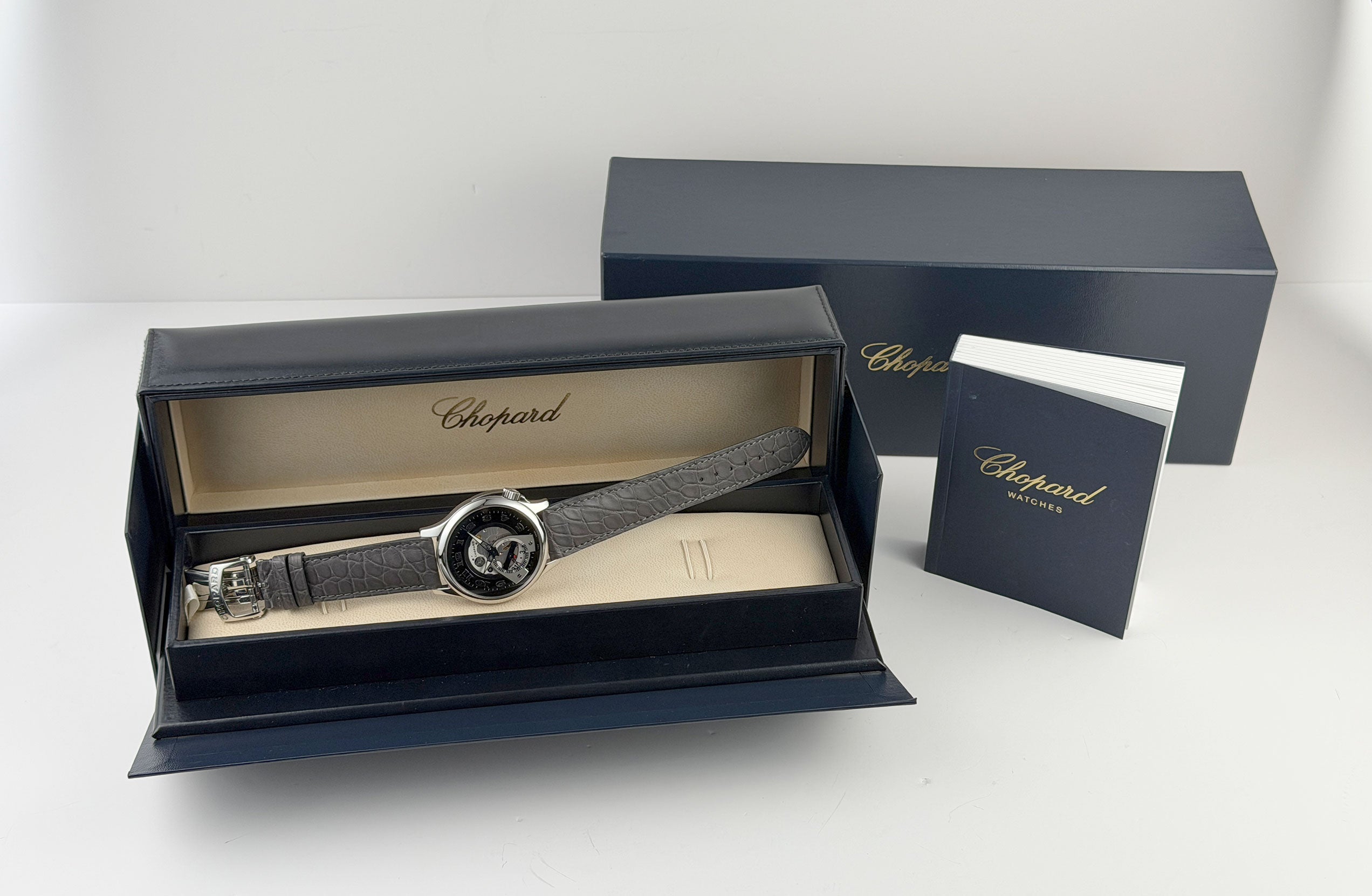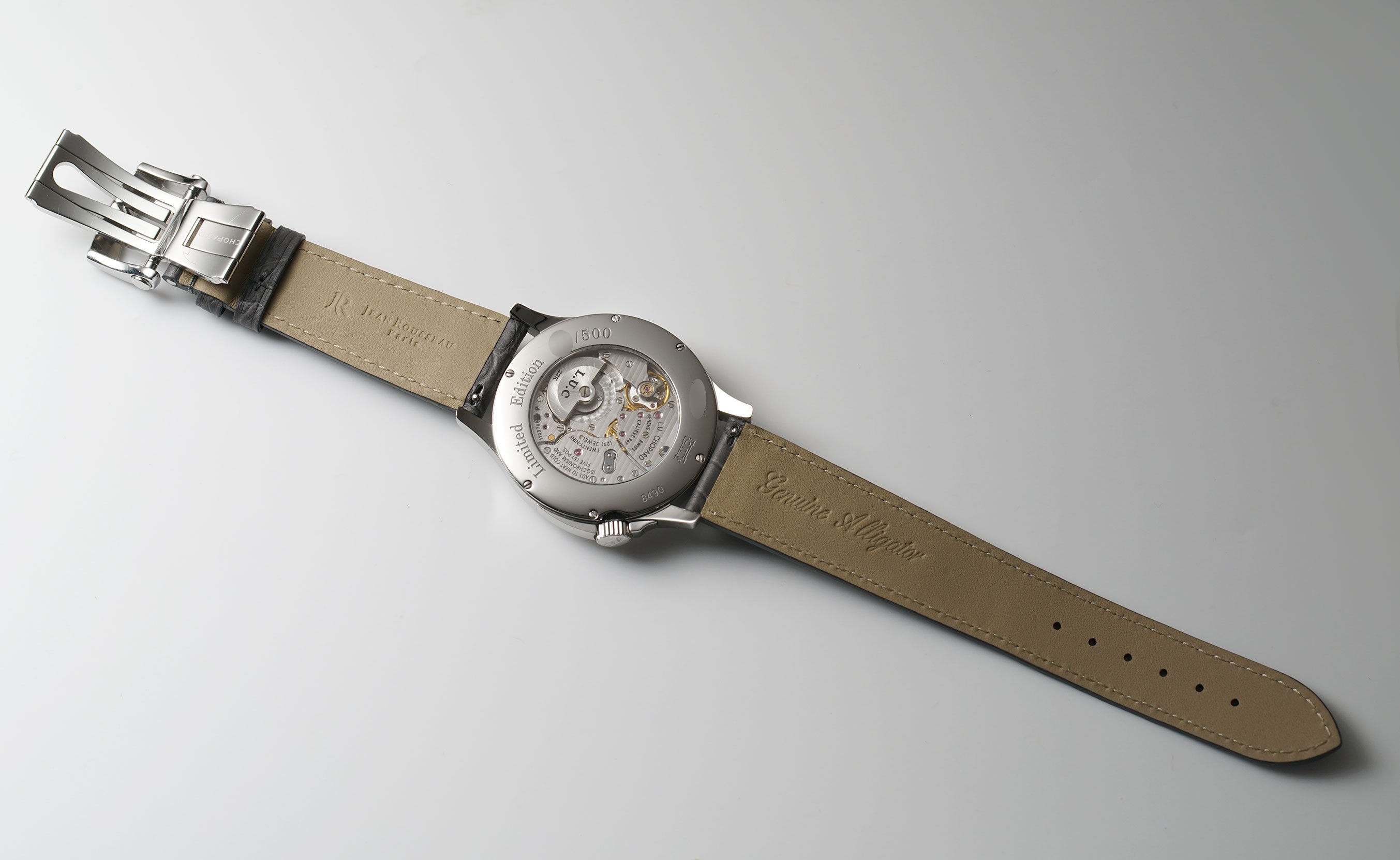 The case features a mirror-finished stainlaess steel, as does the bezel mounted atop. Contrary to the ordinary crown position, this model has it slightly twisted near the 4 o'clock position. It is paired with an unworn Jean Rousseau (high-quality Paris-made) grey leather strap that is accompanied by a stainless steel Chopard double-folding deployment buckle.