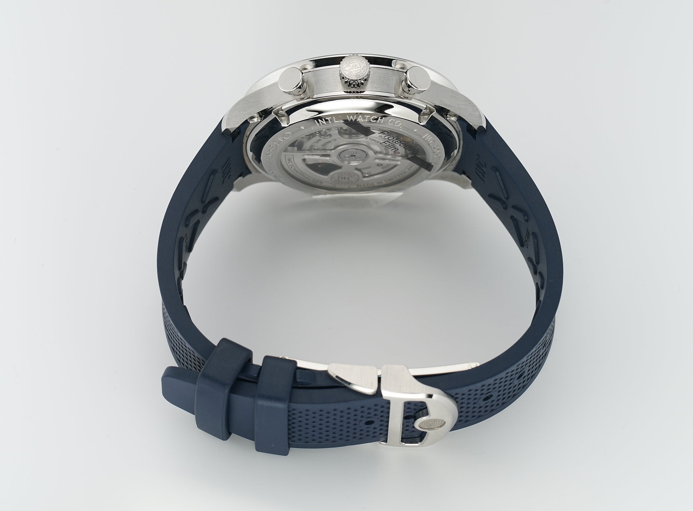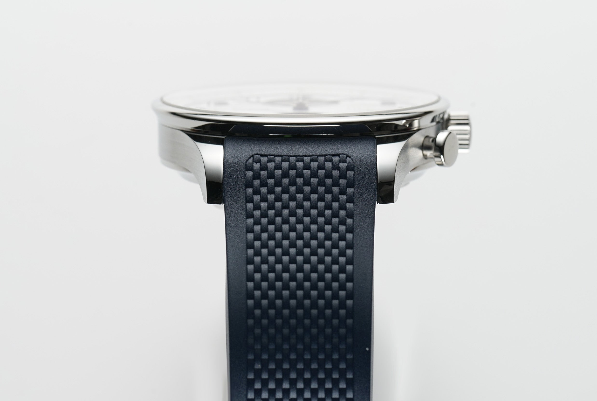 The case is made of stainless steel, displaying mostly a mirror finish with the exception of the sides which have a satin finish to them. It comes paired with a blue rubber strap that is accompanied by a stainless steel deployment buckle.