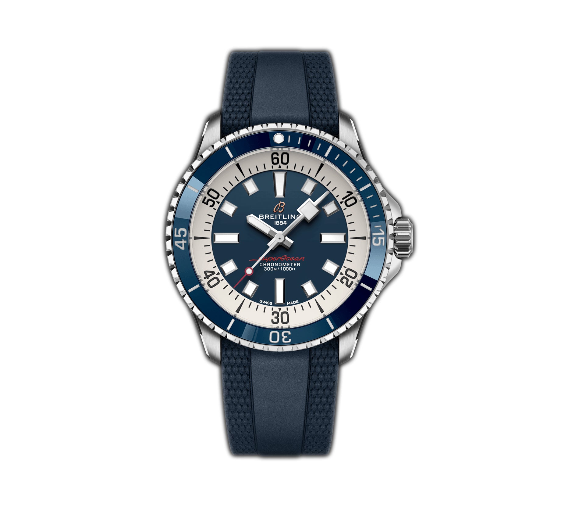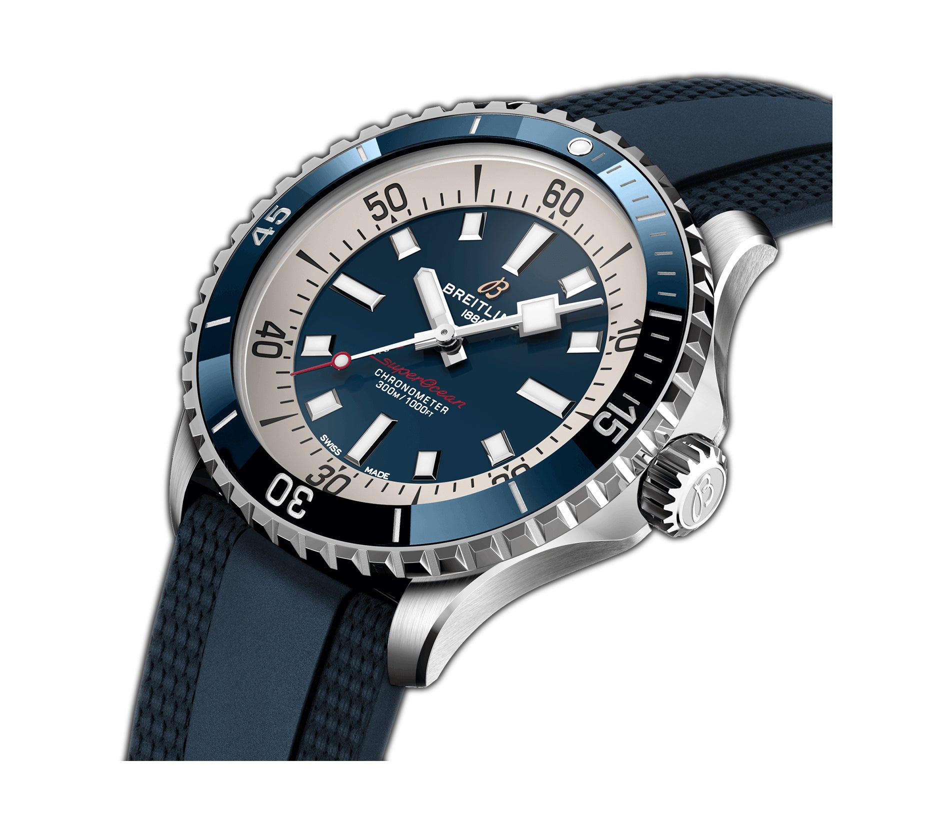 Case is made of stainless steel, most of which is brush-finished with the exception of of some highlights that are high-polished finish. Mounted atop a the case is a stainless steel bezel with a black ceramic divers bezel insert. The watch is presented on a blue rubber strap. This strap uses a deployment buckle.
