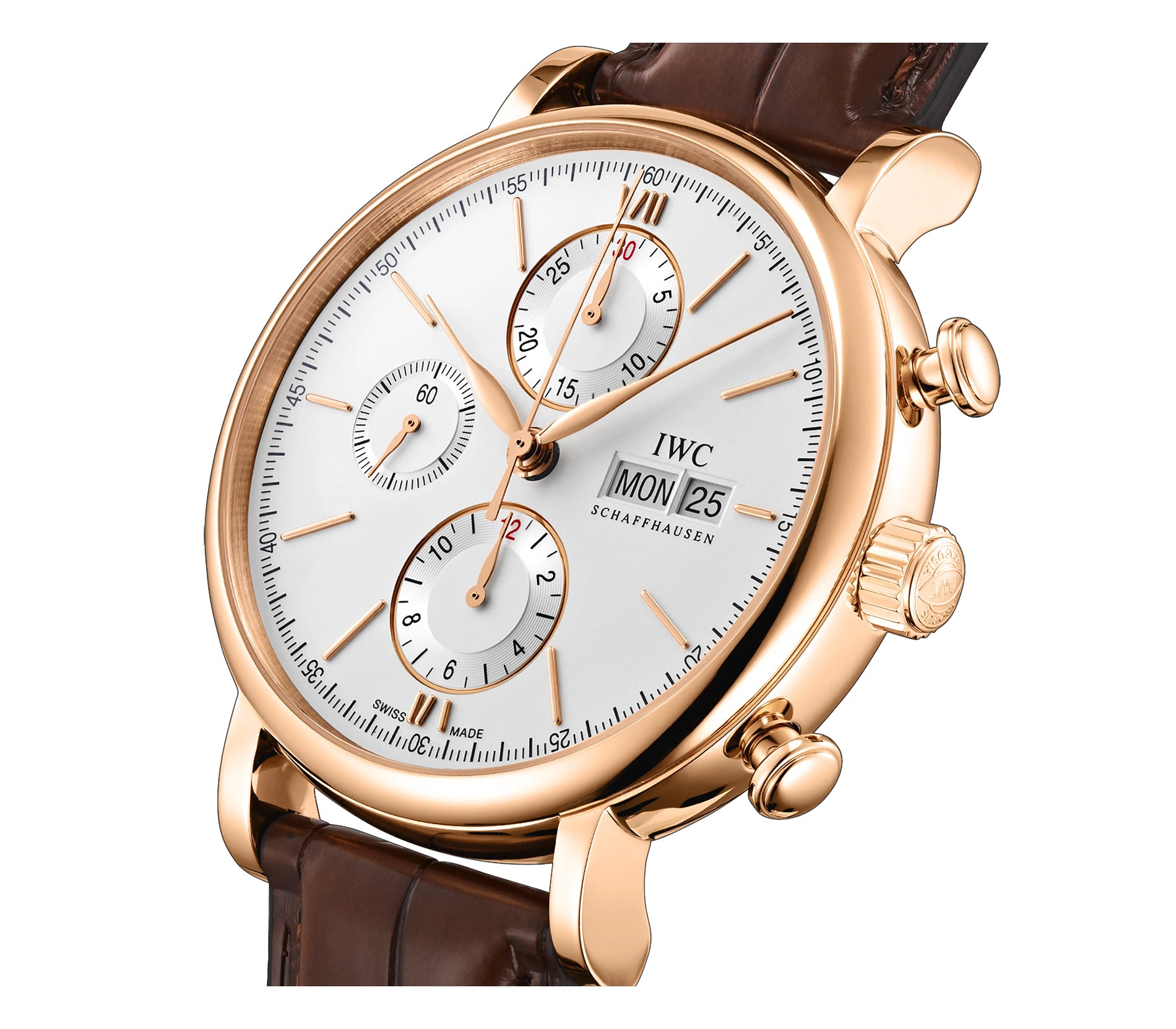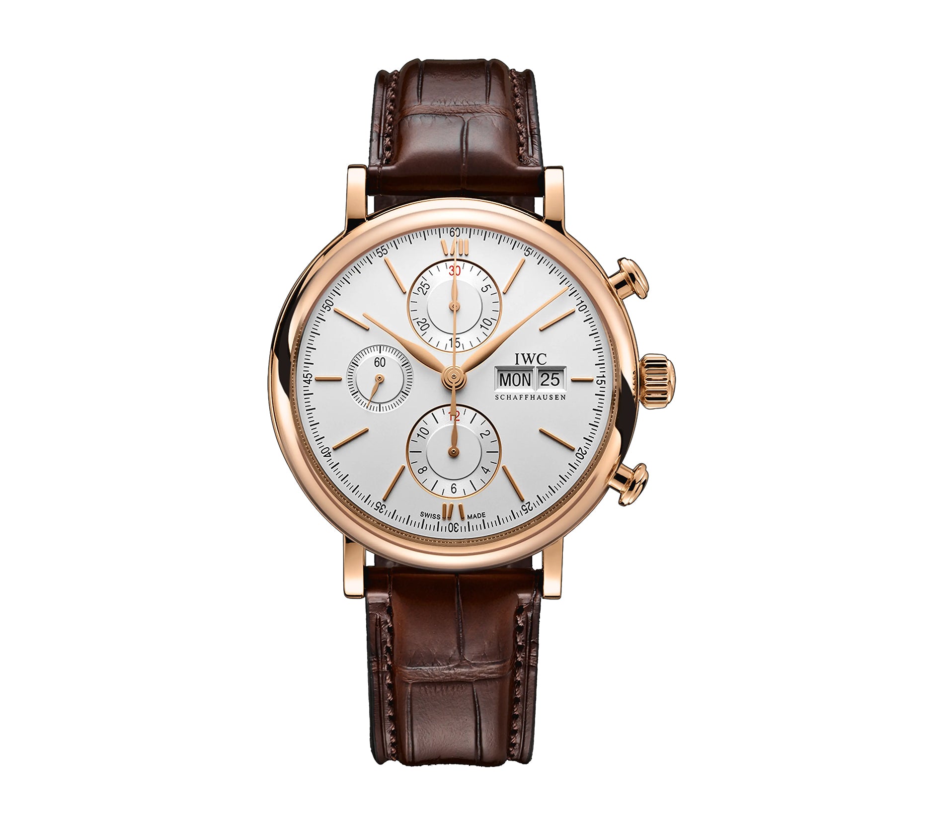 Case is made of mirror finished 18k rose gold as is the fixed bezel mounted atop. Back of the watch shows engraving of the view of the harbour at Portofino. Mounted atop is a brown alligator strap.