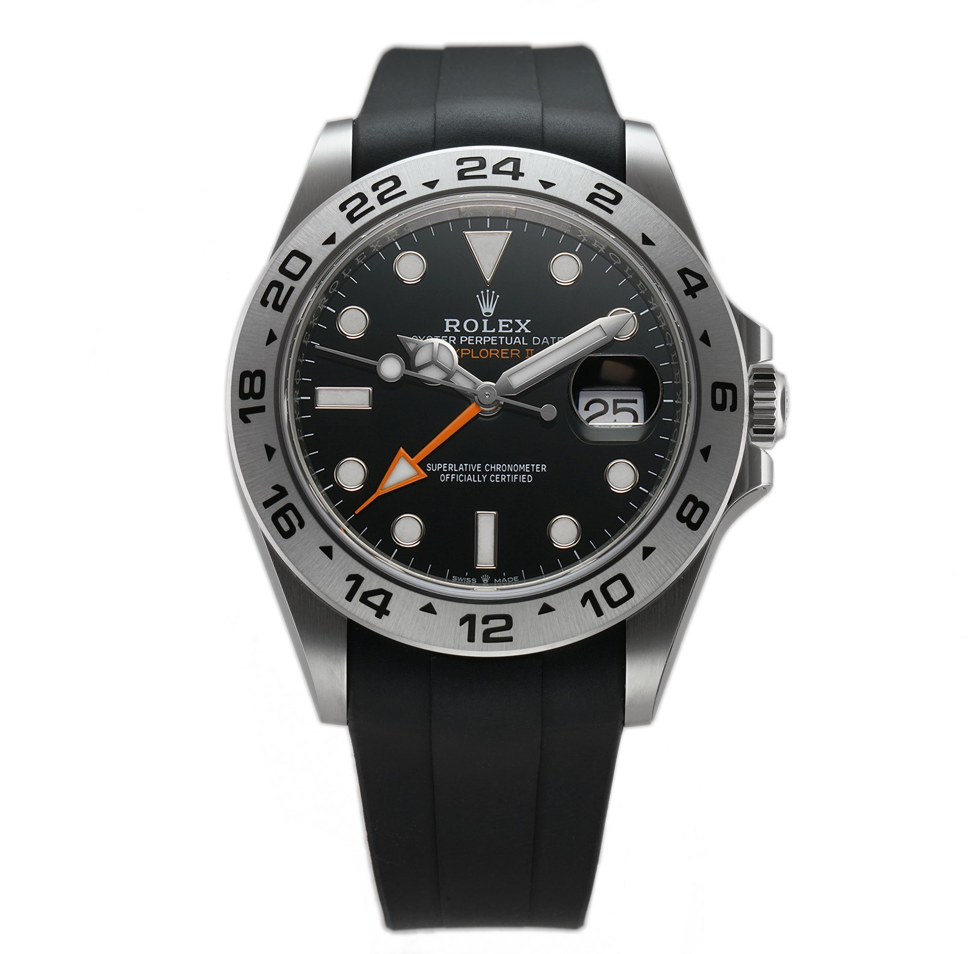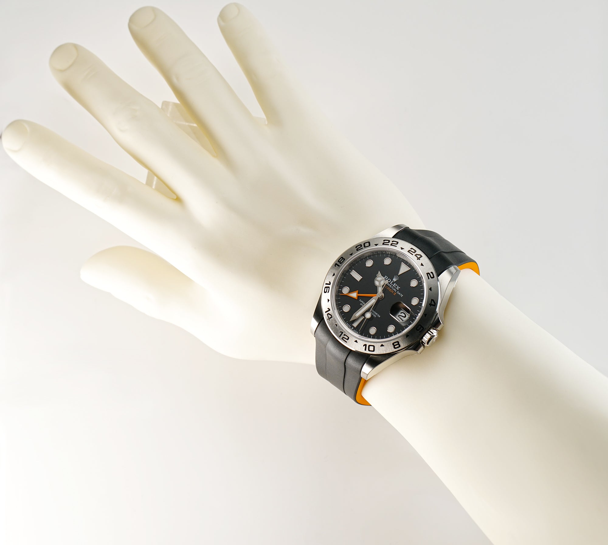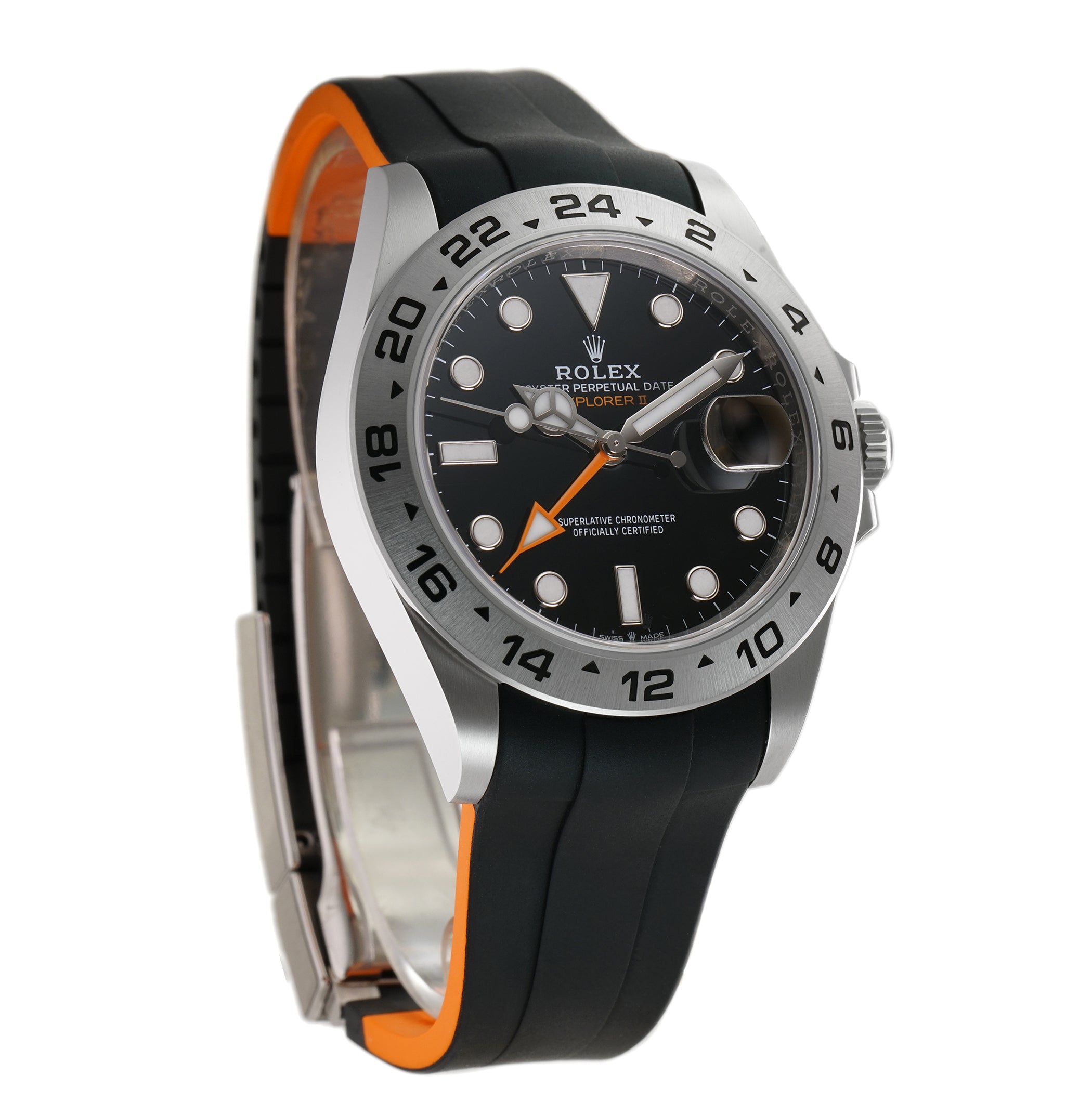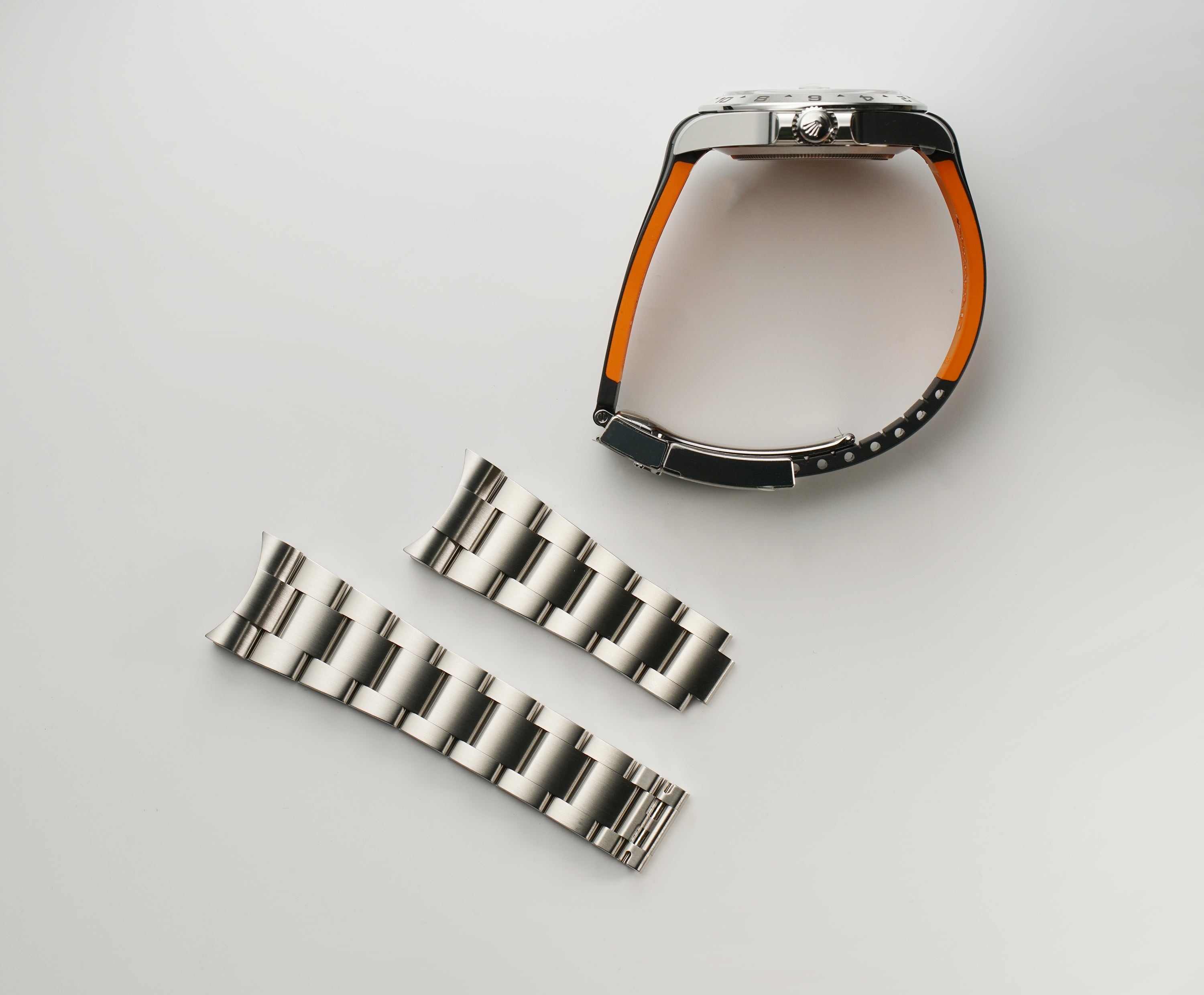 The watch comes with an unworn black RubberB strap that is compatible with the Rolex folding clasp. These straps use vulcanized rubber so much more durable and comfortable.