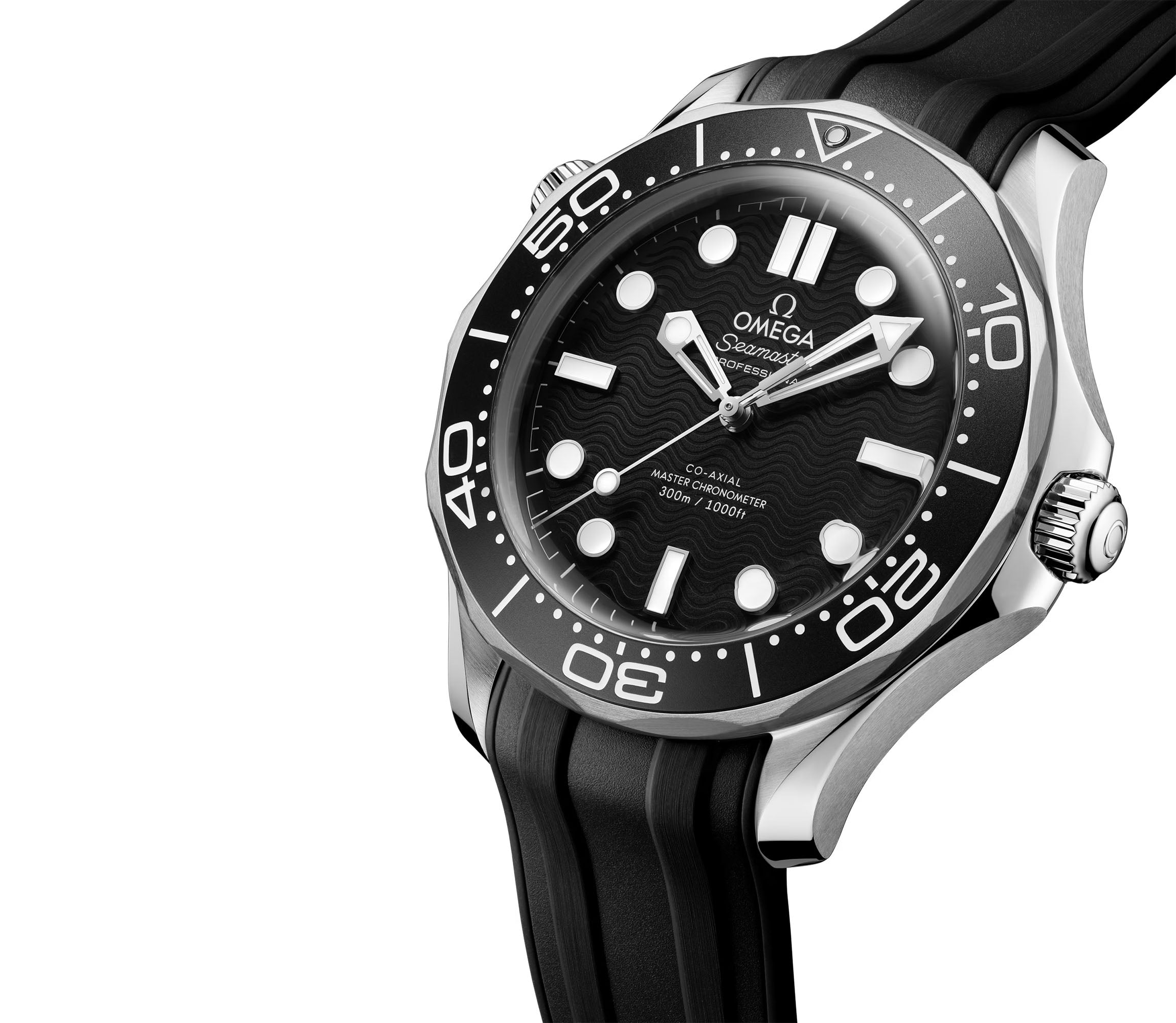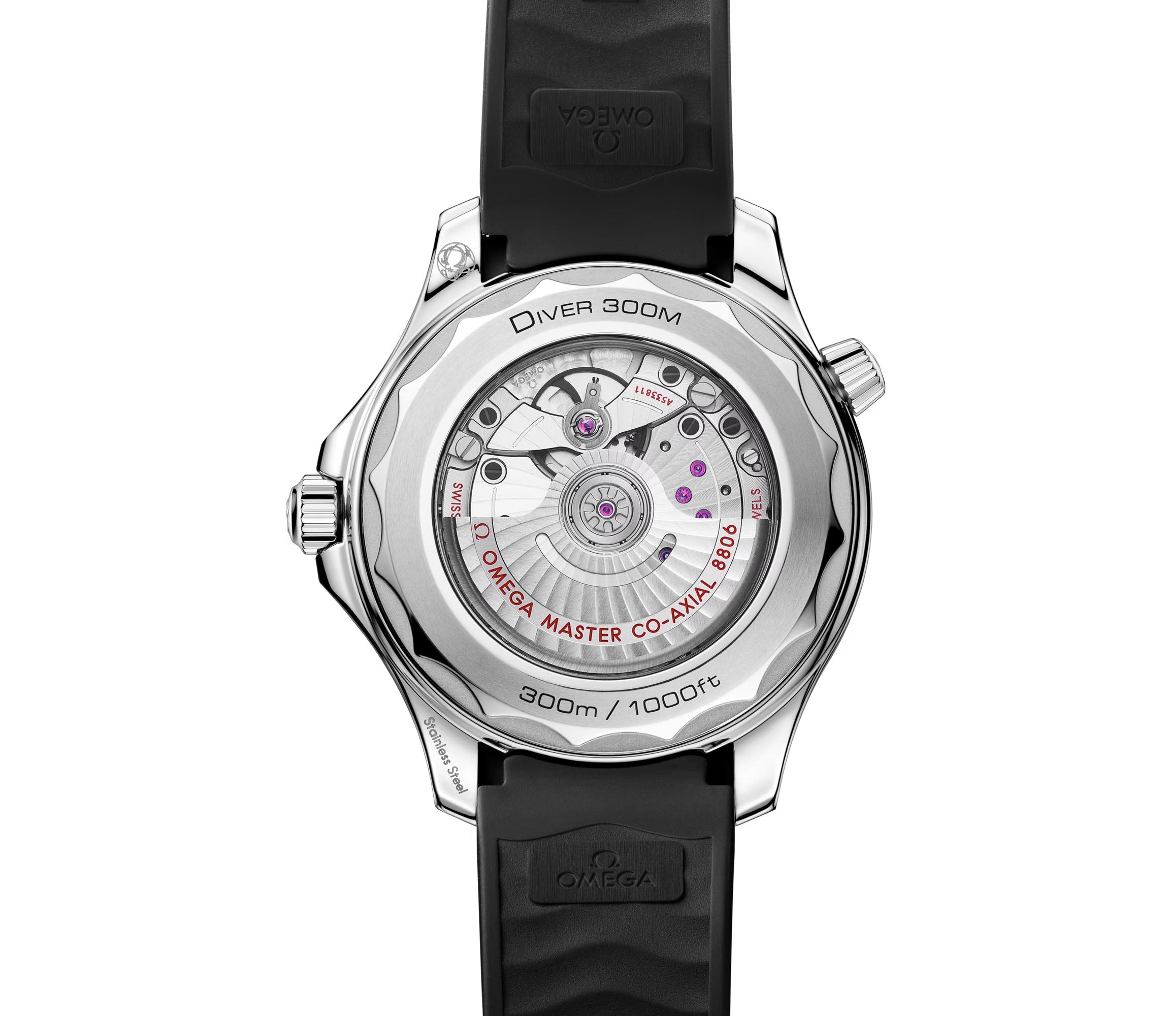 The case is made of a mirror finish stainless steel including the crown. Mounted atop the case is a mirror finish stainless steel bezel with a black ceramic divers insert. Paired with the watch is a rubber strap with a stainless steel folding clasp.