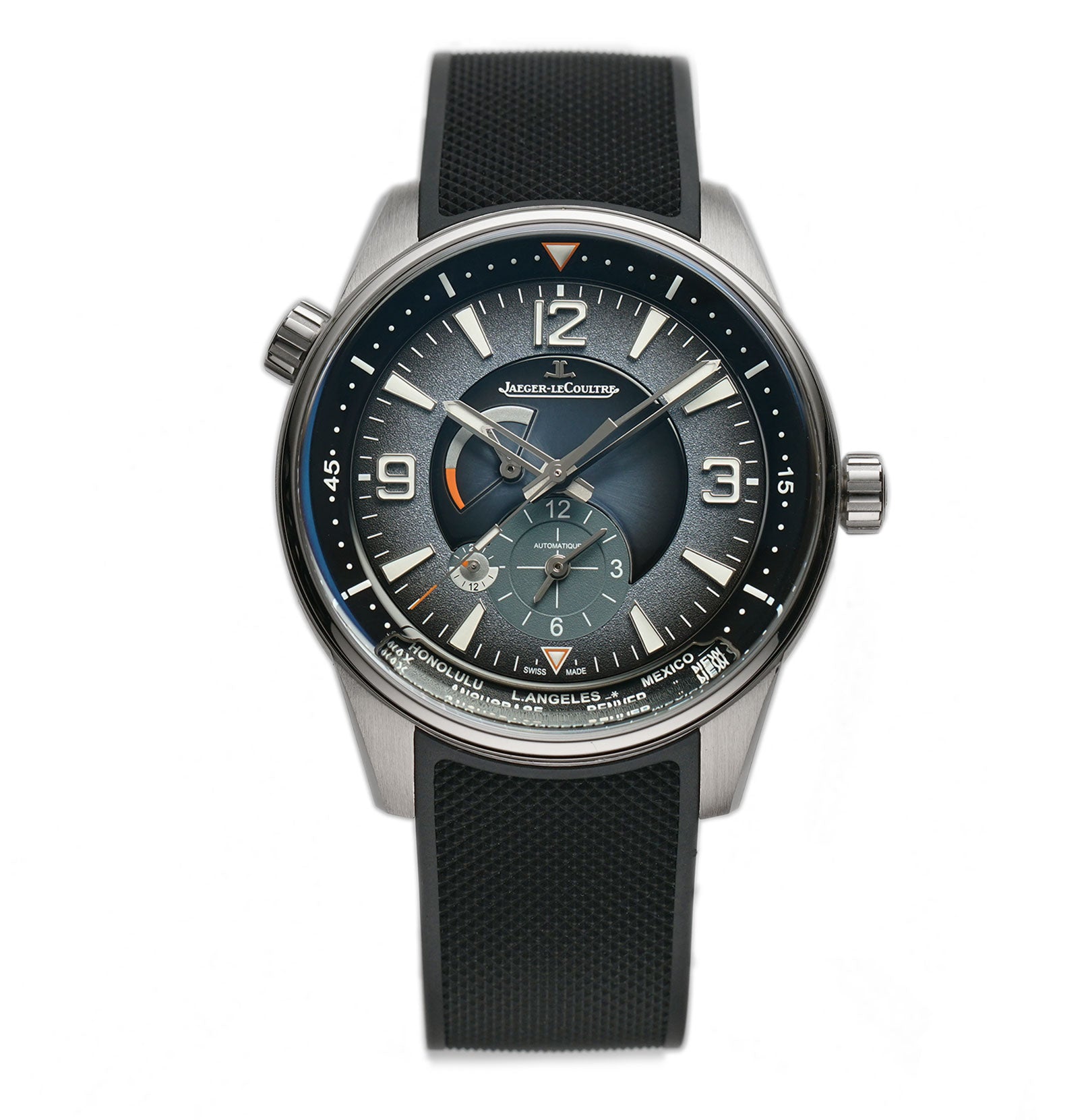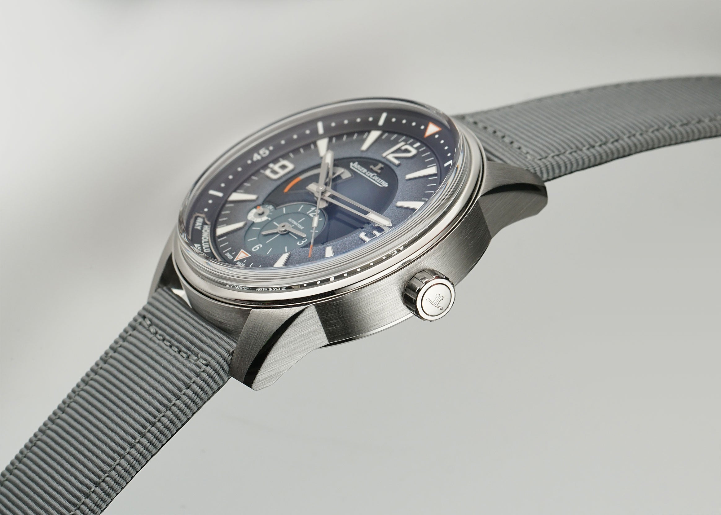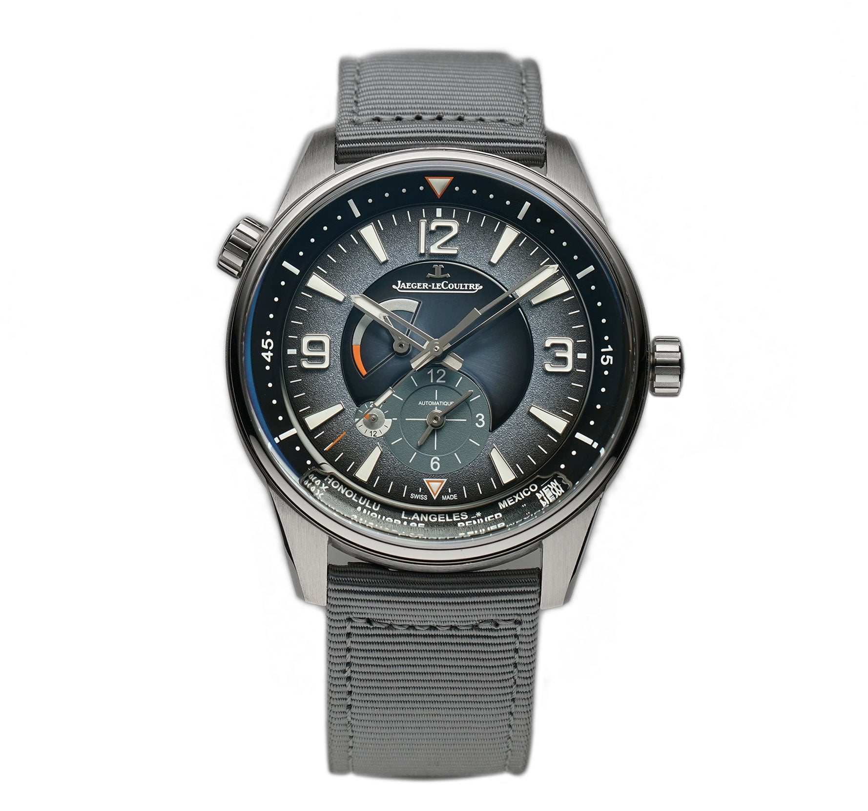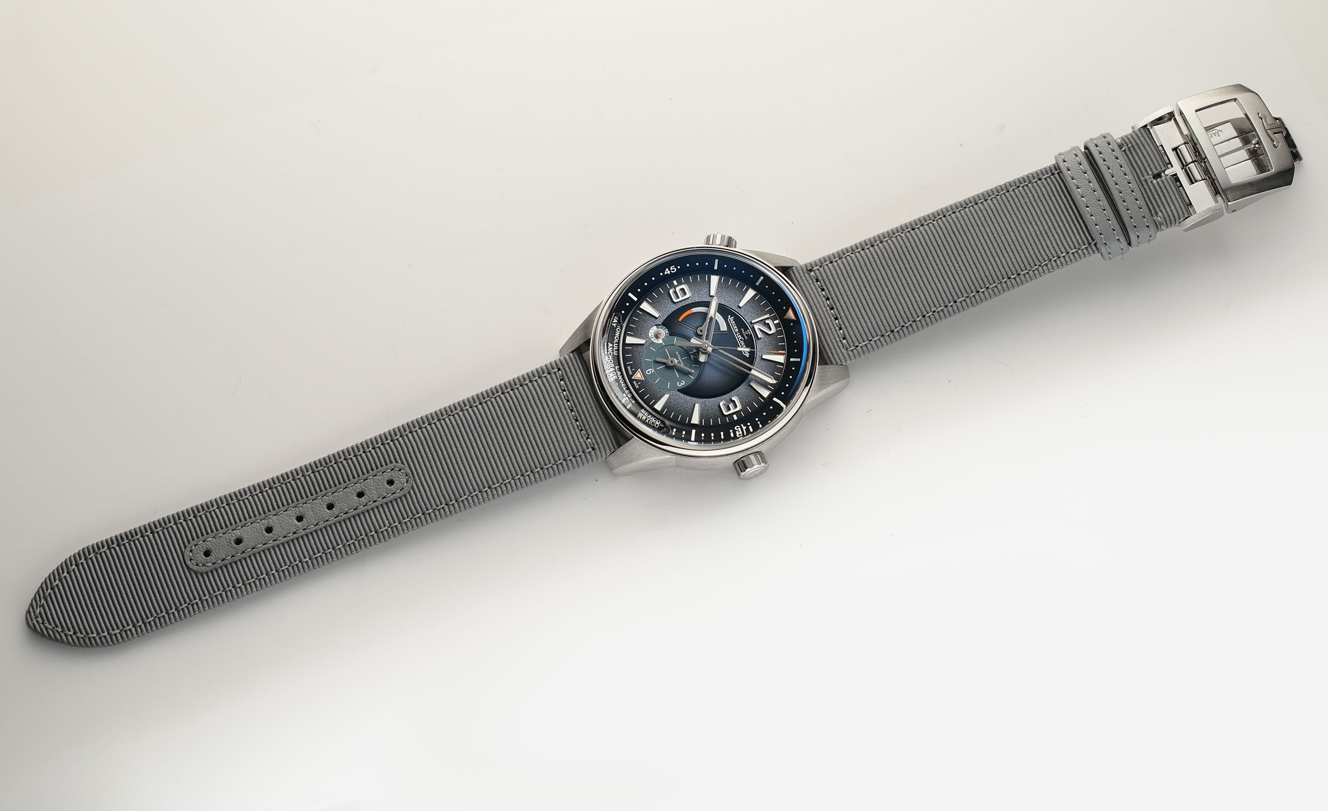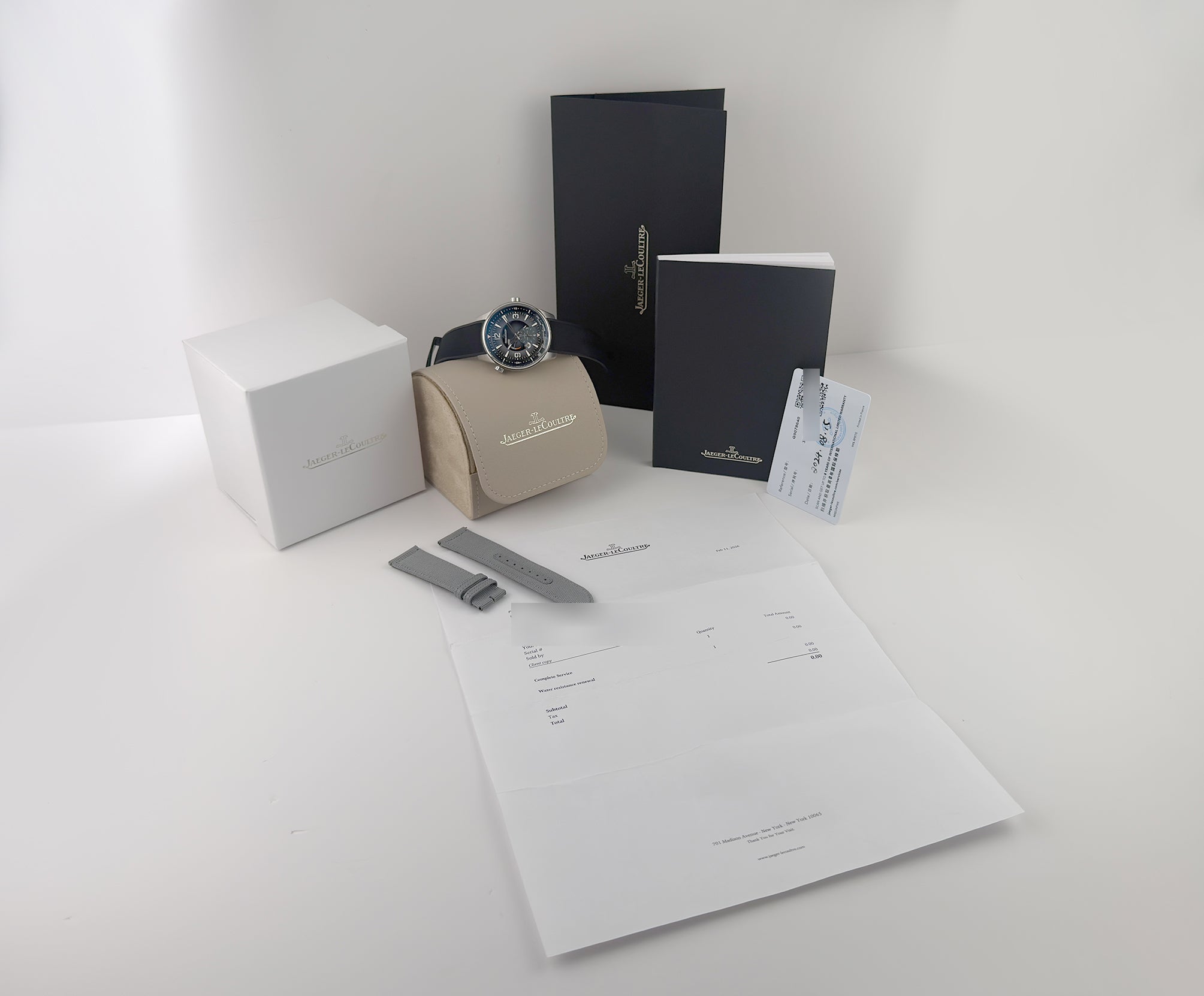 Included with the watch is a JLC travel box (the original JLC presentation box is not included), original warranty card dated 2024 and an additional unworn JLC gray blue canvas strap.
