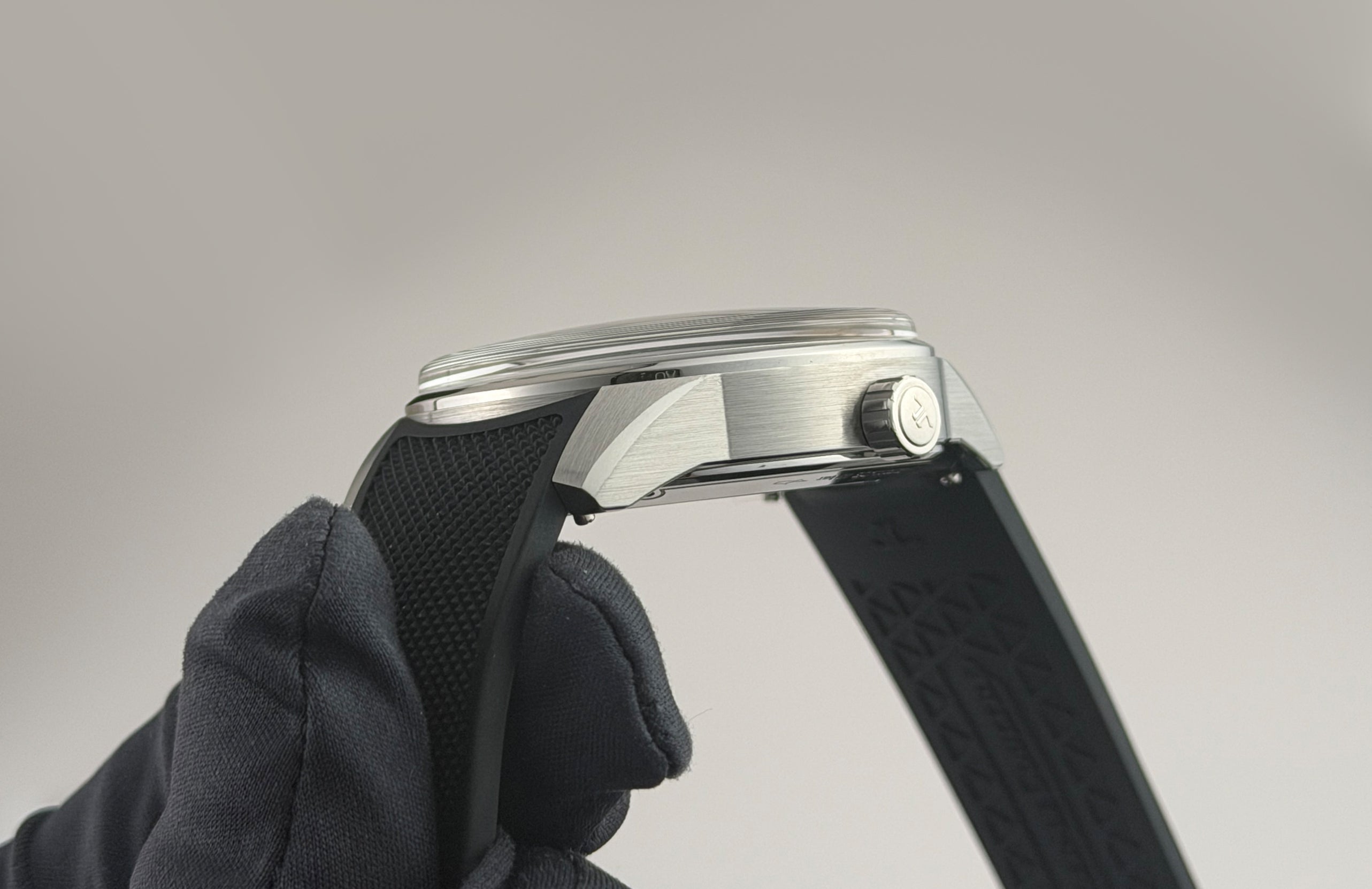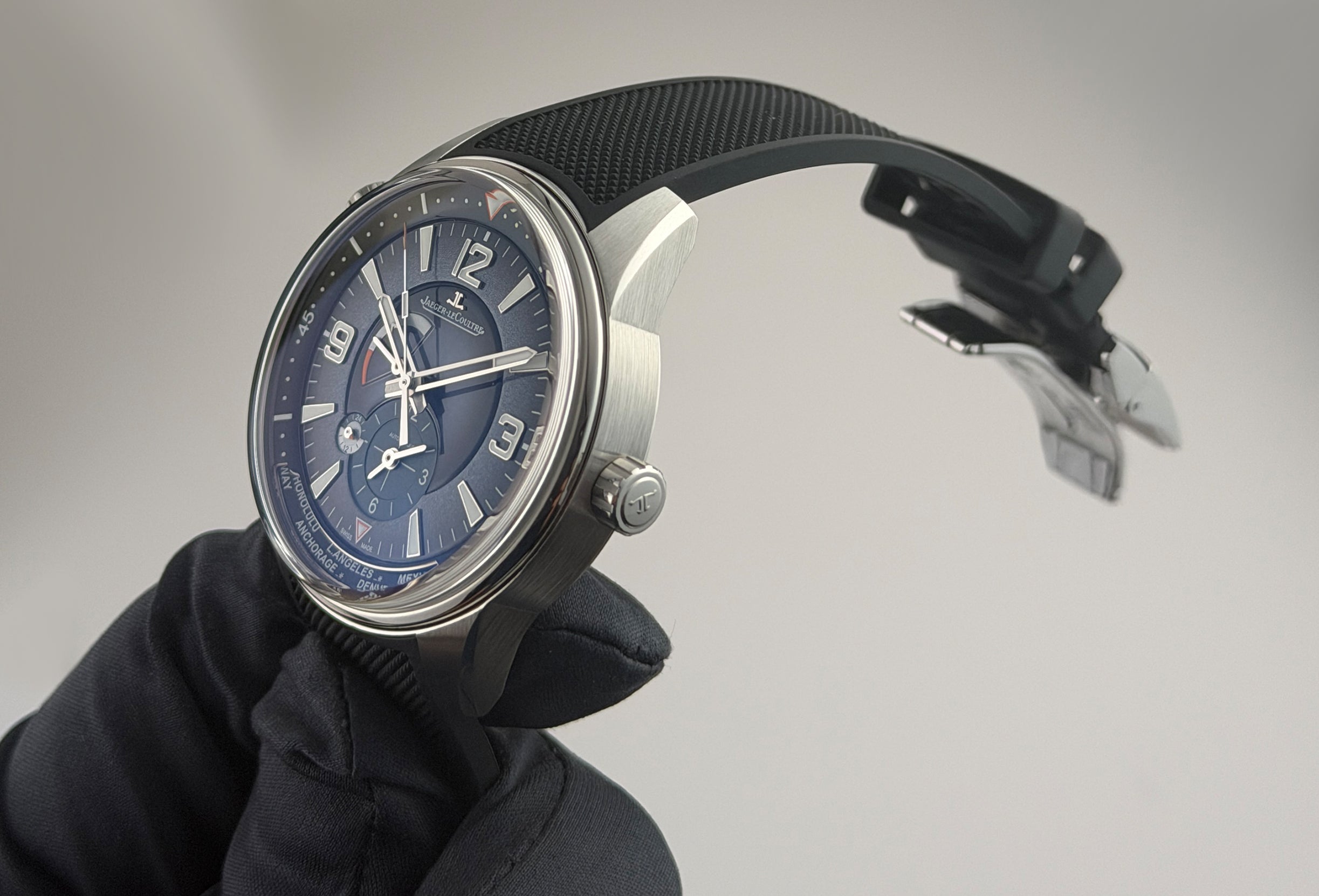 The case is made of stainless steel, displaying mostly a satin finish with the exception of the beveled edges that have a mirror finish. Both the bezel and the crown are of a mirror-finished stainless steel. It is currently mounted on the original JLC black rubber strap (approximately 85% condition) and that is paired with a JLC double-folding deployment buckle.