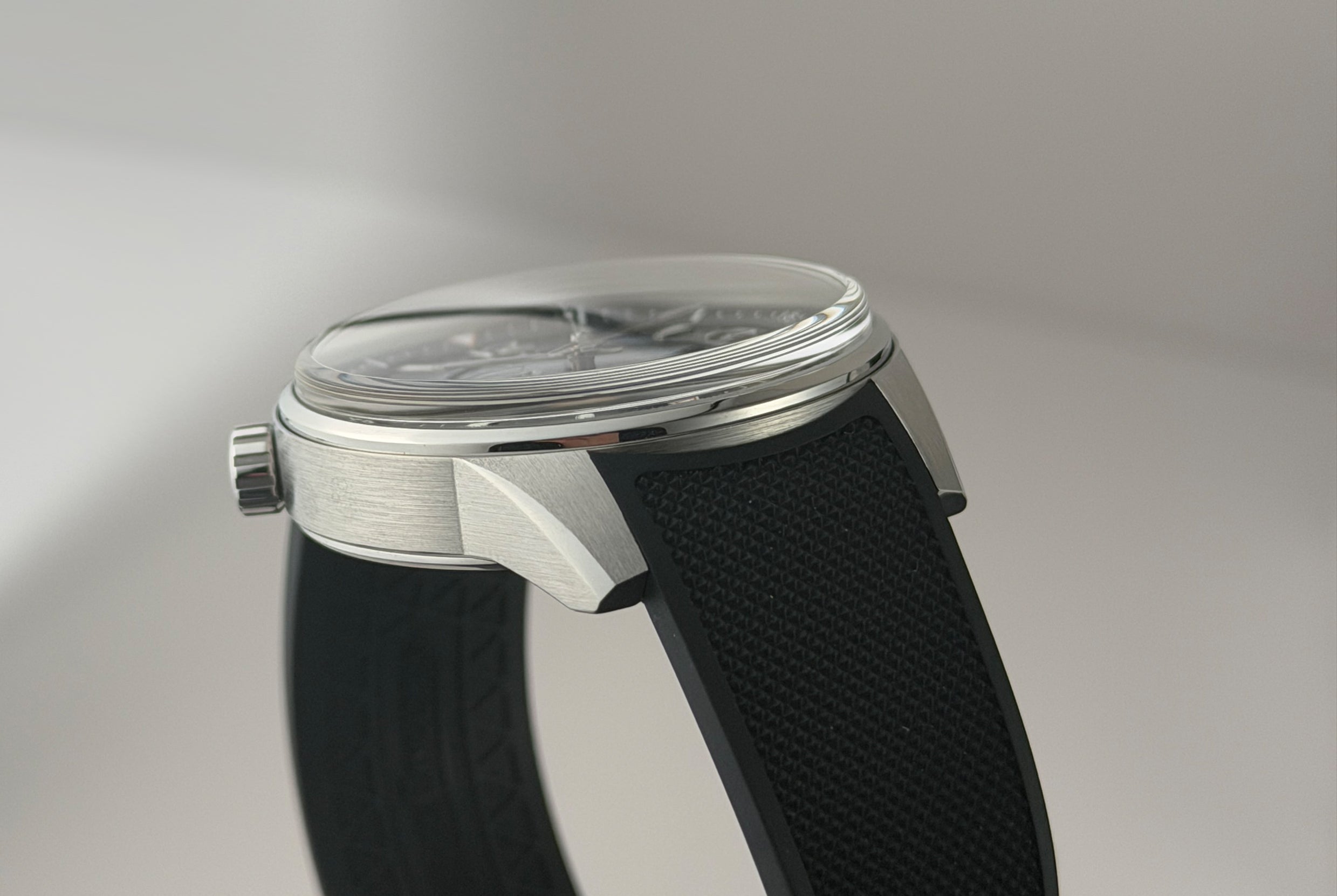Functions are displayed on an ocean gray (gray with a hint of blue) dial that is accompanied by luminescent filled hands and hour markers. Those functions include hours, minutes, seconds, 24-hour display, second time zone, power reserve and geographic display.