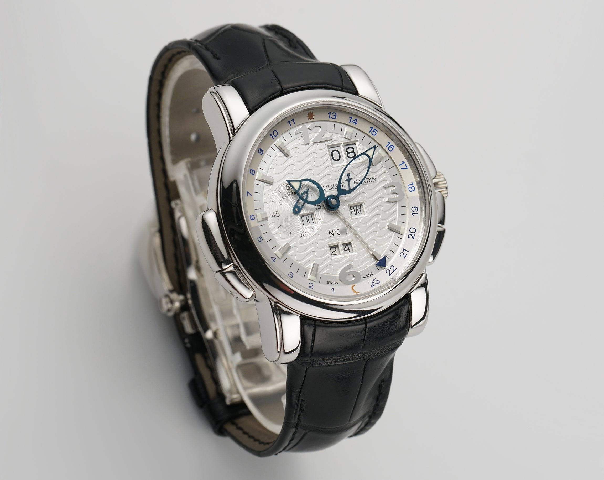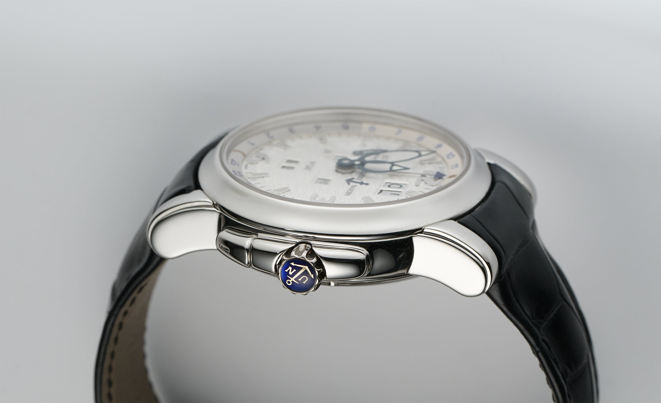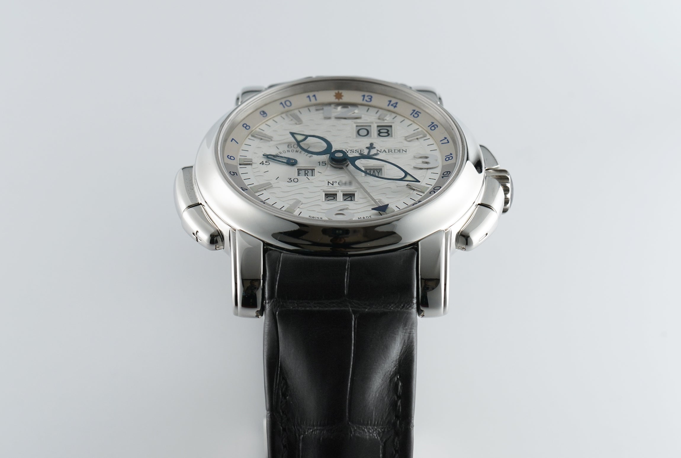The case is made of a mirror-finished platinum, as is the case back rim and bezel mounted atop. Currently mounted on the watch is a Ulysse Nardin black leather strap (unworn condition) that is paired with a Ulysse Nardin platinum double-folding deployment clasp.