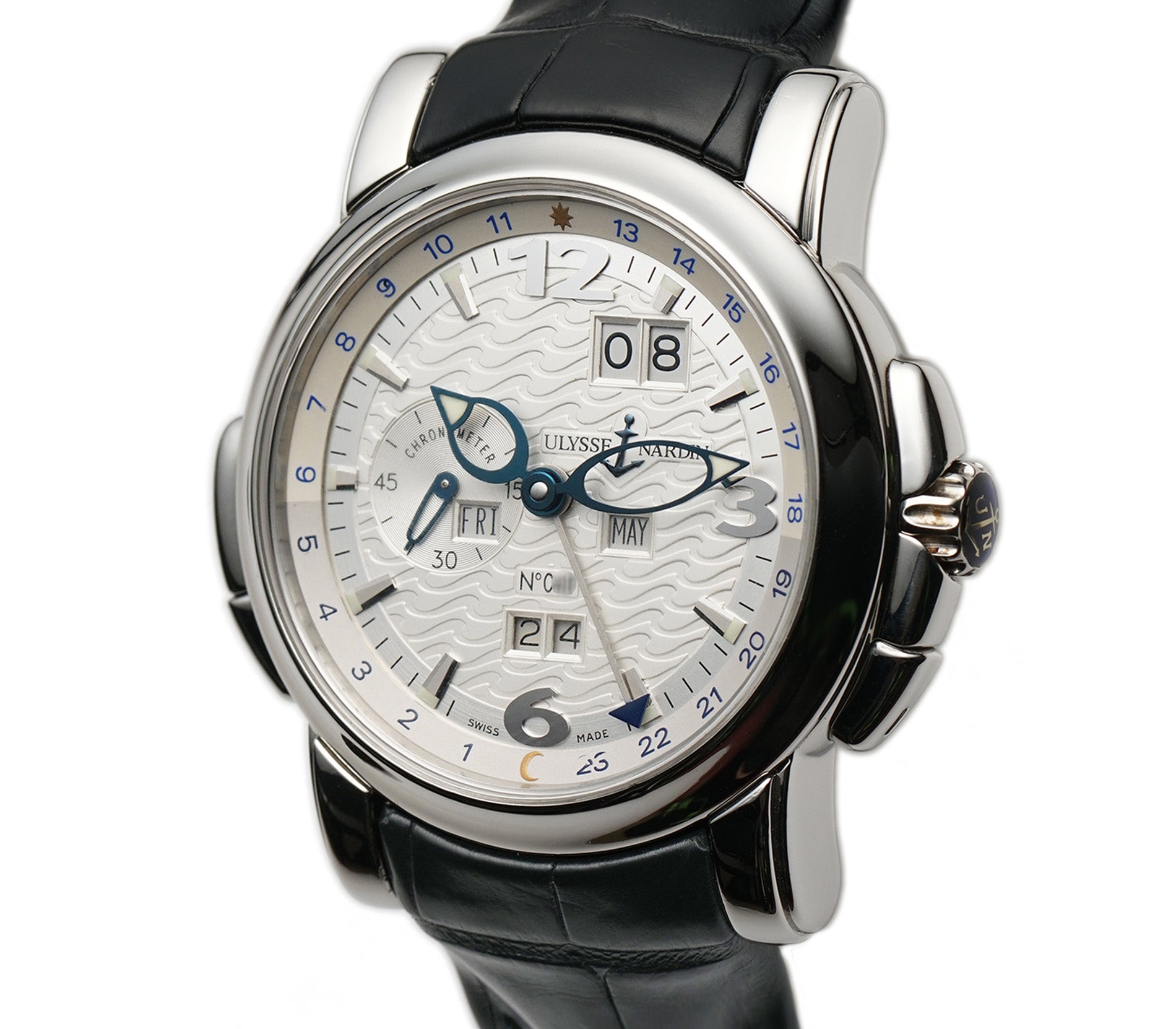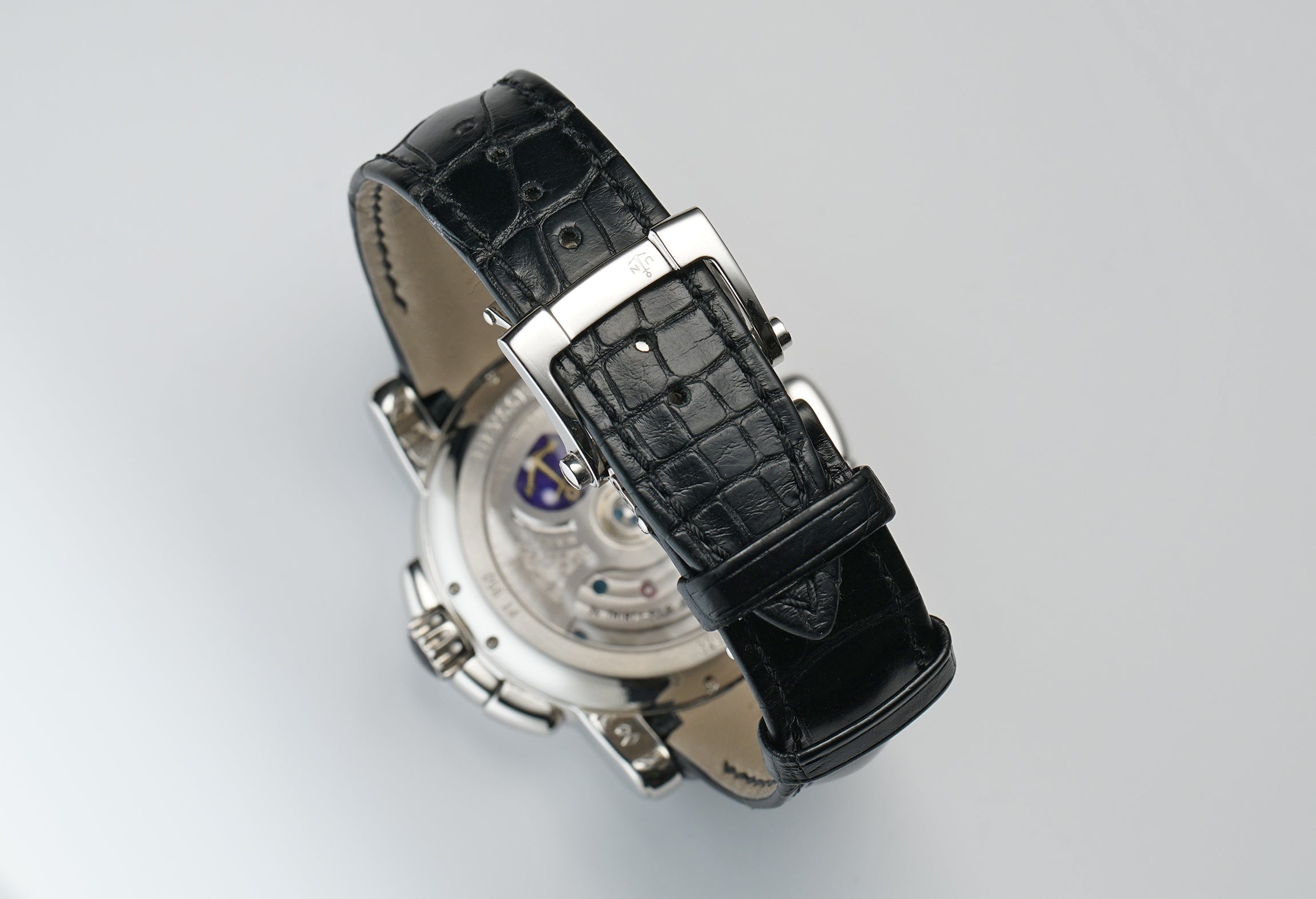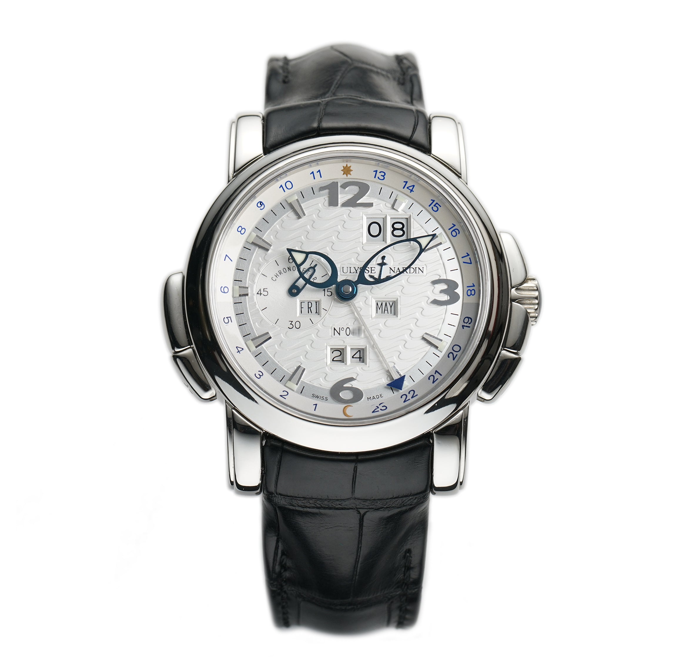 The case is made of a mirror-finished platinum, as is the case back rim and bezel mounted atop. Currently mounted on the watch is a Ulysse Nardin black leather strap (unworn condition) that is paired with a Ulysse Nardin platinum double-folding deployment clasp.
