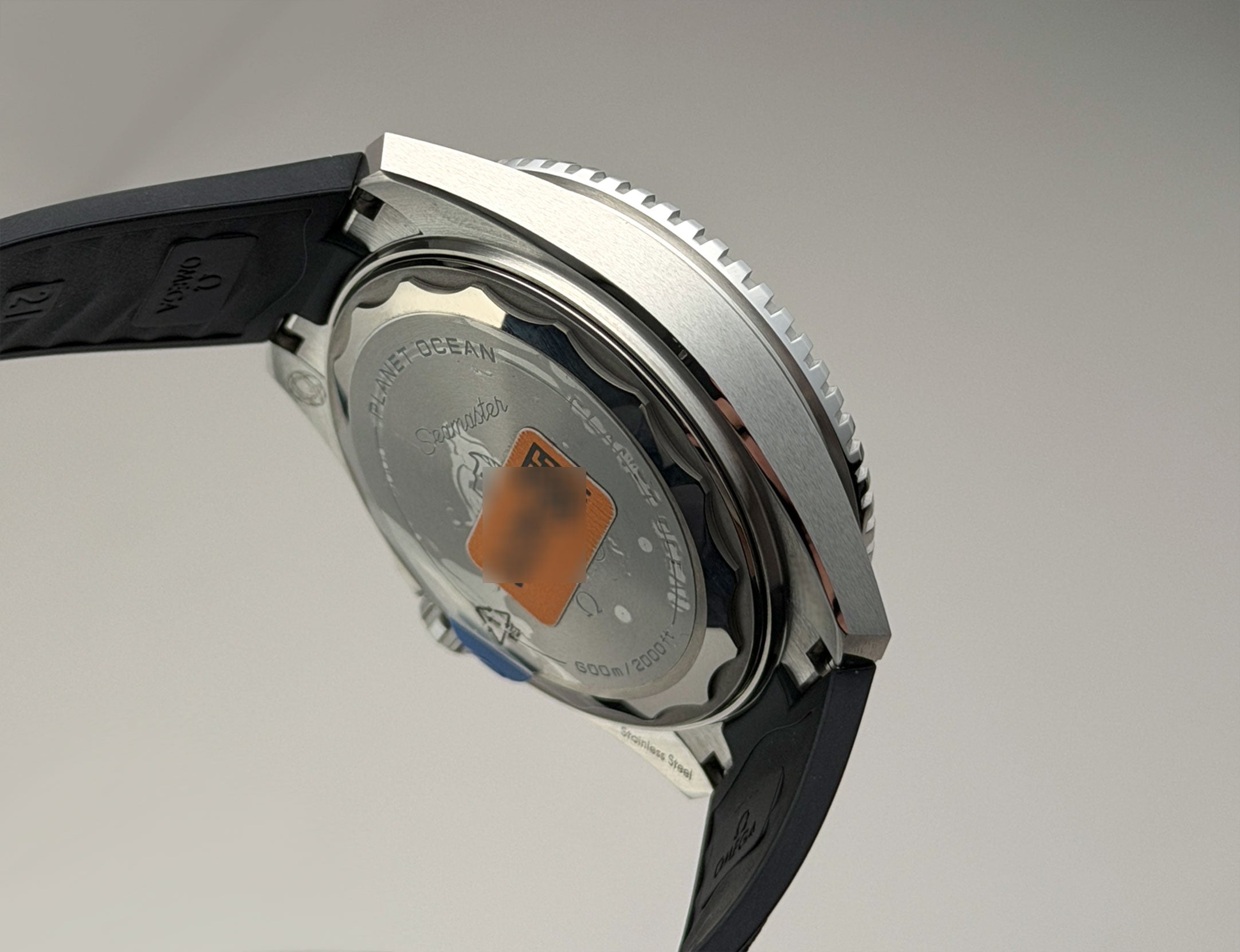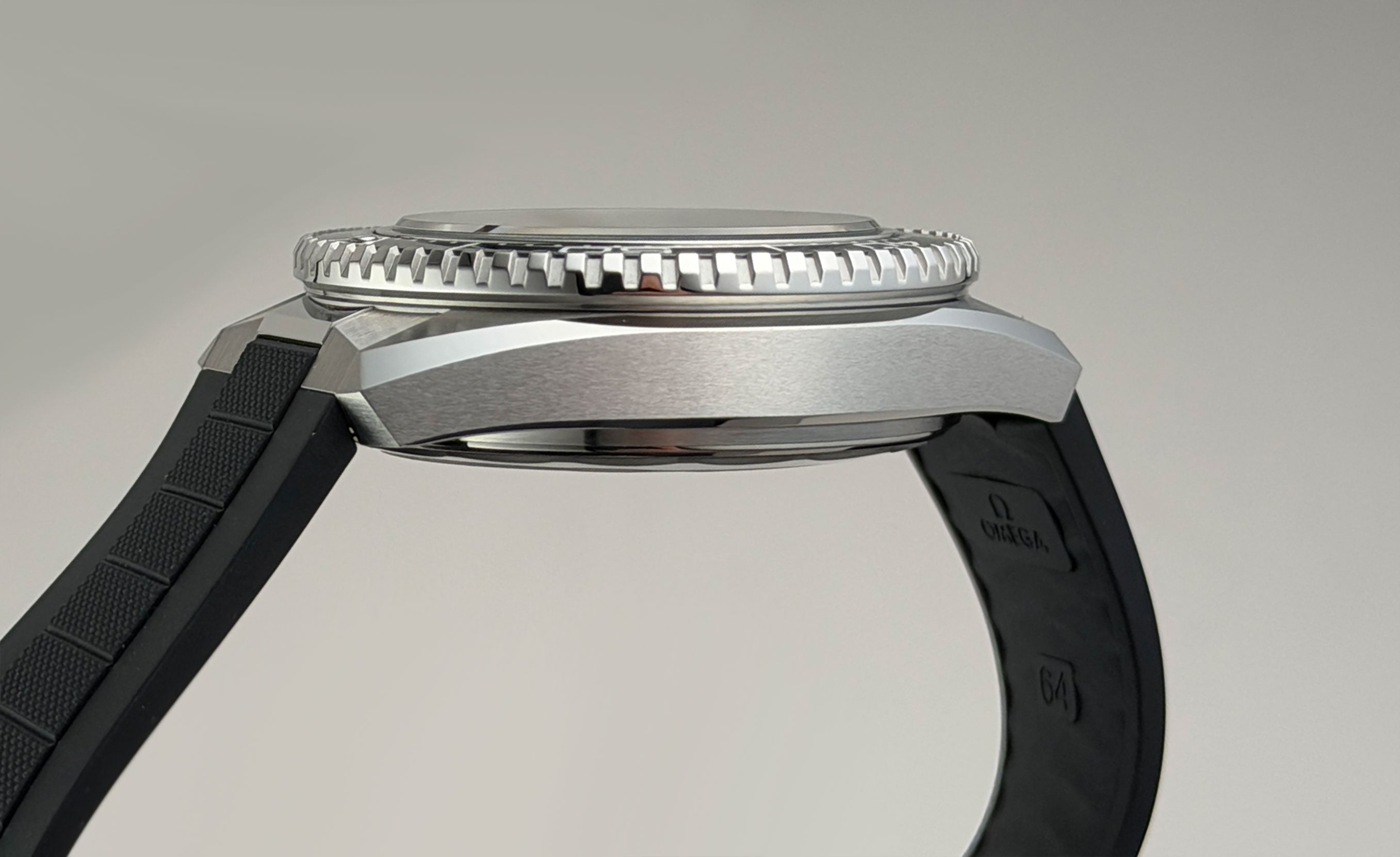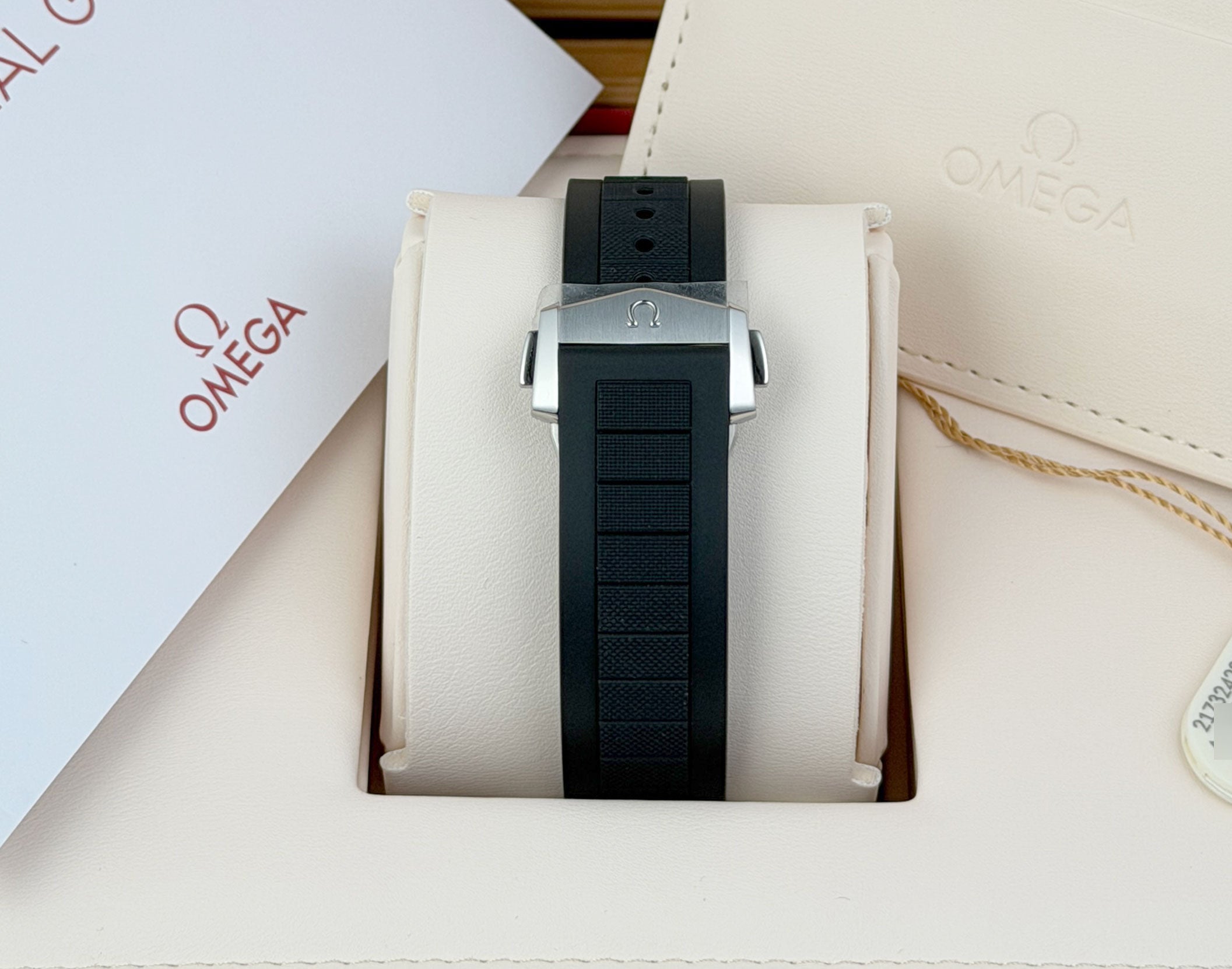 The case is made with combination of satin and mirror finished stainless steel. Mounted atop the case is a unidirectional bezel equipped with a black ceramic diver's bezel insert. The case back of the watch is made from mirror and satin finished grade 5 titanium and displays OMEGA’s famous seahorse emblem. The watch is paired with a black rubber strap with a stainless steel deployment clasp.