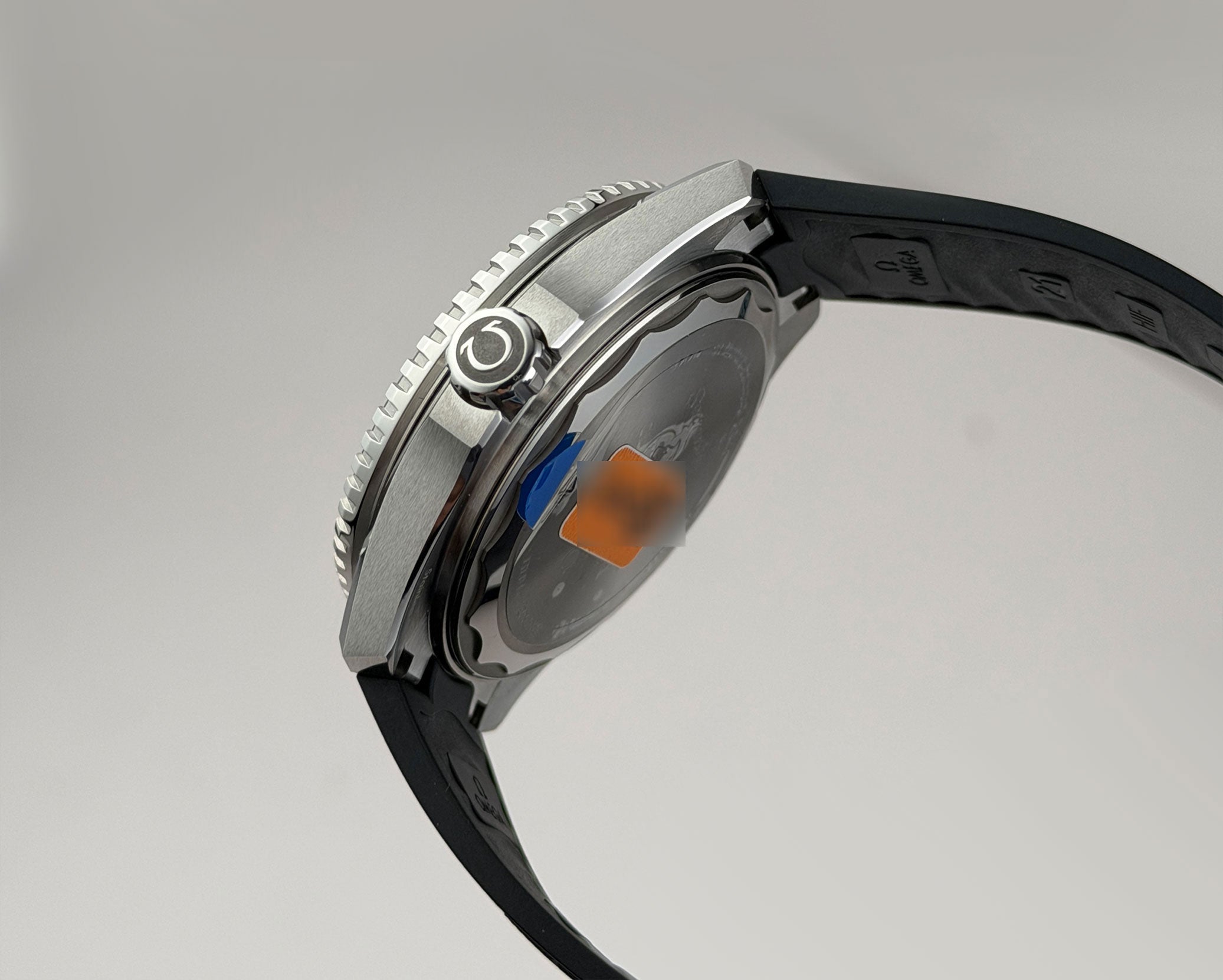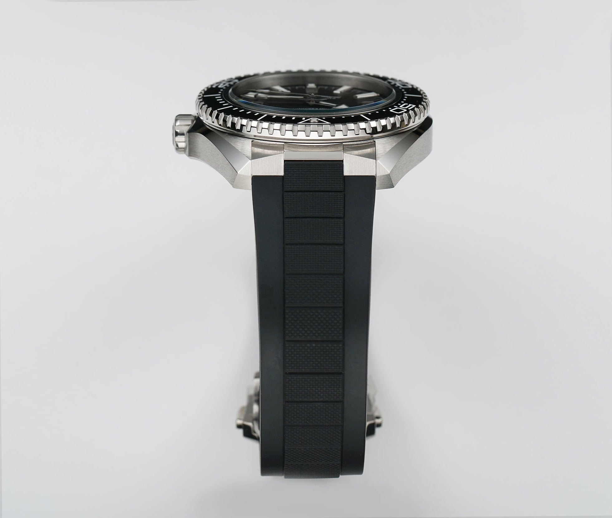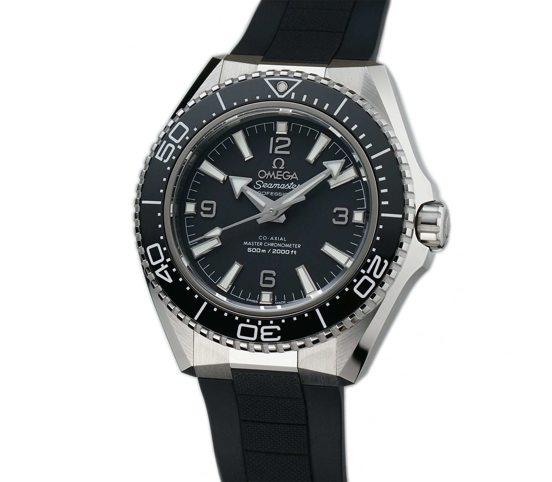 The case is made with combination of satin and mirror finished stainless steel. Mounted atop the case is a unidirectional bezel equipped with a black ceramic diver's bezel insert. The case back of the watch is made from mirror and satin finished grade 5 titanium and displays OMEGA’s famous seahorse emblem. The watch is paired with a black rubber strap with a stainless steel deployment clasp.