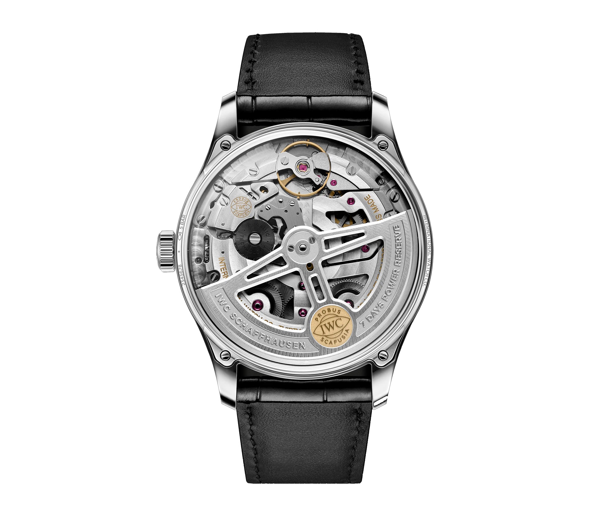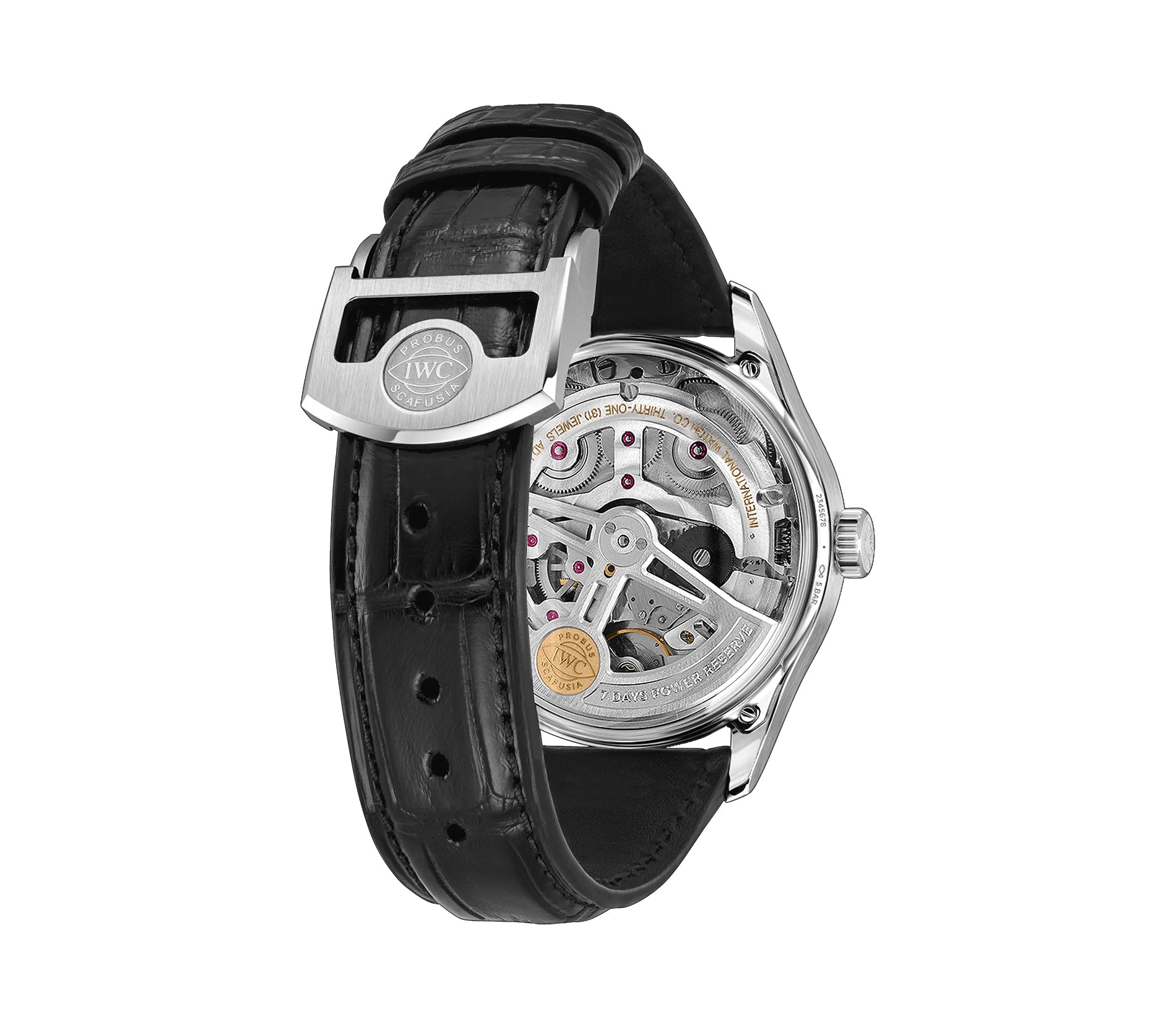 Case is made of stainless steel with mirror finished steel lugs and satin finished sides. The case back is see-through and the bezel mounted atop the case is mirror finished stainless steel. Mounted on the watch is a IWC black leather strap that is accompanied by an IWC stainless steel folding clasp.