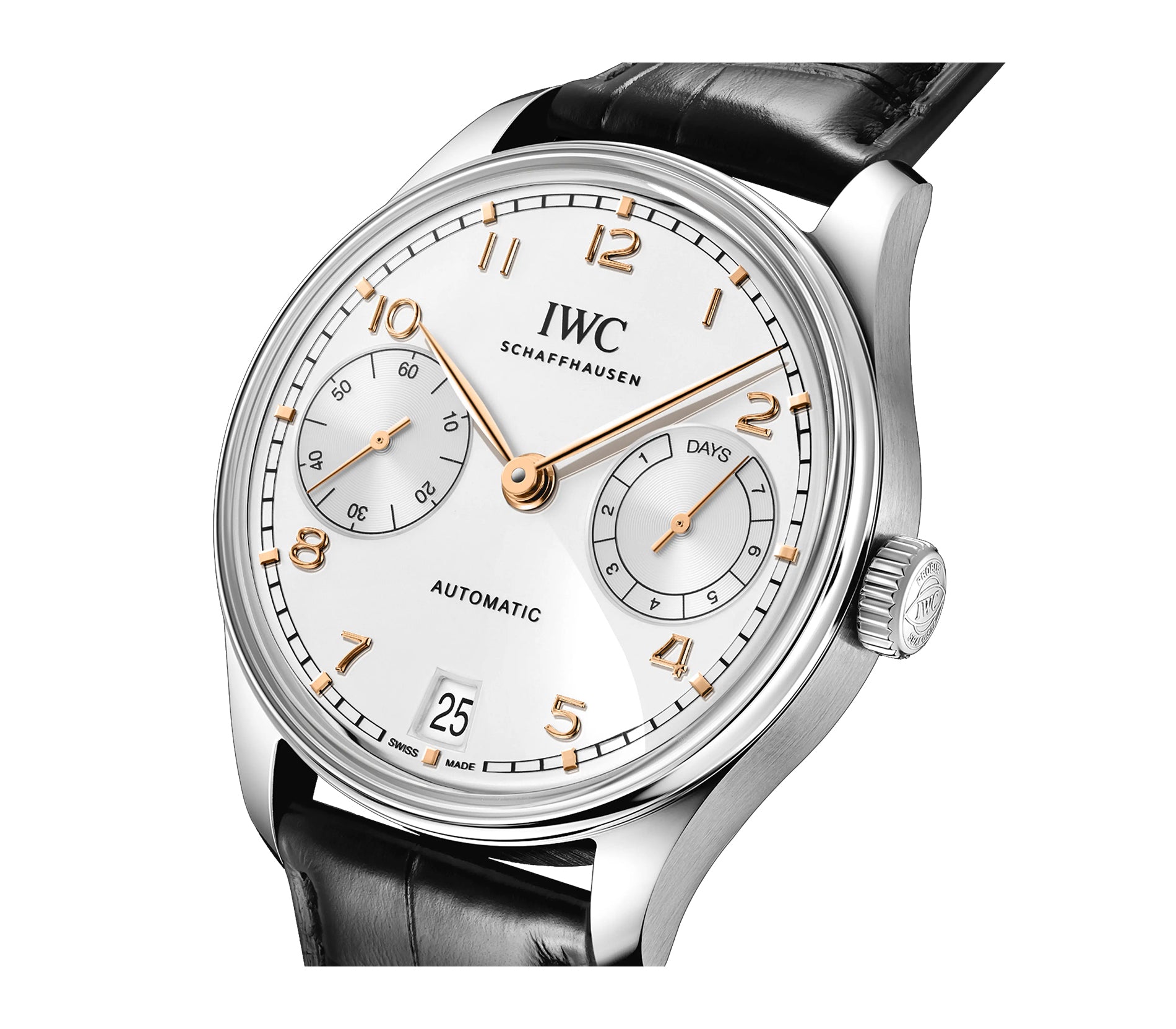 Functions are displayed on a silver dial with rose gold hands and arabic numeral hour markers. Featured on the dial is hours, date, small-seconds sub-dial at 9 o'clock and power reserve indicator at 3 o'clock position.
