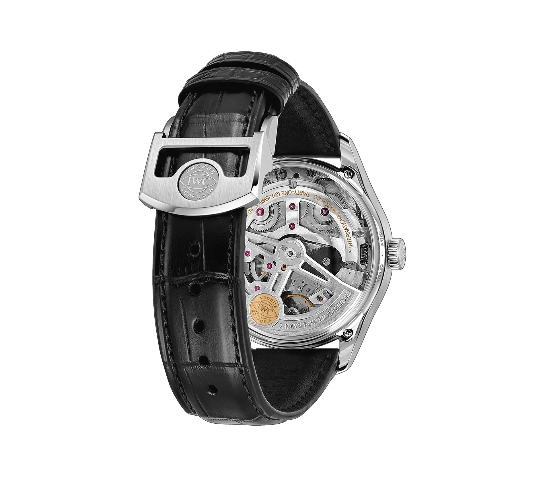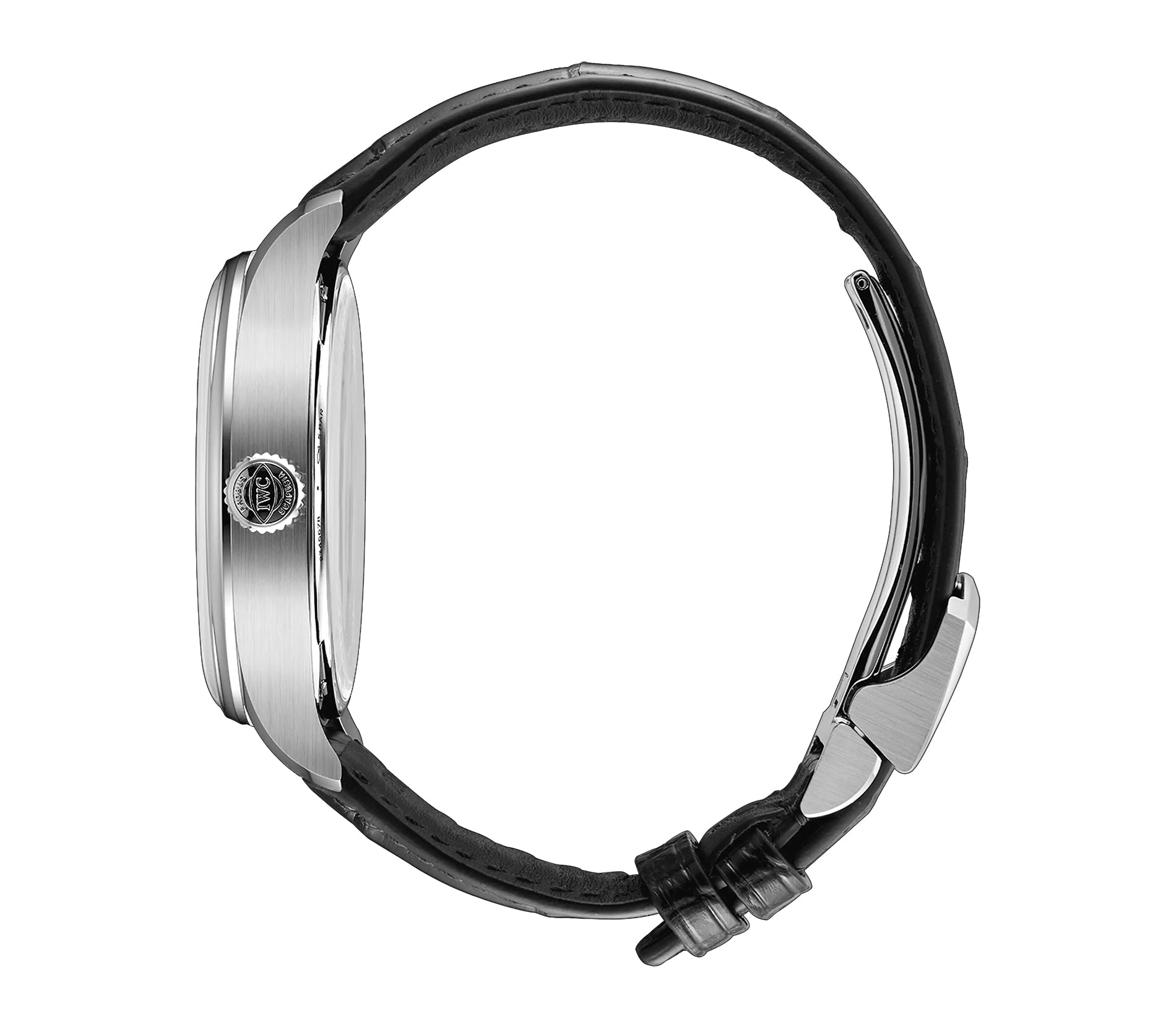 Case is made of stainless steel with mirror finished steel lugs and satin finished sides. The case back is see-through and the bezel mounted atop the case is mirror finished stainless steel. Mounted on the watch is a IWC black alligator leather strap that is accompanied by an IWC stainless steel folding clasp.