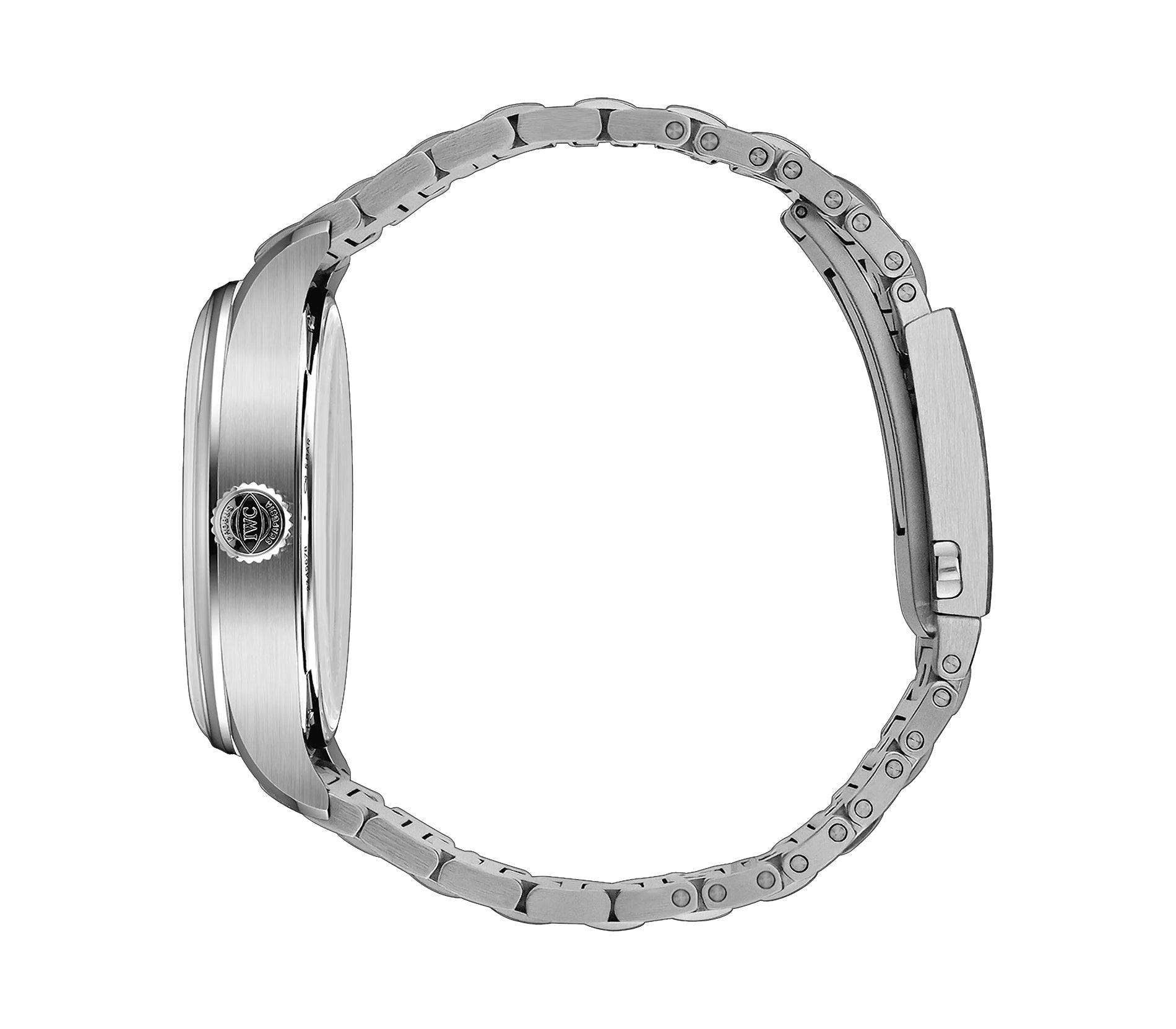 Case is made of stainless steel with mirror finished steel lugs and satin finished sides. The case back is see-through and the bezel mounted atop the case is mirror finished stainless steel. This watch is paired with a stainless steel bracelet.