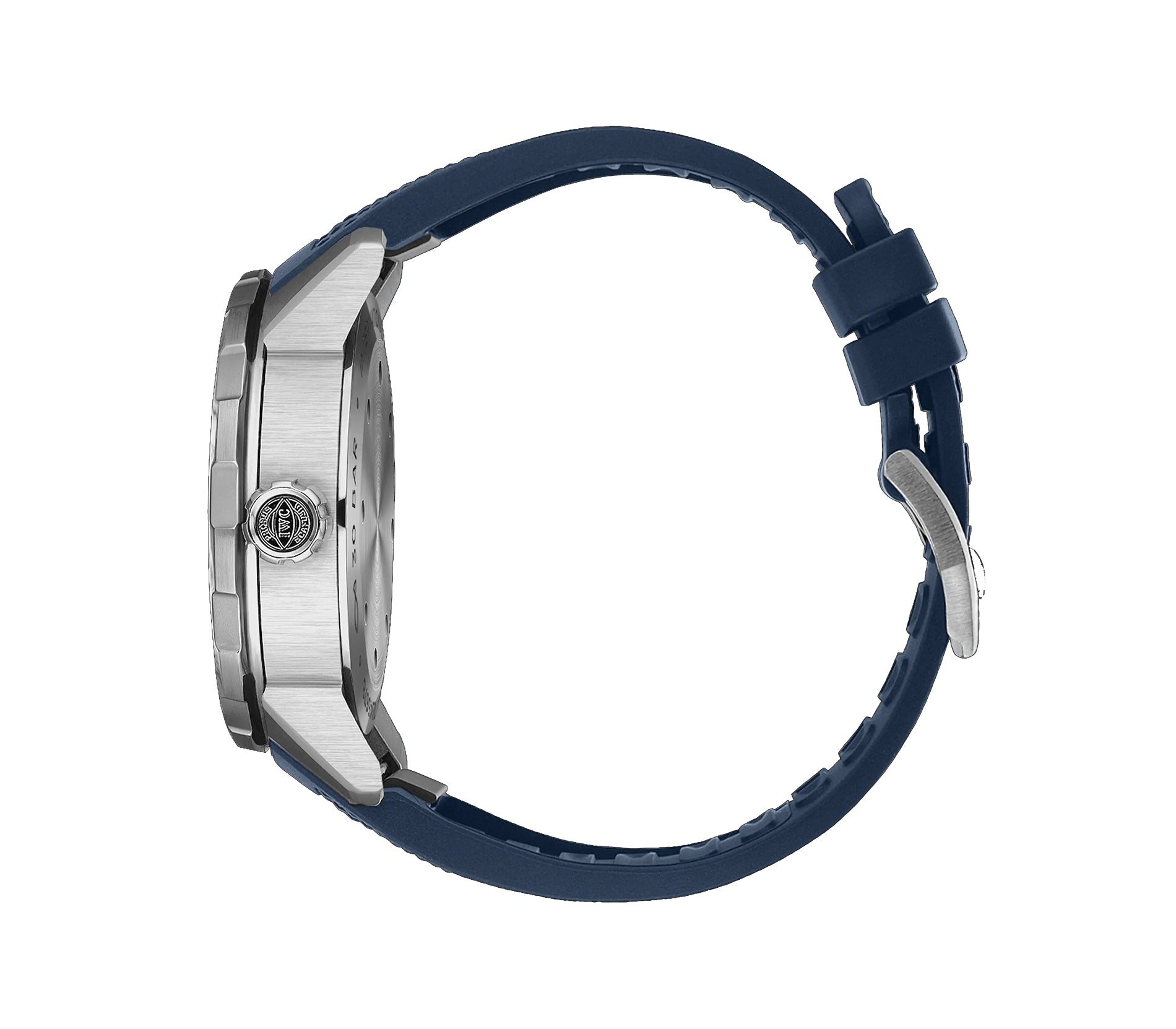 Case is made of stainless steel with mostly satin finish. The case back is closed-solid and the bezel mounted atop the case is satin finished stainless steel. It is paired with a blue rubber strap with tang buckle.