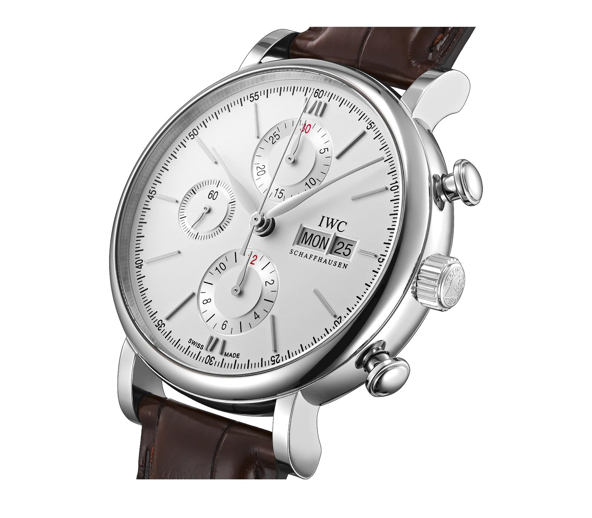 Case is made of mirror finished stainless steel, as is the fixed bezel mounted atop. Mounted on the top is a brown leather strap with an IWC stainless steel tang buckle.