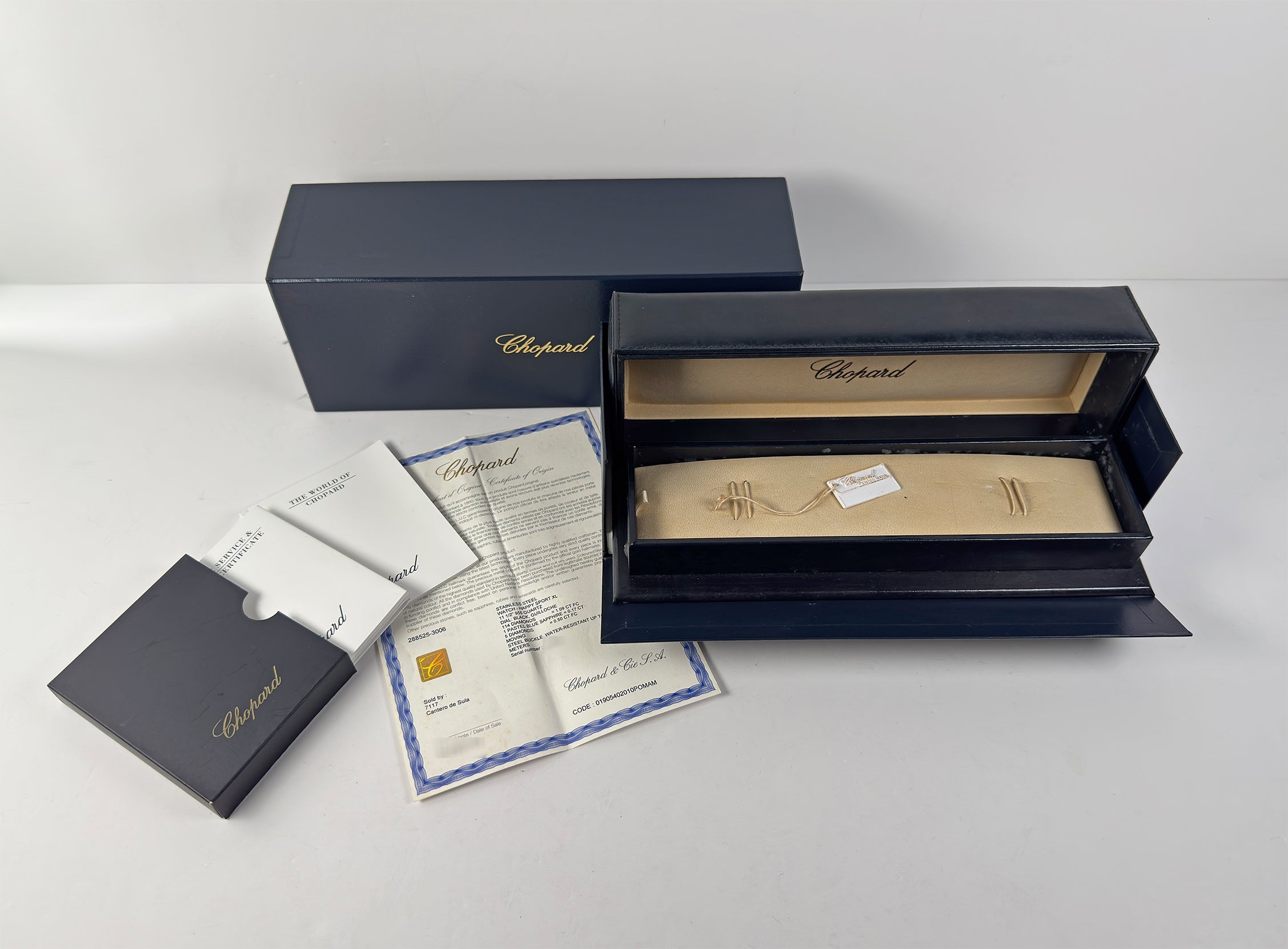 The case is made of a mirror finished stainless steel and is equipped with a double-row of Chopard factory set diamonds on the bezel. It is paired with a black leather Chopard strap that is accompanied by a stainless steel Choaprd tang buckle.