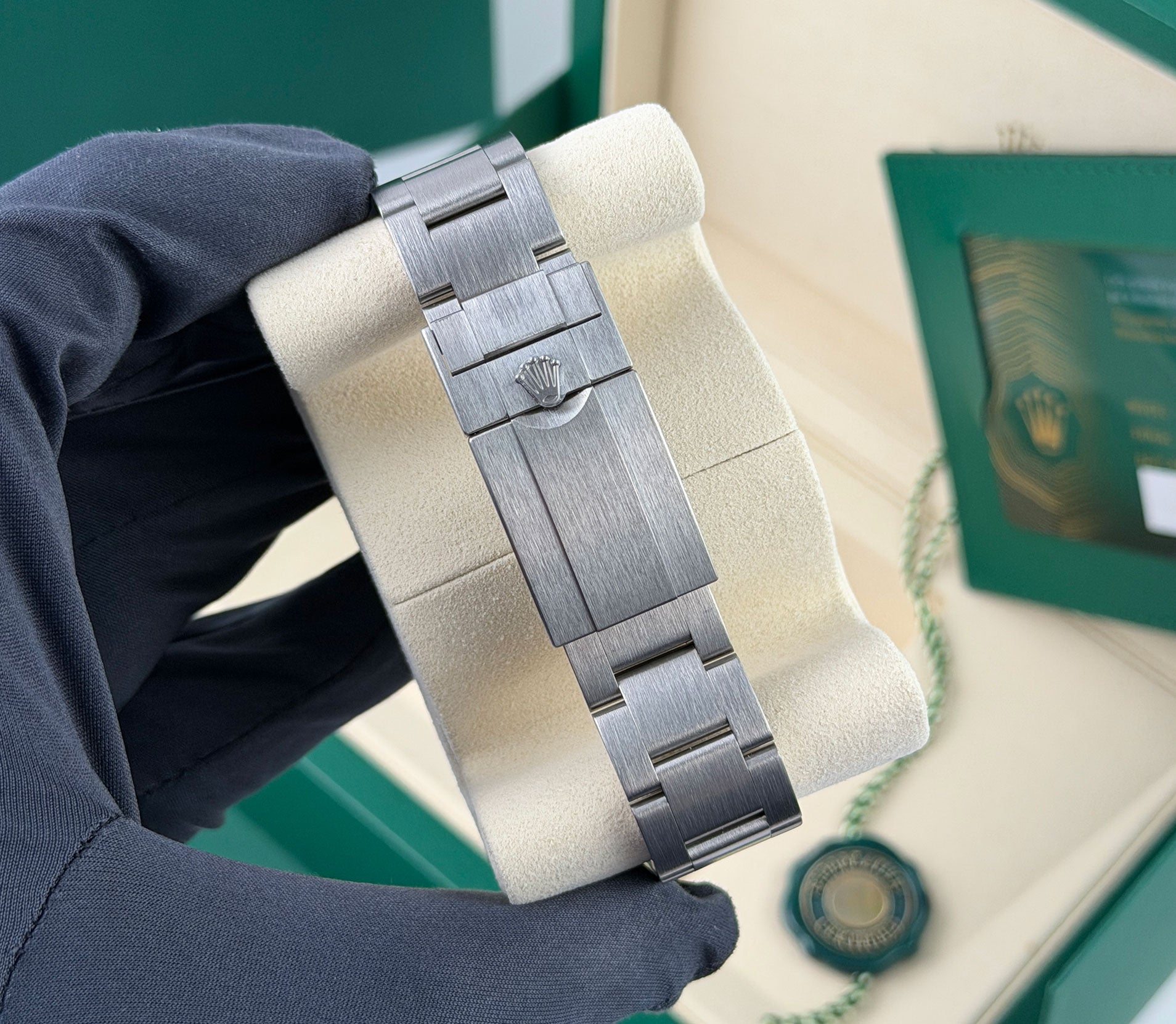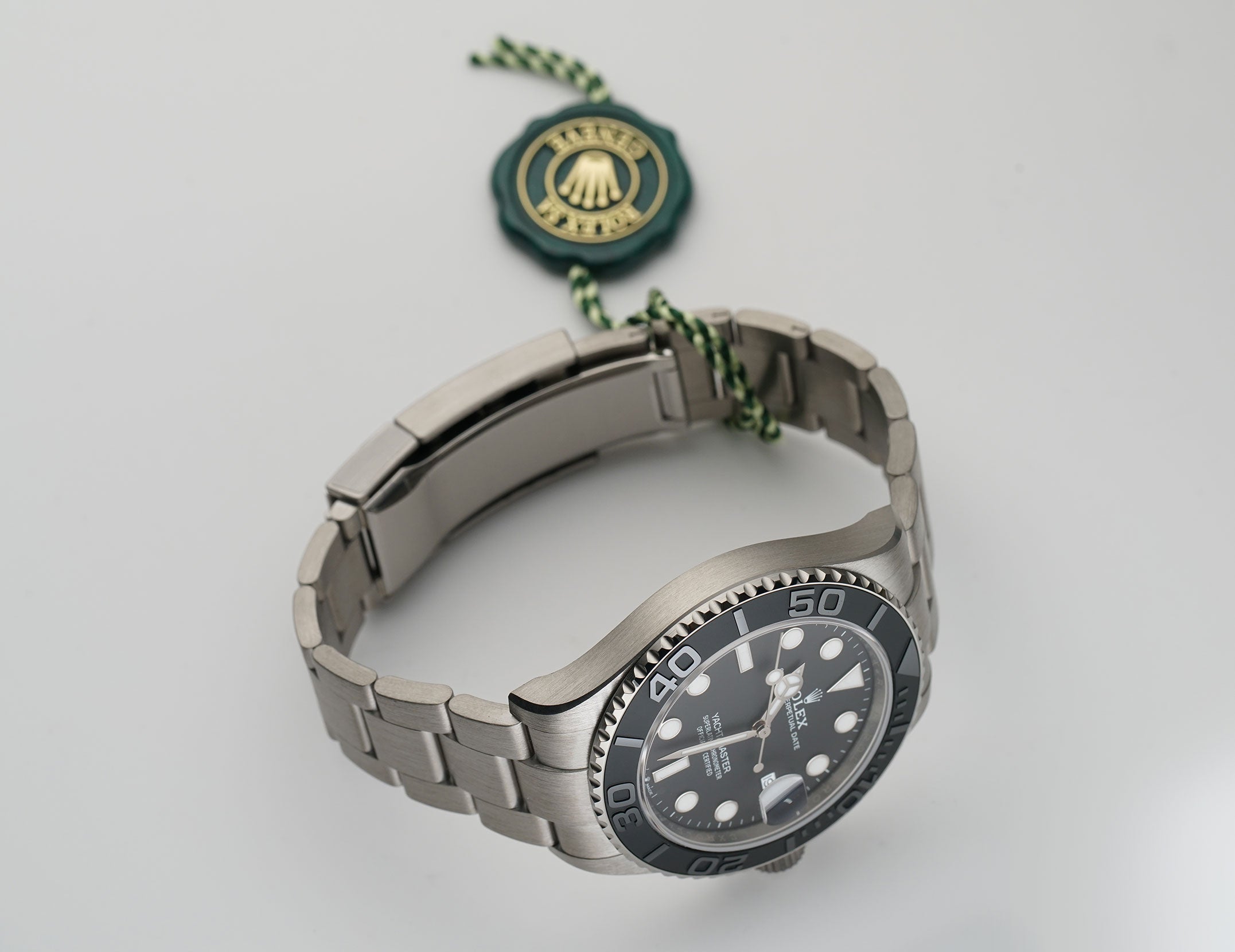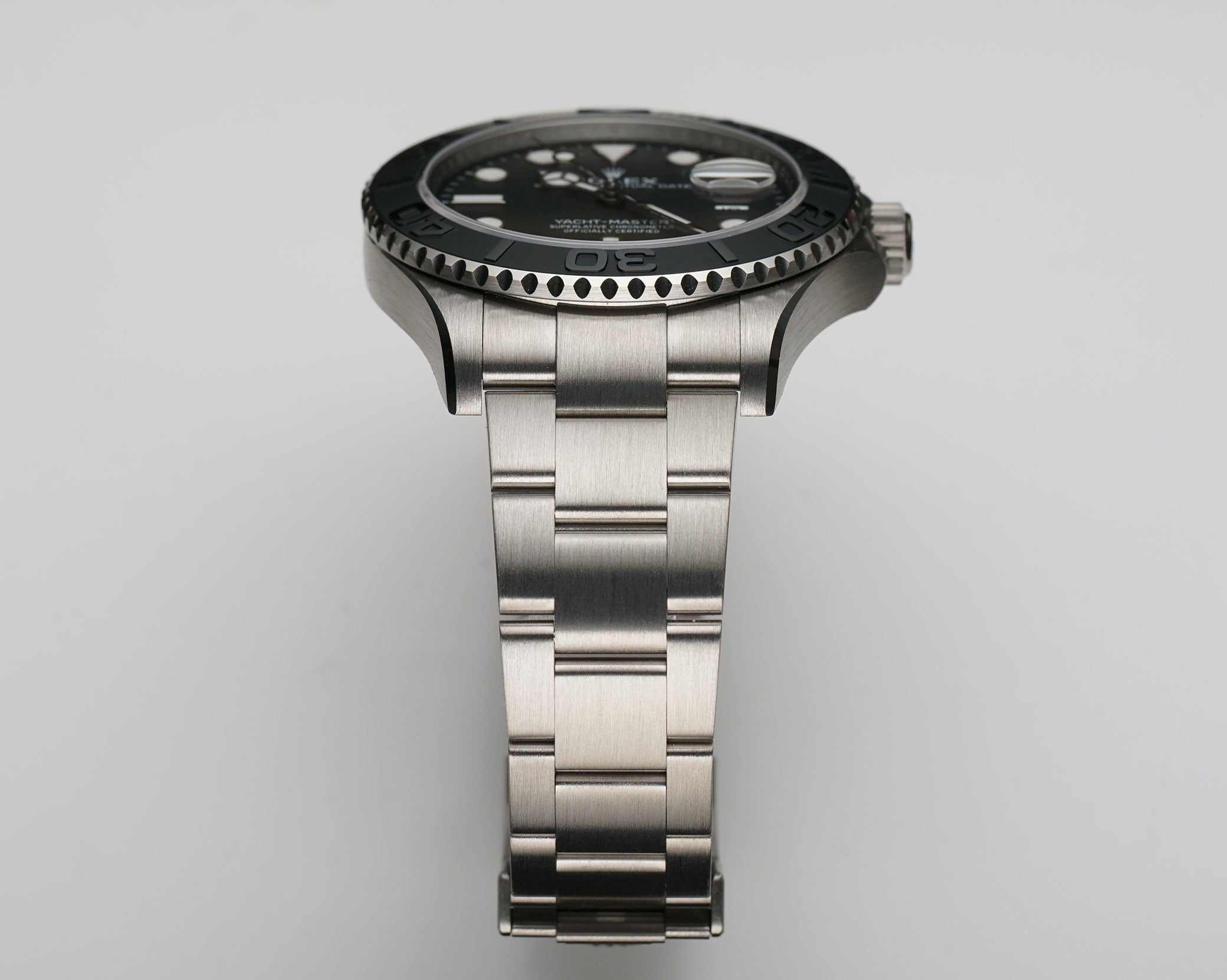 The case is made of titanium, which is all satin-finished with the exception of the bezel which is satin polished. The case is equipped with a bidirectional rotatable ceramic bezel that features a bezel insert that is accompanied by raised 60-minute markers. Both the crown and case back are screwed down into the case. As for the band, it comes mounted on a titanium oyster bracelet, which is all brush finished.
