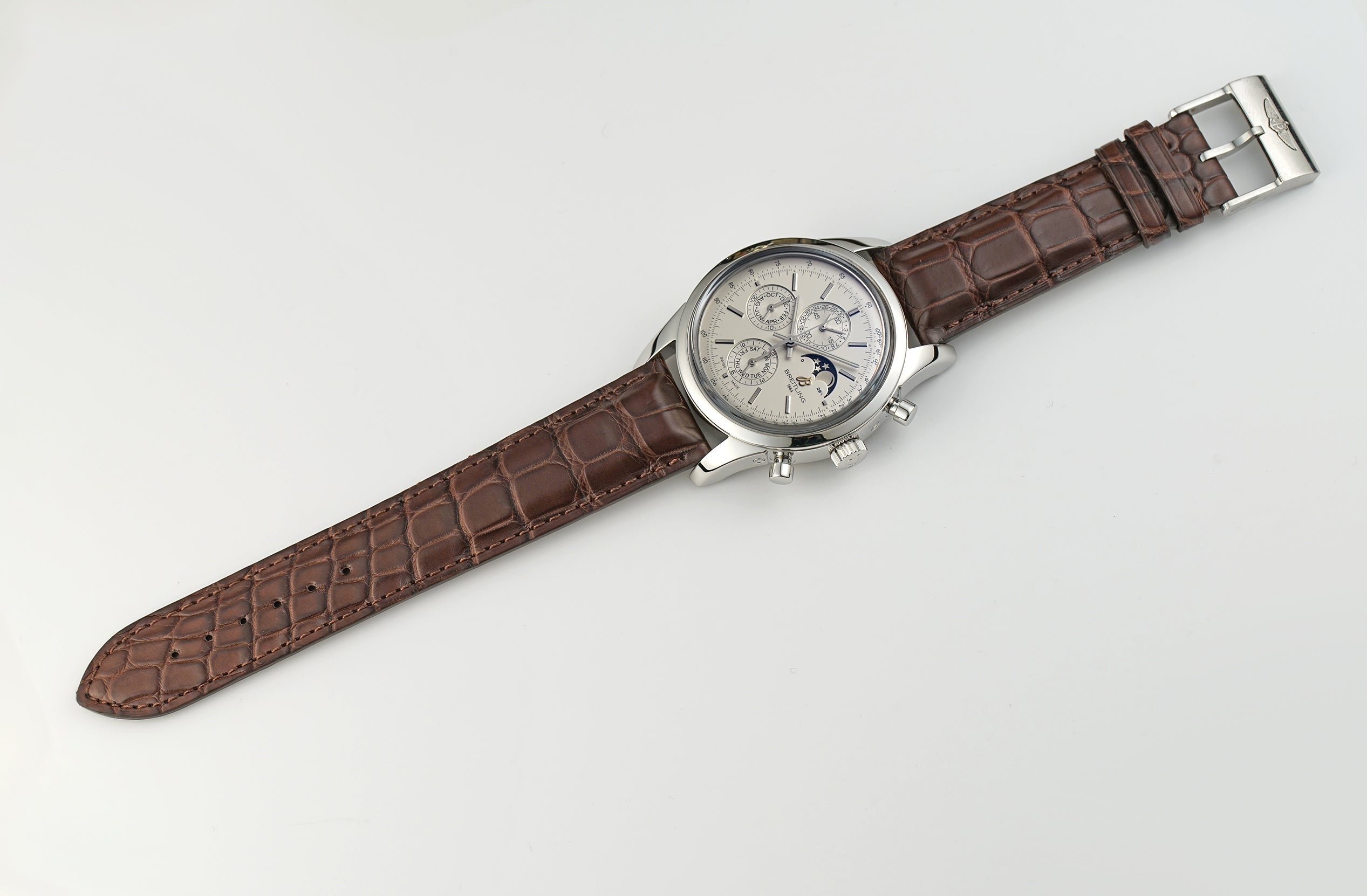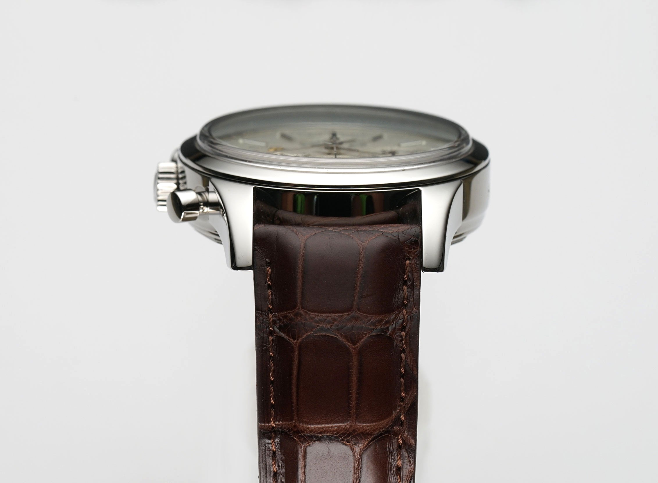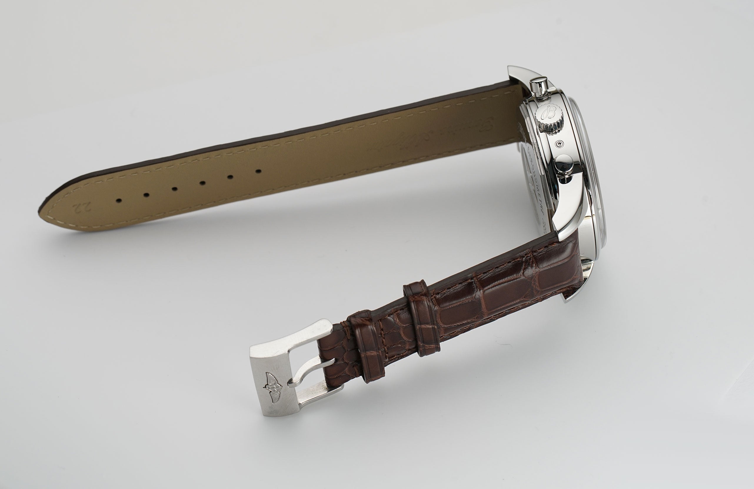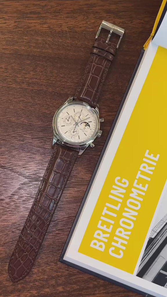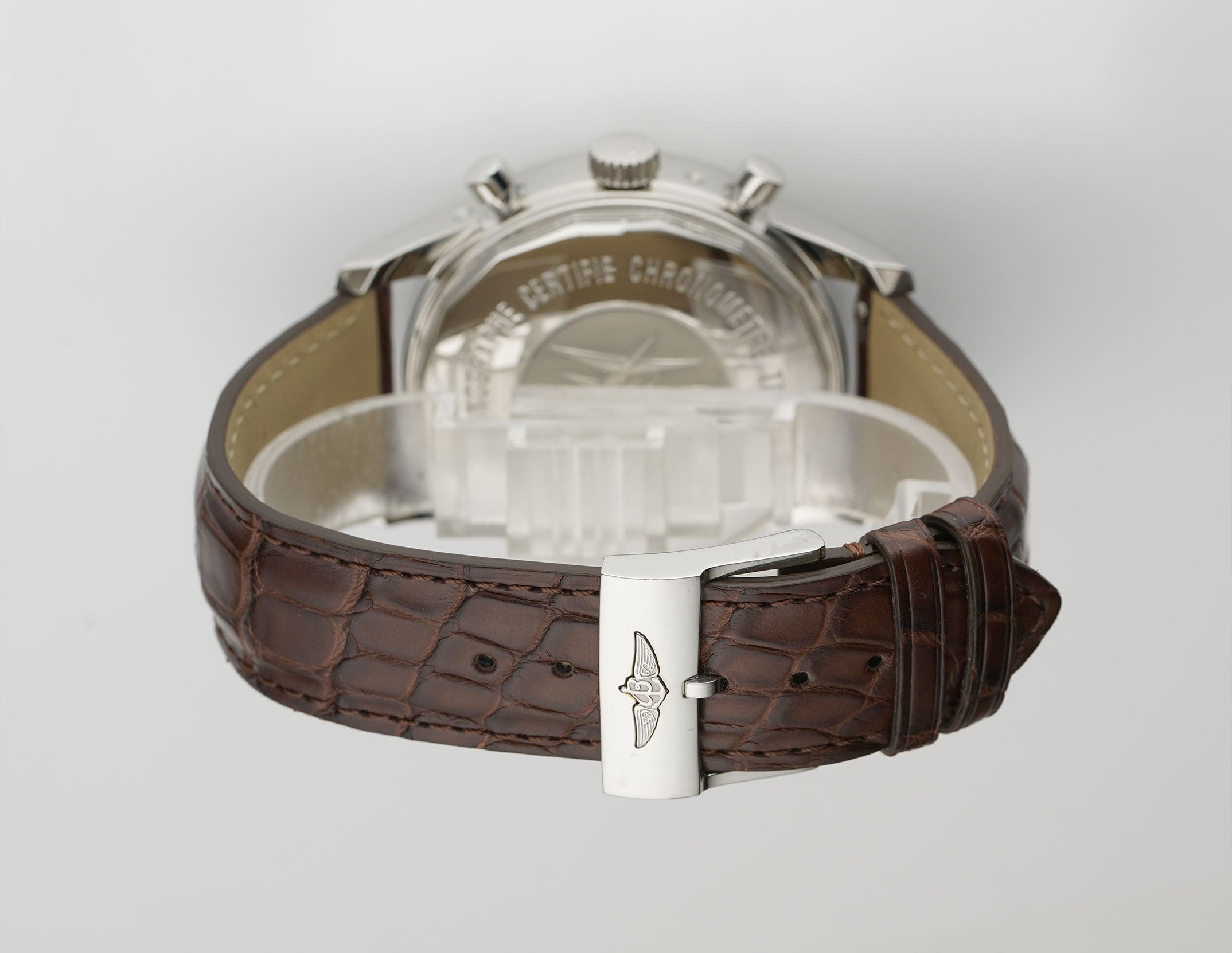 The case is made of a mirror-finished stainless steel as is the bezel and case back. It is paired with an unworn brown leather Jean Rousseau (high-quality Paris made) strap that is equipped with a stainless stele Breitling tang buckle.