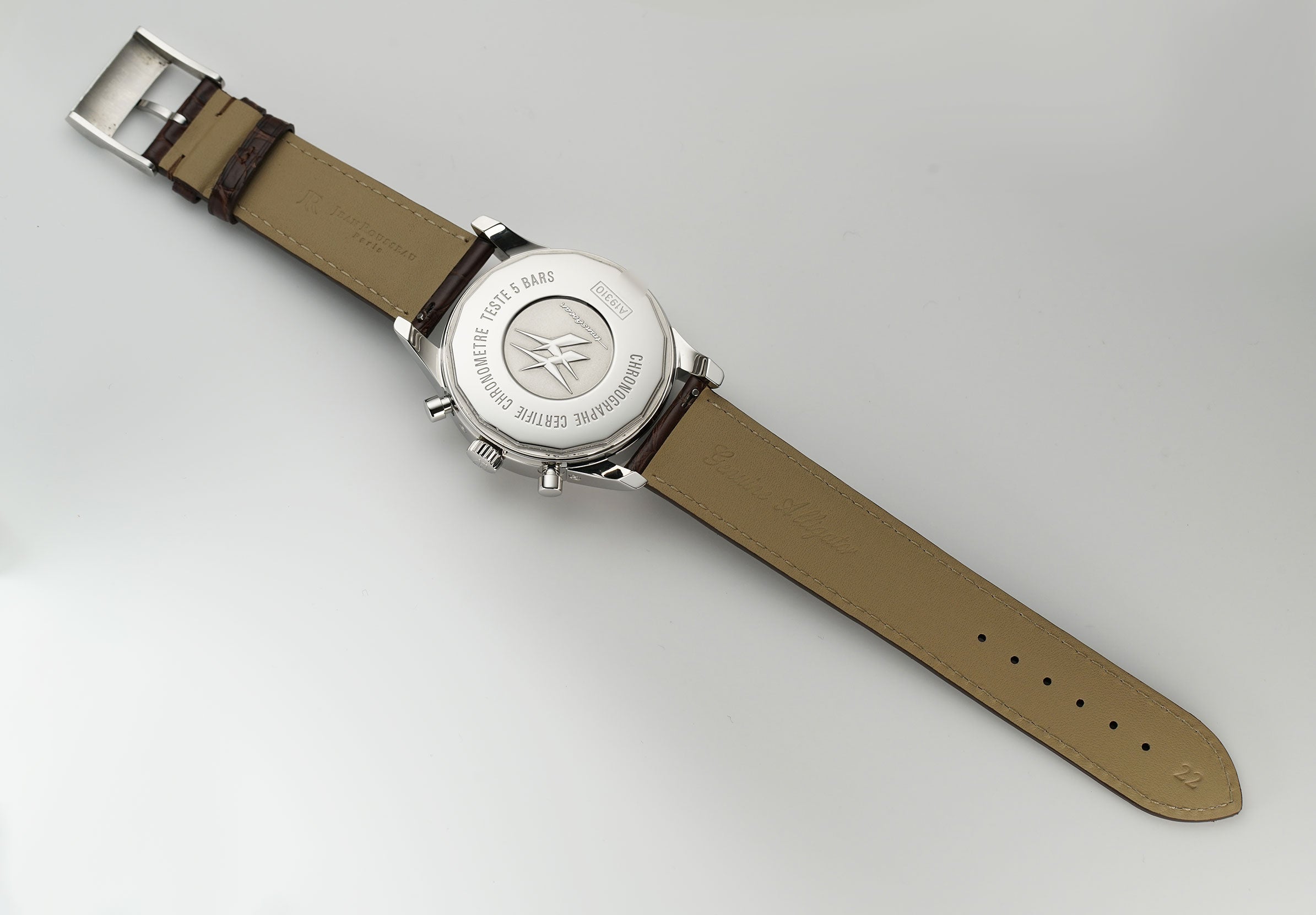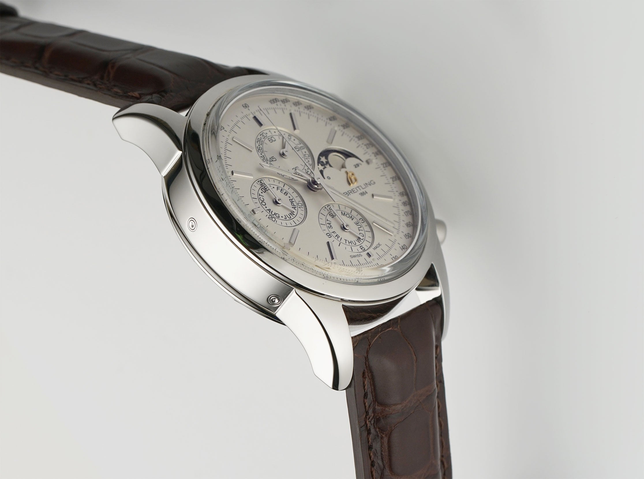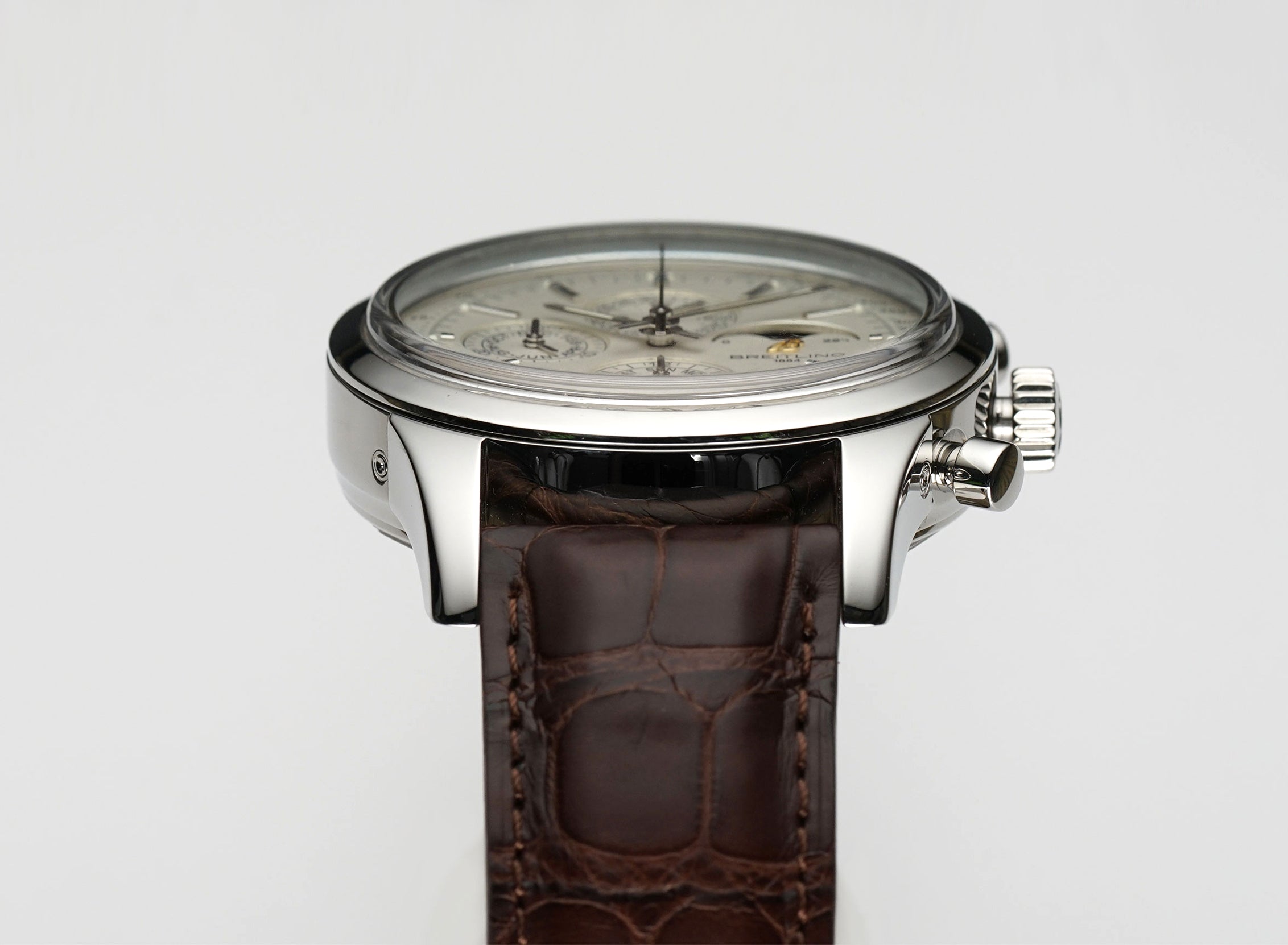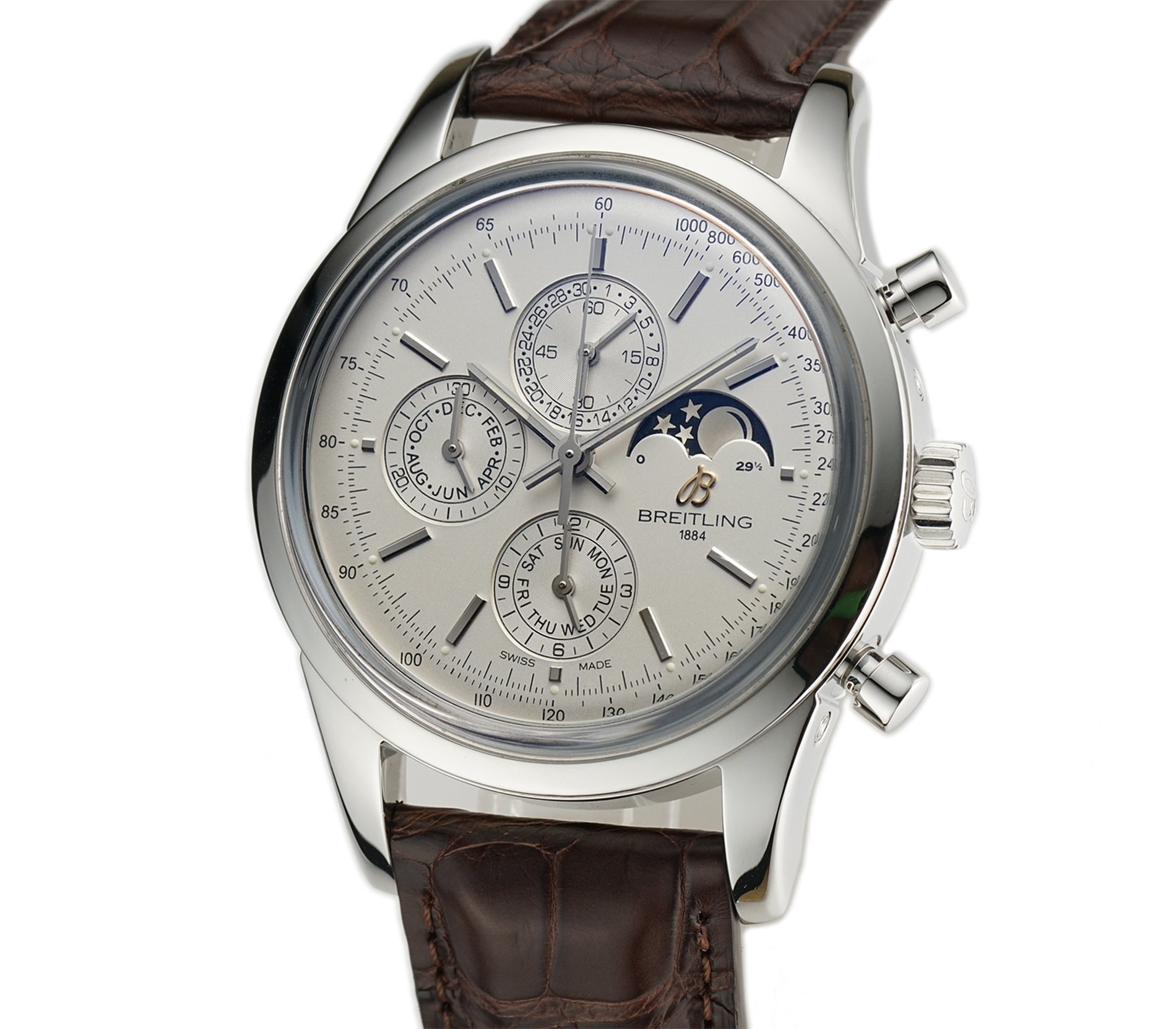 The case is made of a mirror-finished stainless steel as is the bezel and case back. It is paired with an unworn brown leather Jean Rousseau (high-quality Paris made) strap that is equipped with a stainless stele Breitling tang buckle.