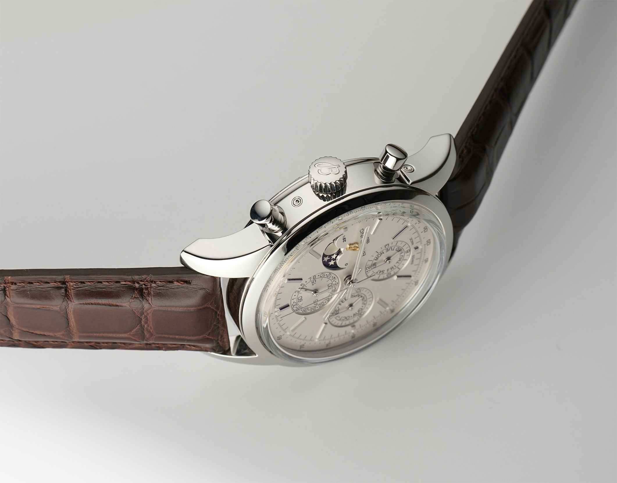 Functions are displayed on a silver dial that is accompanied by index hour markers and luminescent filled hands. Those functions include hours, minutes, sub-seconds, date, day, month, moon phase display and lastly a three register chronograph. It is called the Transocean 1461 because it features a calendar that only needs to be reset every 4 years (1461 days).
