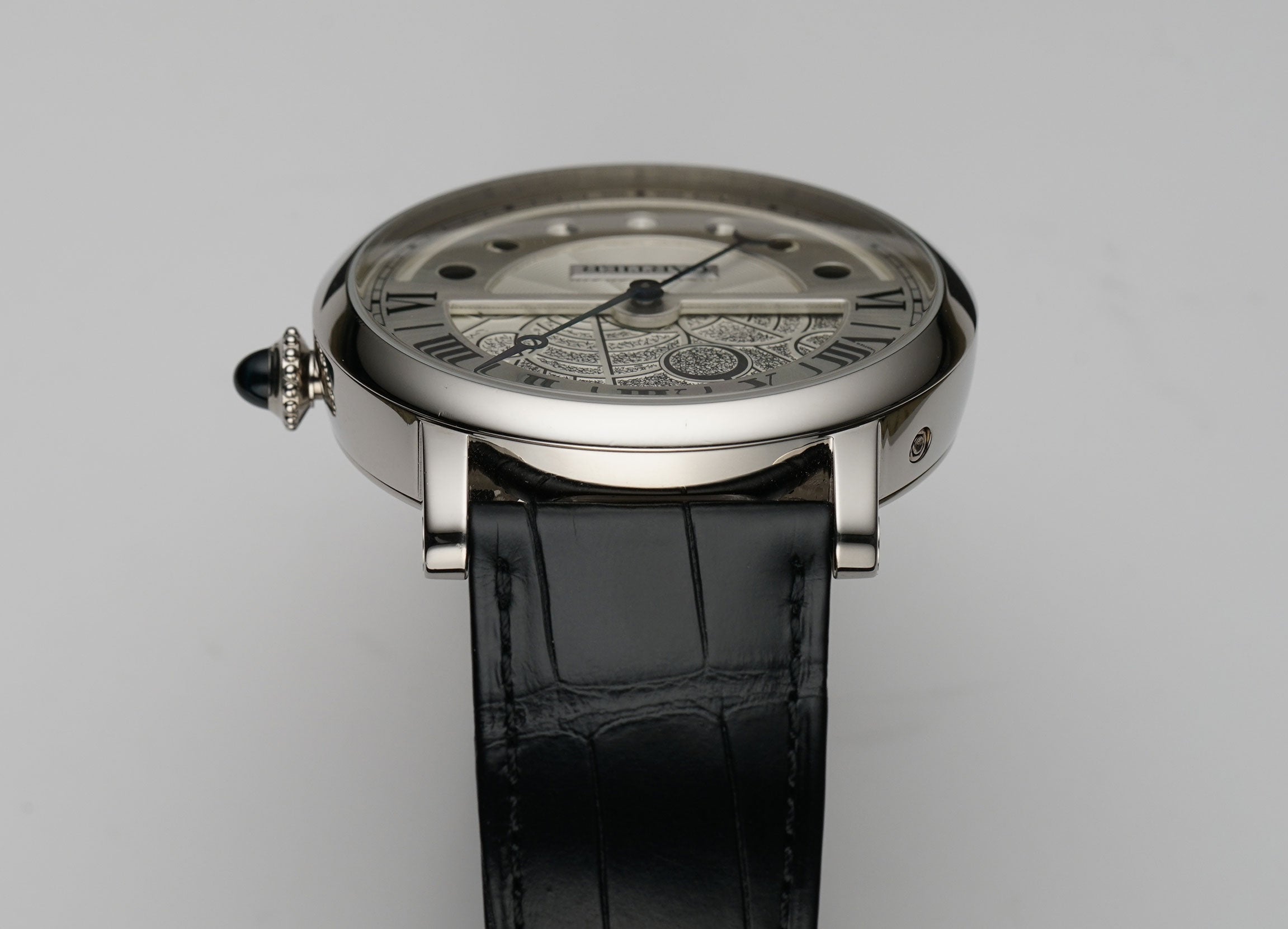 The dial is a piece of art in itself. You have a gorgeous silver guilloche dial accompanied by a Breguet blued steel hand (minute hand). The hours are indicated in the decoratively engraved center disc on the north end that displays a either a sun or moon pointing at the hour and this is done in a retrograde manner. The retrograde moon phase display is in the circular apertures at the bottom of the dial.