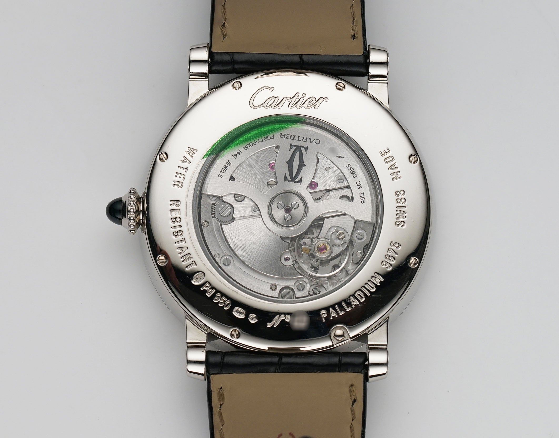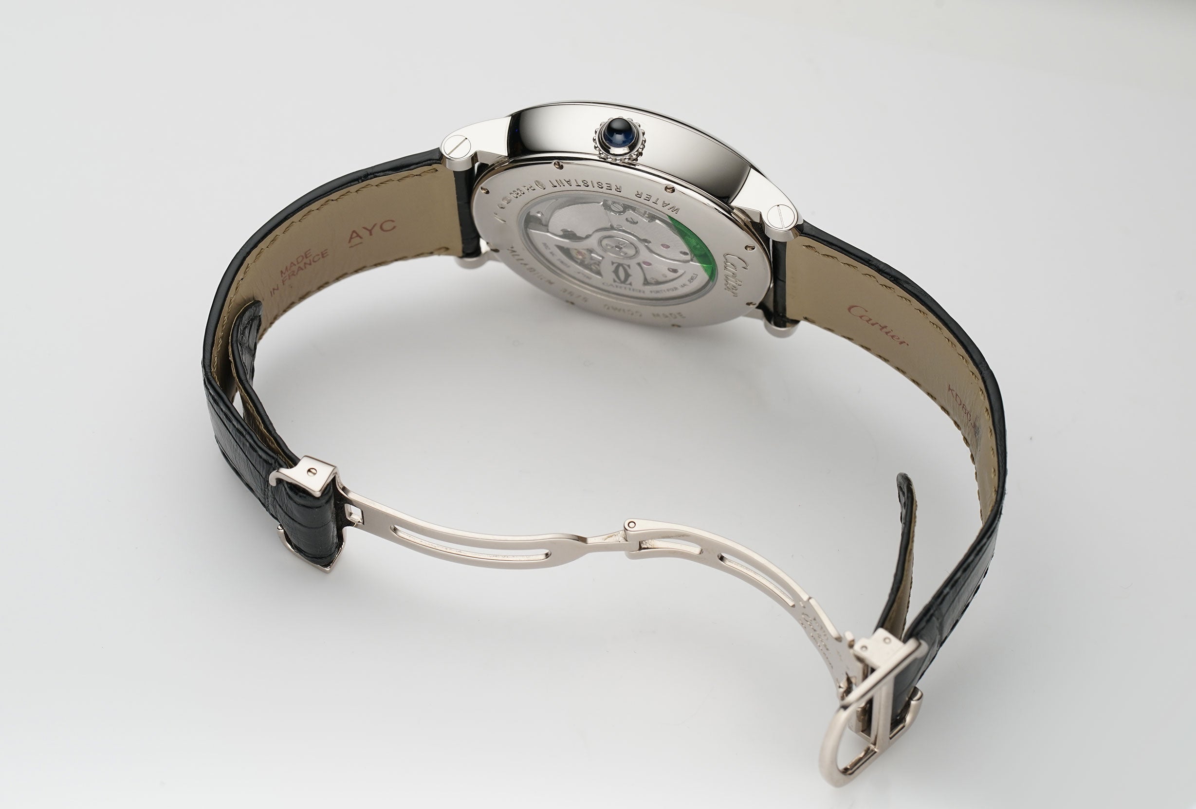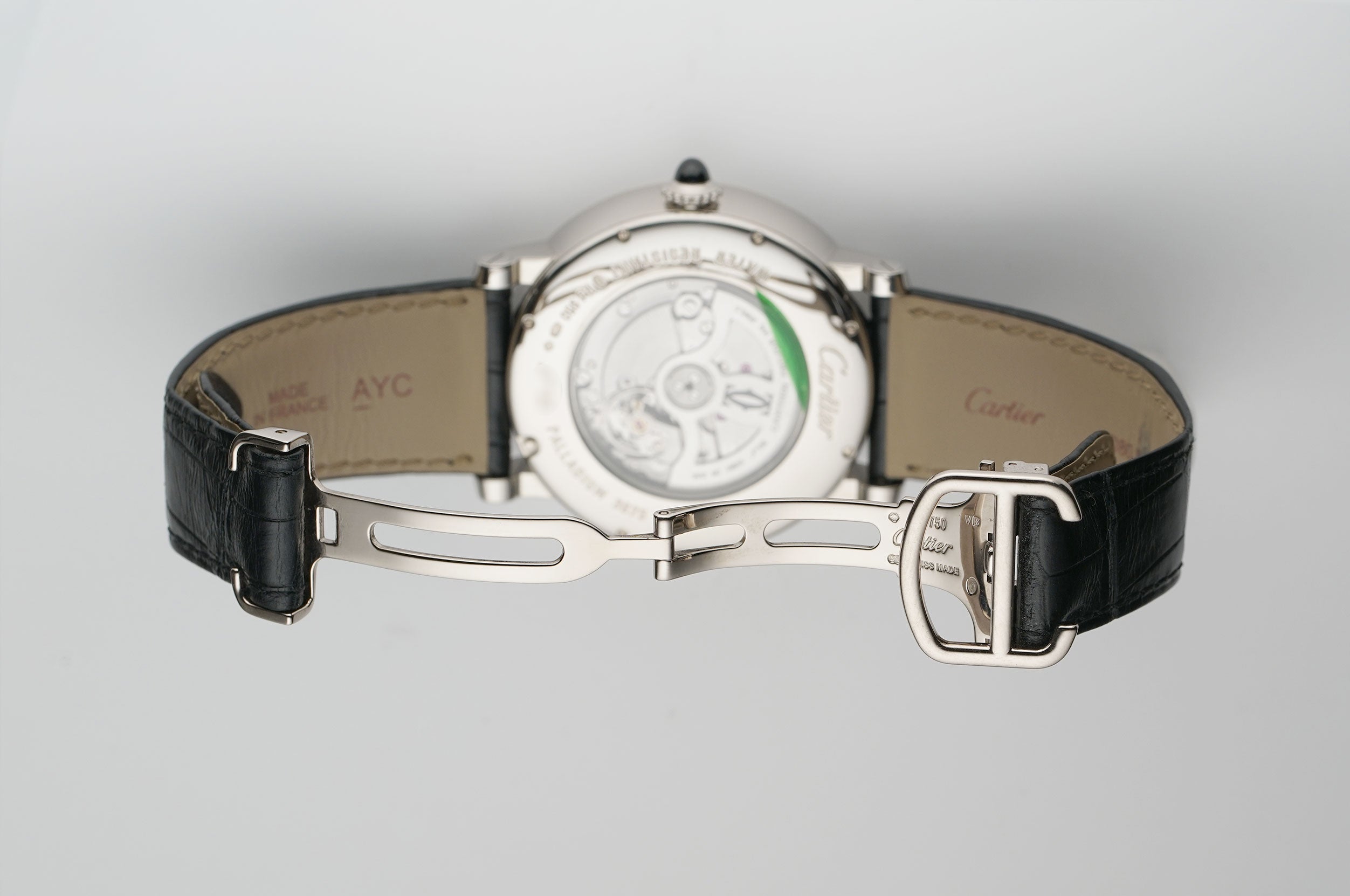 The case is made of a mirror-finished palladium and equipped with an exhibition case back. It is currently mounted on a Cartier black leather strap (approximately 80% condition) and that is paired with a Cartier 18k white gold deployment buckle.