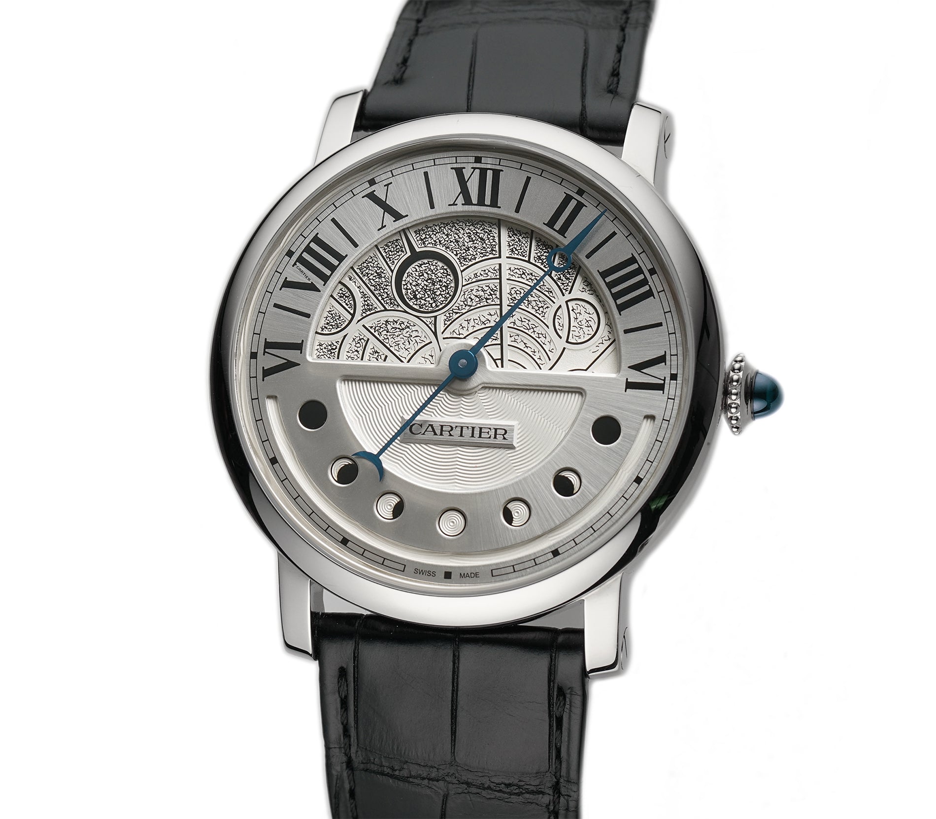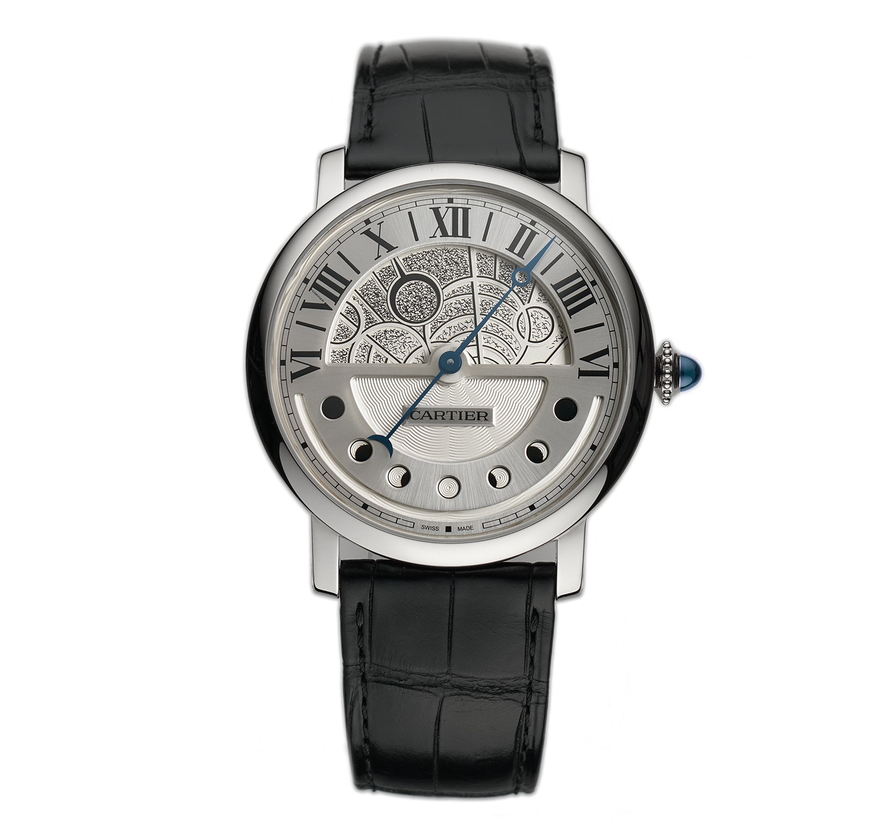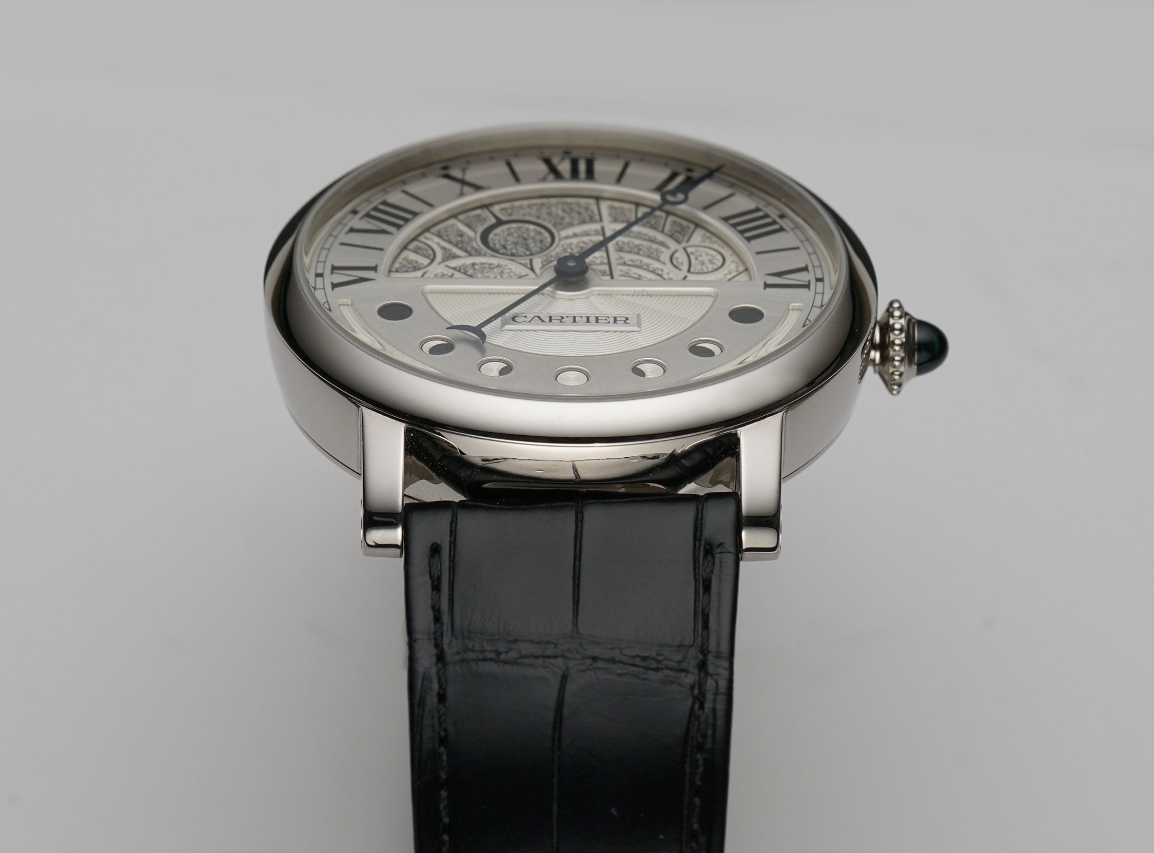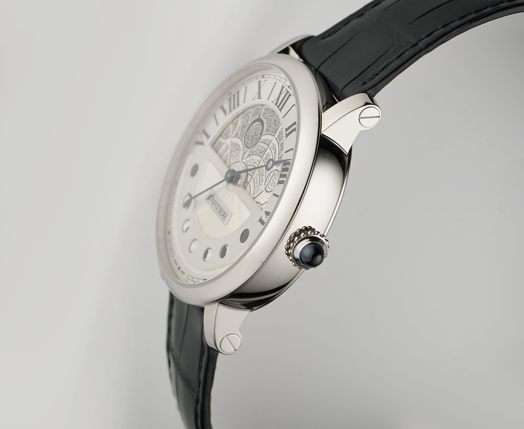 The case is made of a mirror-finished palladium and equipped with an exhibition case back. It is currently mounted on a Cartier black leather strap (approximately 80% condition) and that is paired with a Cartier 18k white gold deployment buckle.
