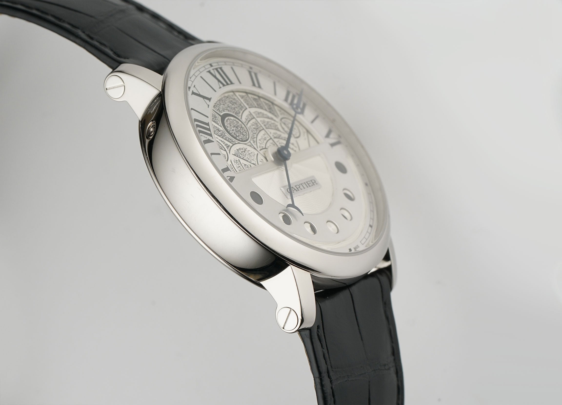 Here we have a rare Rotonde day and night in palladium that is in great shape for a previously enjoyed watch. It does have minor signs of ordinary wear on the side of the case (more visible in pictures than the naked eye) but other than that it is a crisp watch. The case does have areas of mirror-like finish which are prone to hairlines (marks visible when with high resolution cameras or if angled at certain lighting). Pictures are part of the description so please refer to the pictures in determining the condition, pictures are of the exact watch being offered.