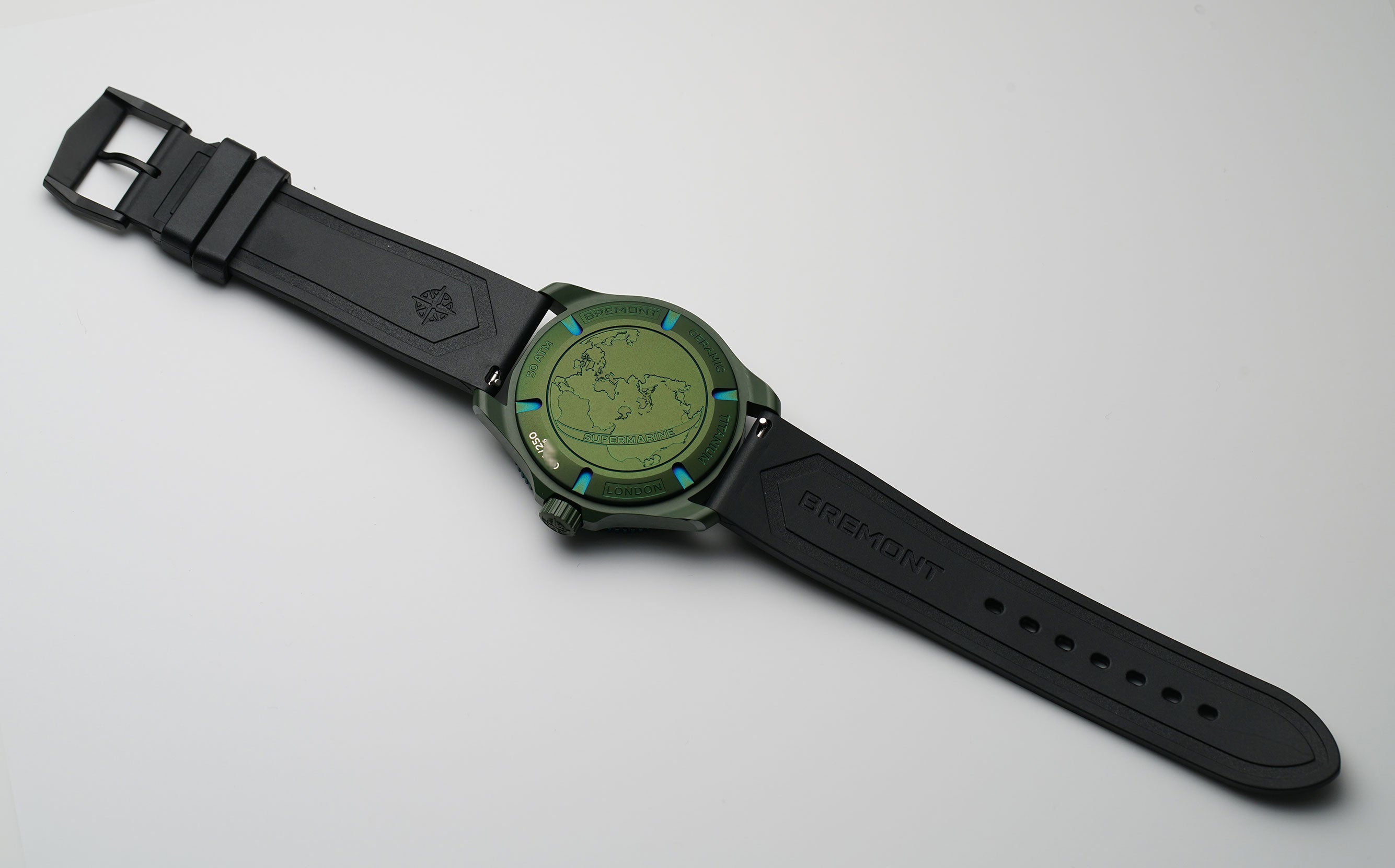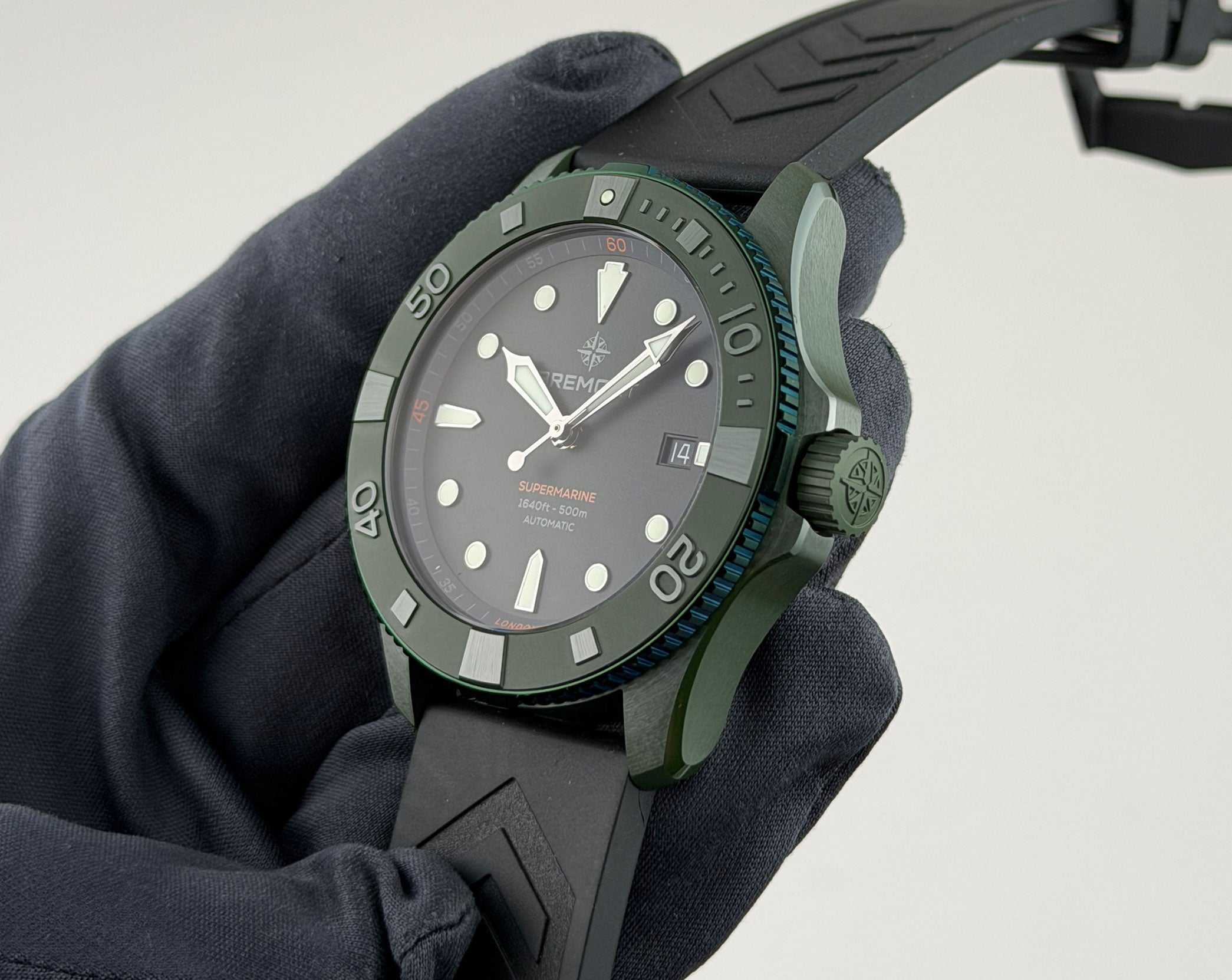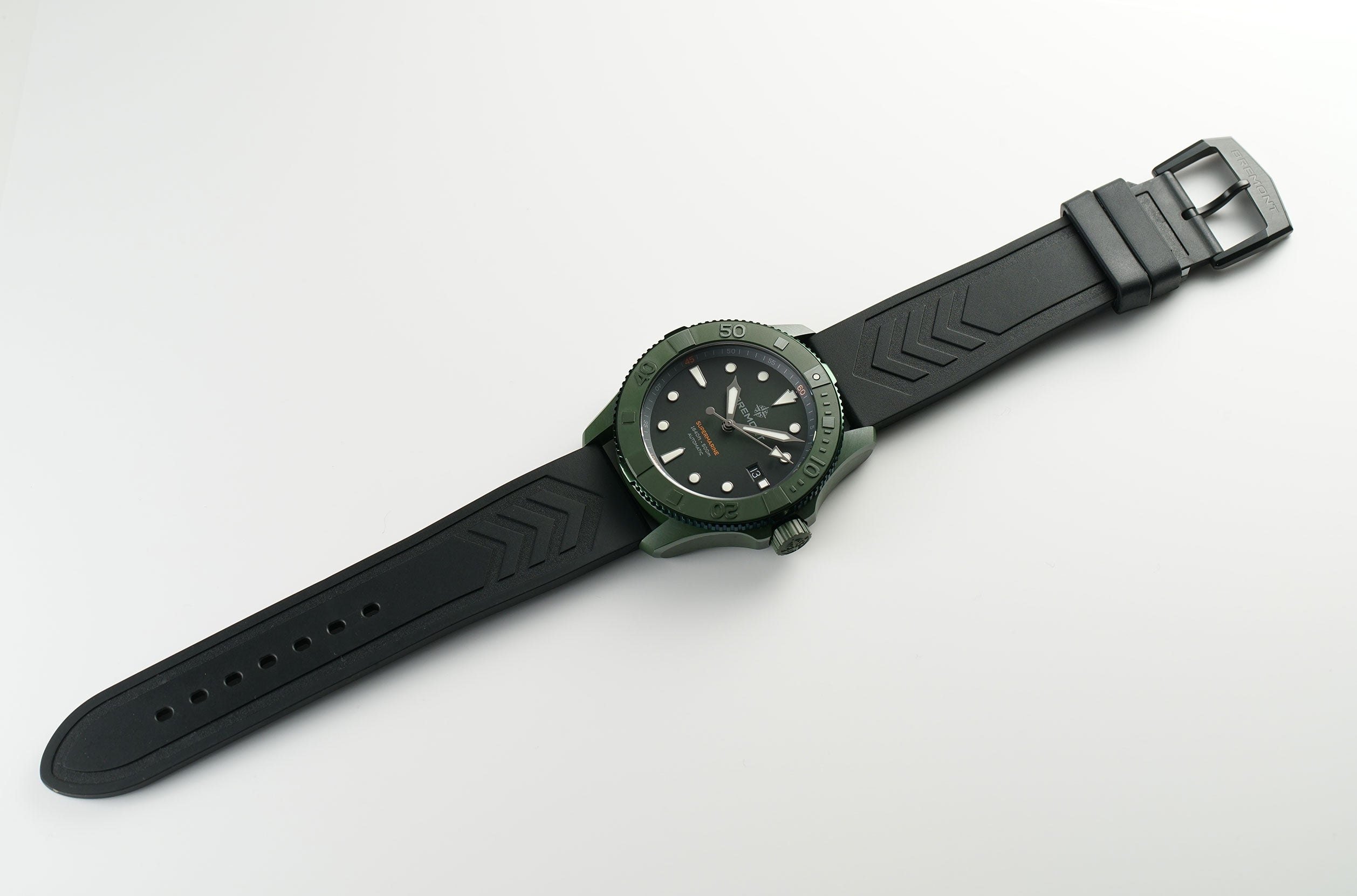 The case is made of a green ceramic while the bezel, crown and case back are of titanium treated with a green PVD. The bezel is equipped with a green ceramic diver's insert.