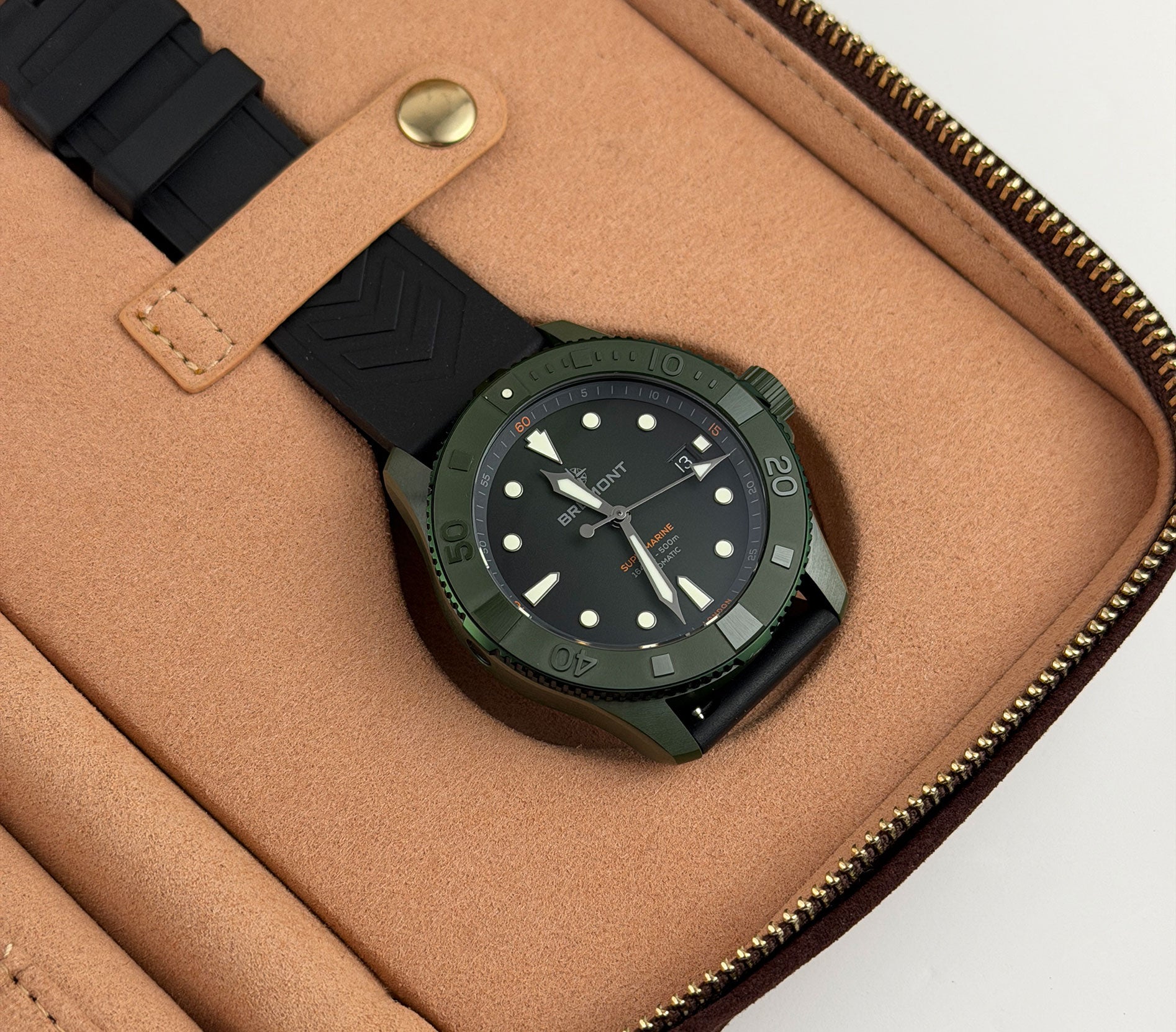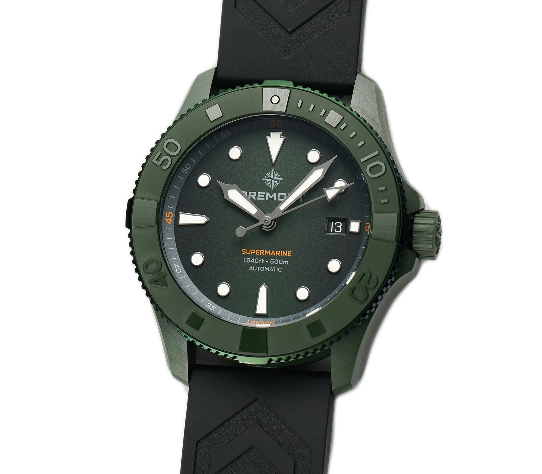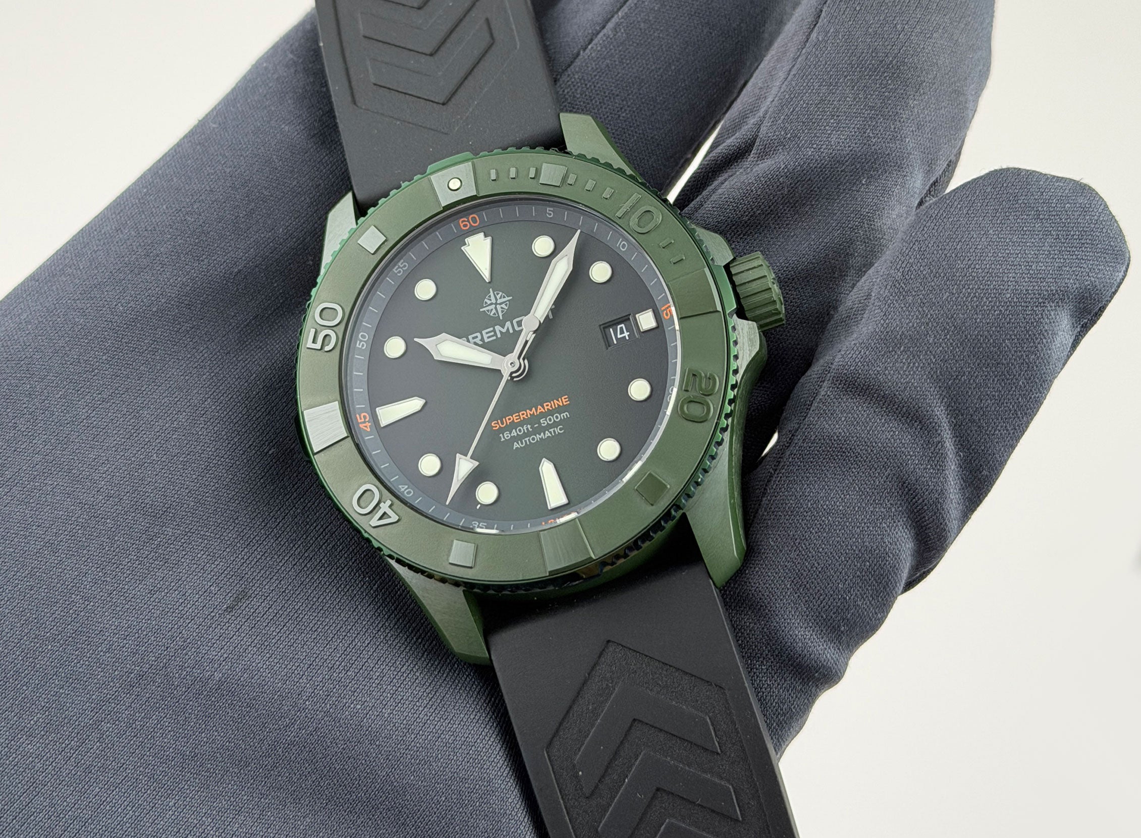 The case is made of a green ceramic while the bezel, crown and case back are of titanium treated with a green PVD. The bezel is equipped with a green ceramic diver's insert.