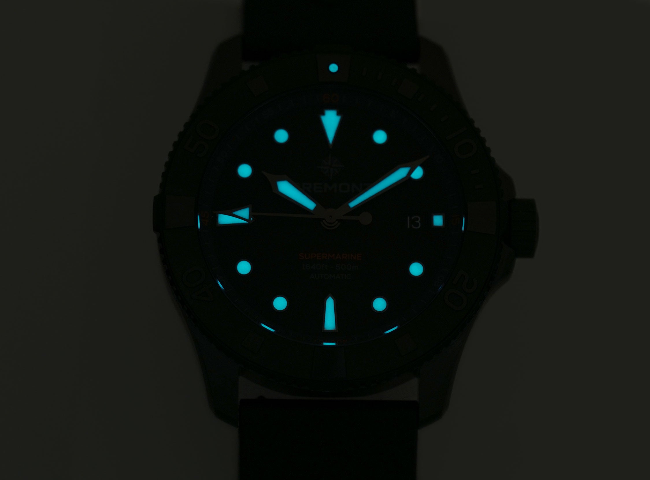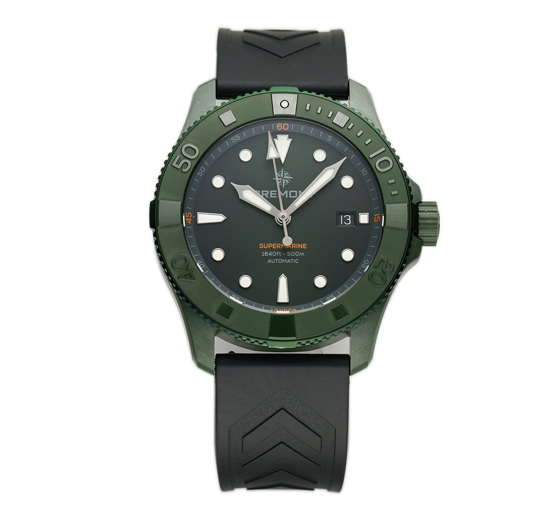 Time and date are displayed on a green dial that iss accompanied by luminecent-filled hands and hour markers.