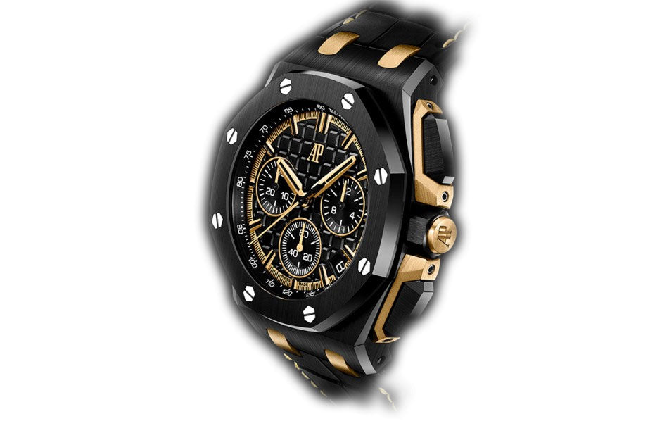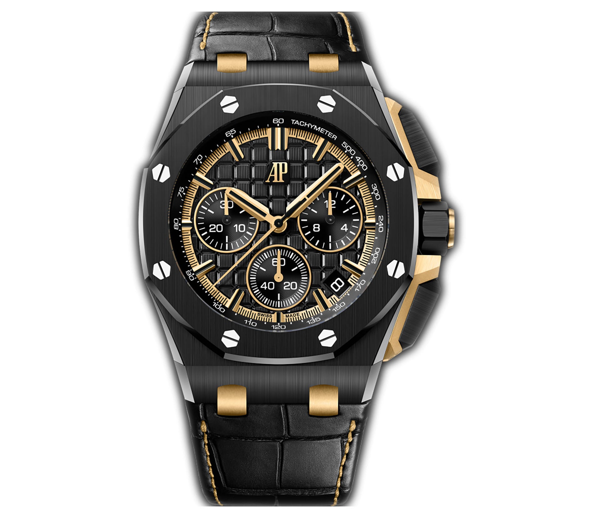 Case is made of black ceramic, most of which is brushed finish with the exception of the beveled corners which are of high-polished finish. The bezel mounted atop follows the same configuration of finish as the case. As for the push-buttons for the chronograph, they are black ceramic and crown is black ceramic too with gold in the centre of crown.