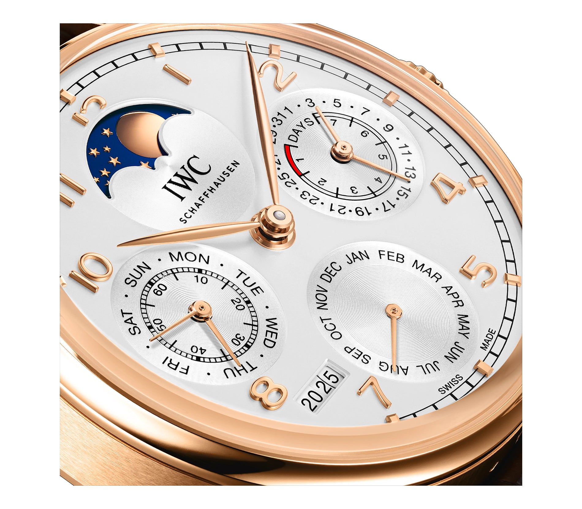 Functions are displayed on a silver dial that is accompanied by rose gold hands and Arabic numeral hour markers. Featured on the dial: Small-seconds and weekday sub-dial at 9 o'clock, Power reserve and date sub-dial at 3 o'clock, Month sub-dial at the 6 o'clock, and moon-phase sub-dial at 12 o'clock position and year aperture between 7 & 8 o'clock.