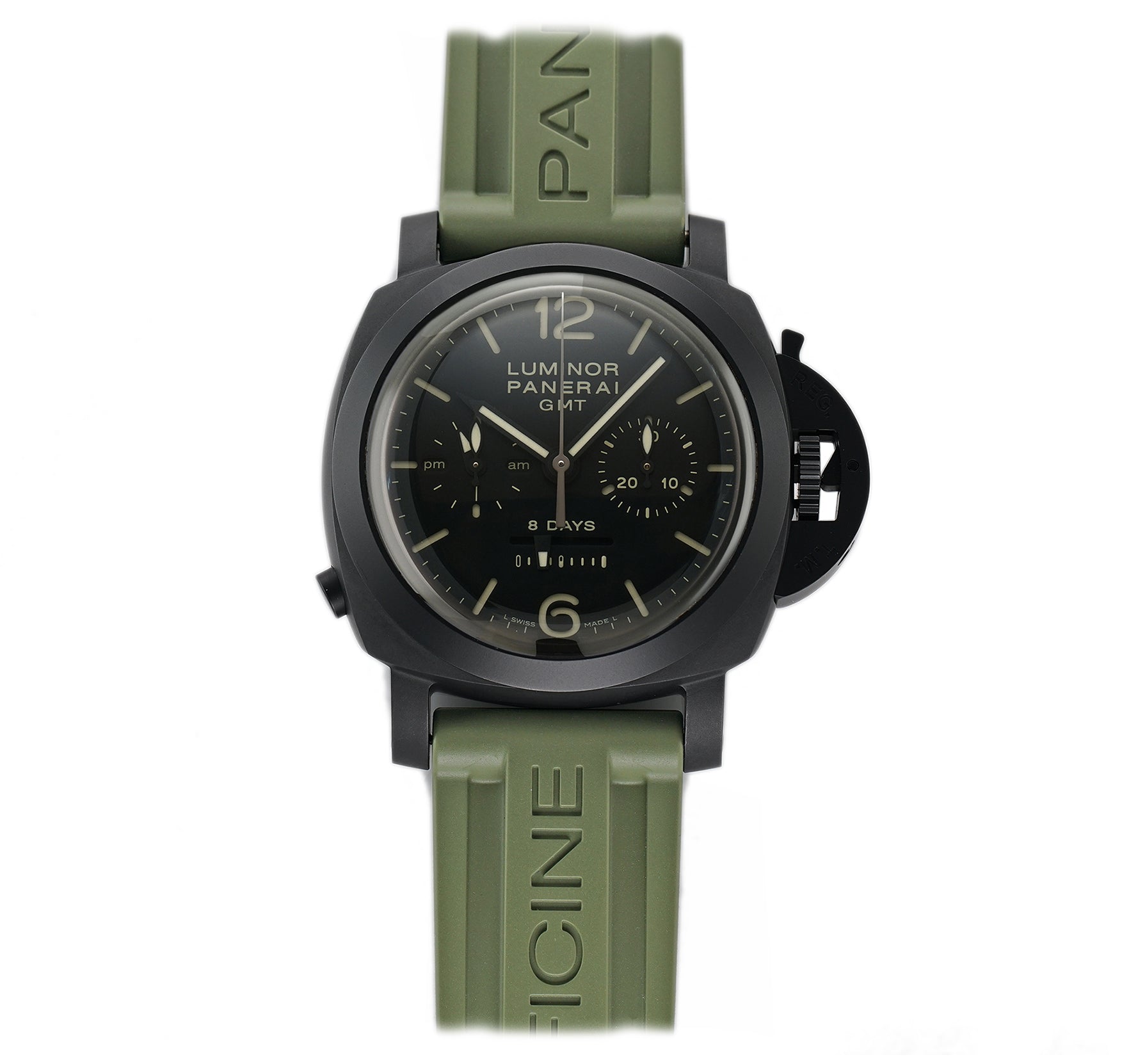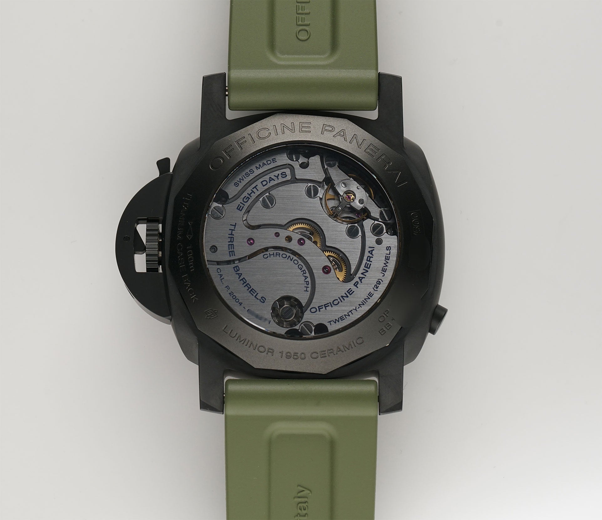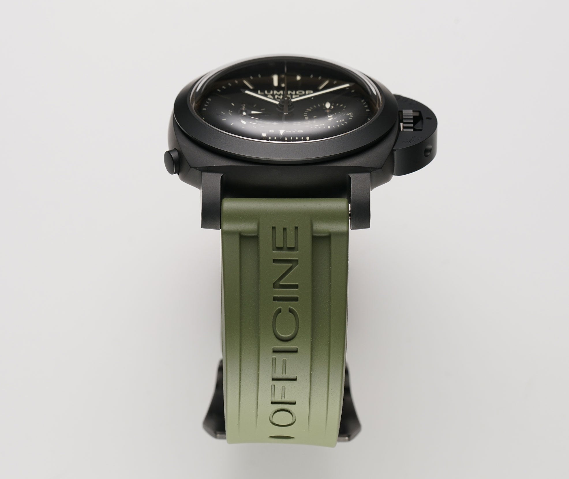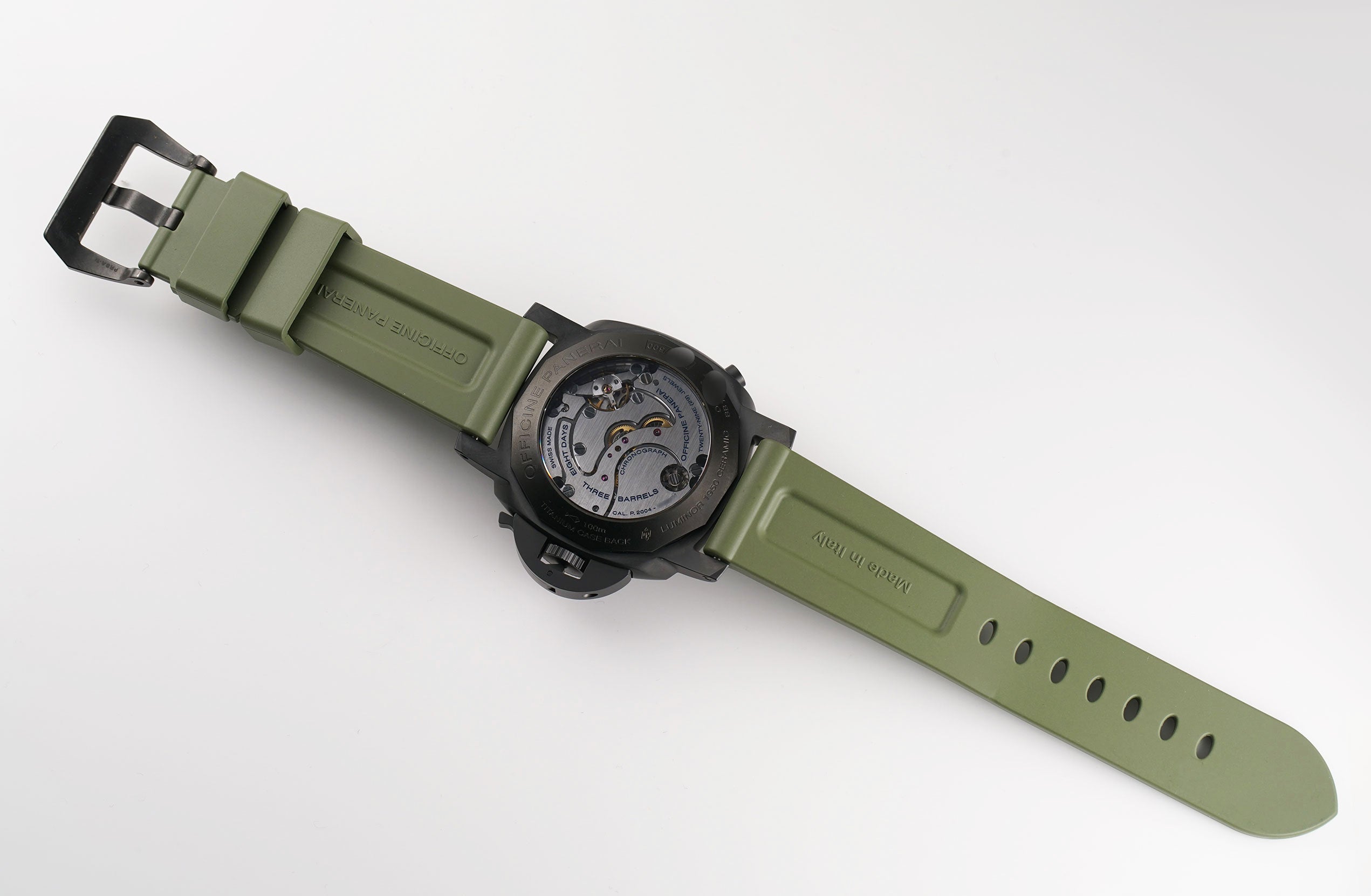 As mentioned before, the case is made of highly durable black ceramic as is the bezel and crown guard that accompany it. The watch is paired to an unworn green Panerai rubber strap that is secured onto the wrist with the help of a blackened titanium Panerai tang buckle.