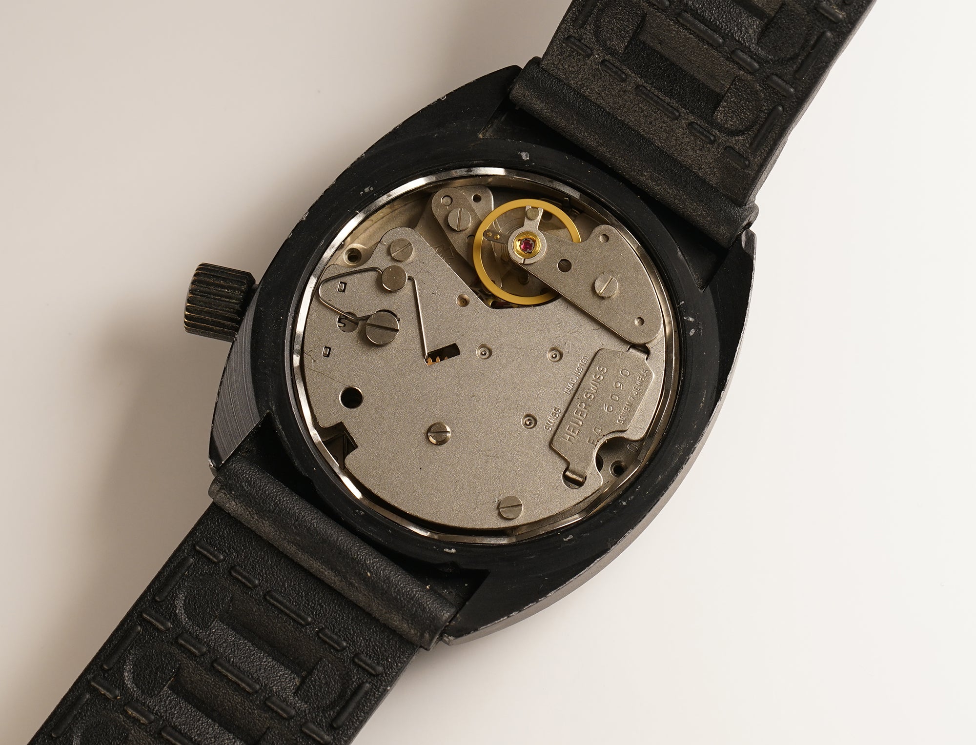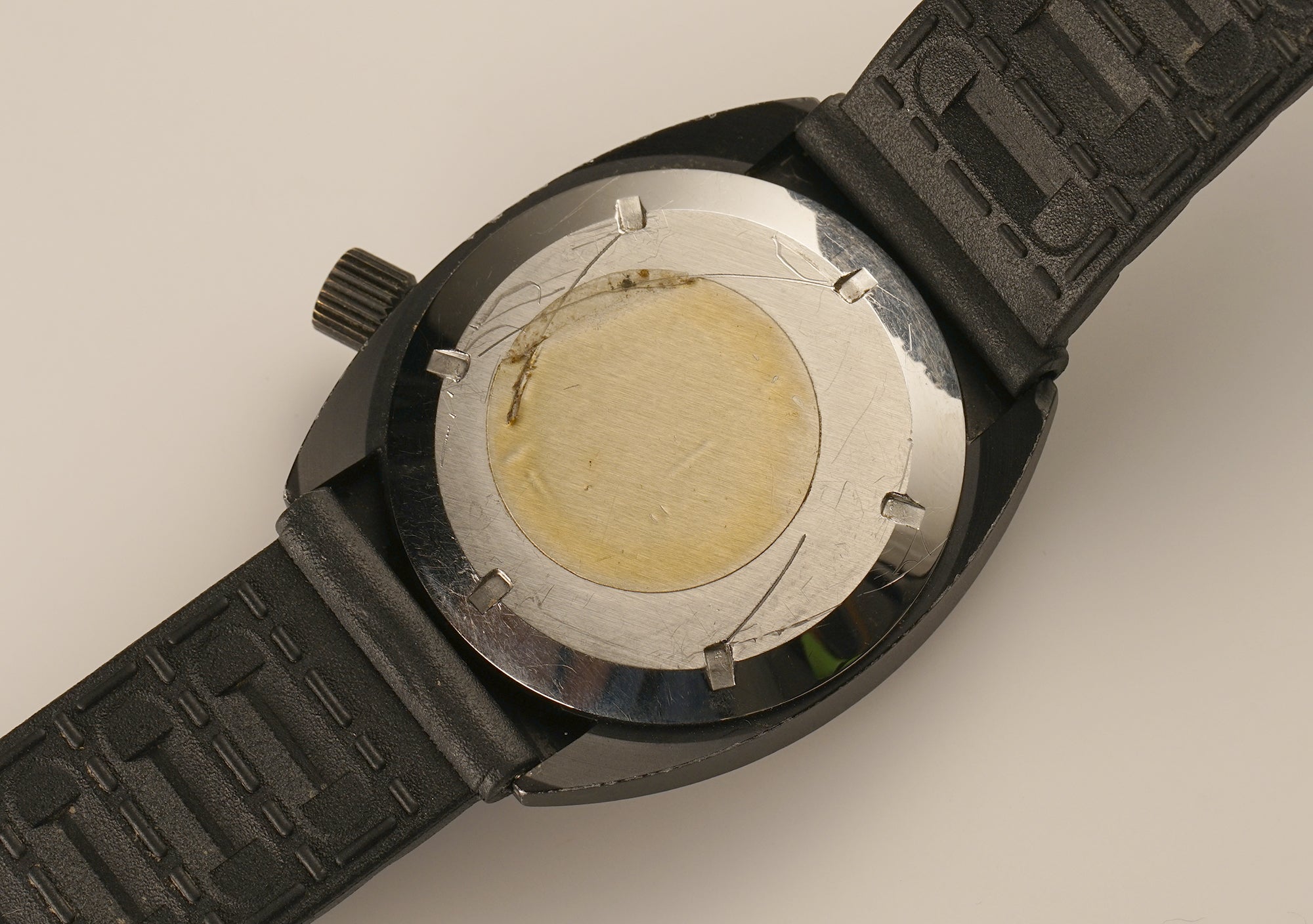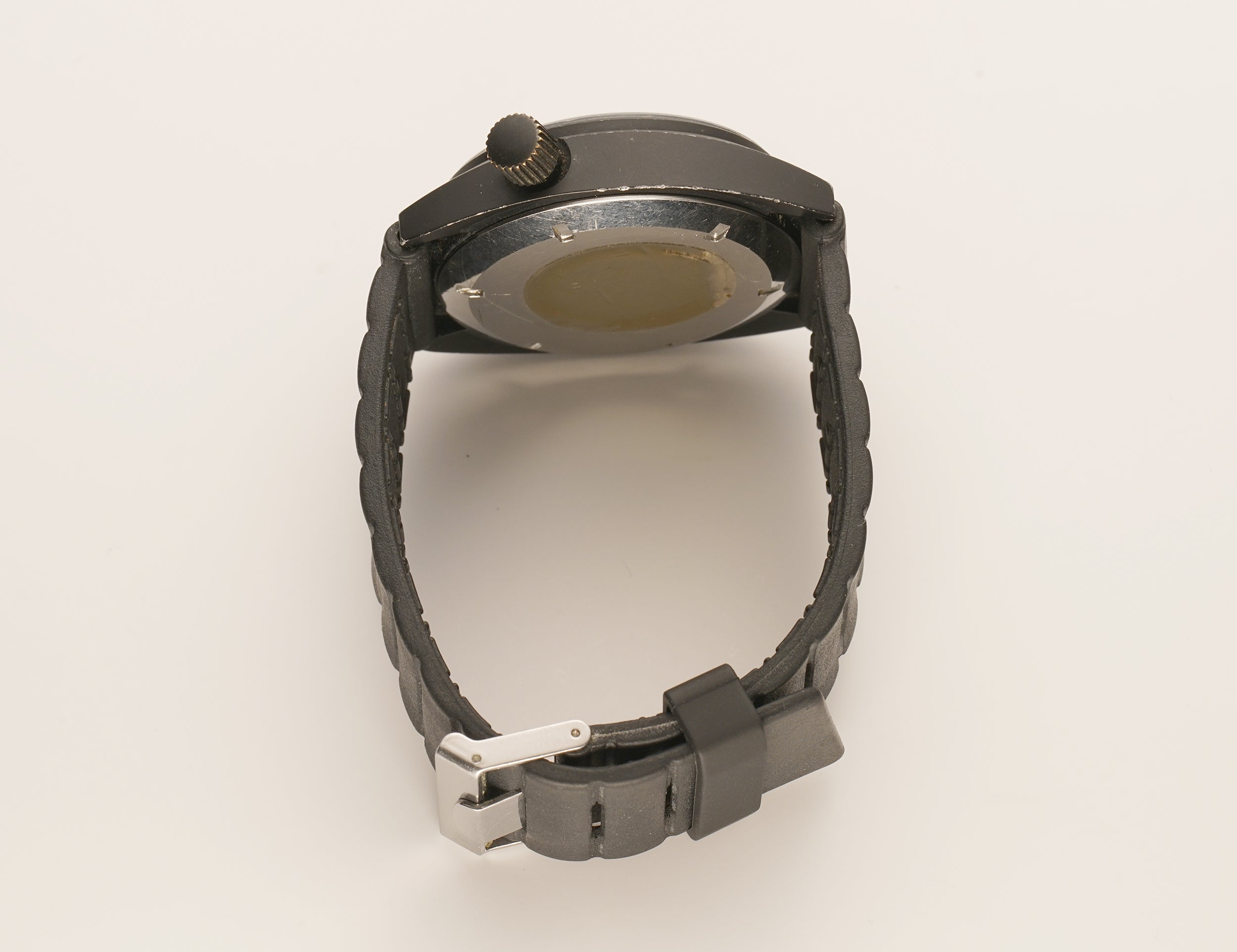 The case is made of a stainless steel core that features a black PVD coating and the same goes for the bezel as well as crown. As for the case back and tang buckle, those are of stainless steel. Securing the timepiece on the wrist is a black rubber strap (70% condition).